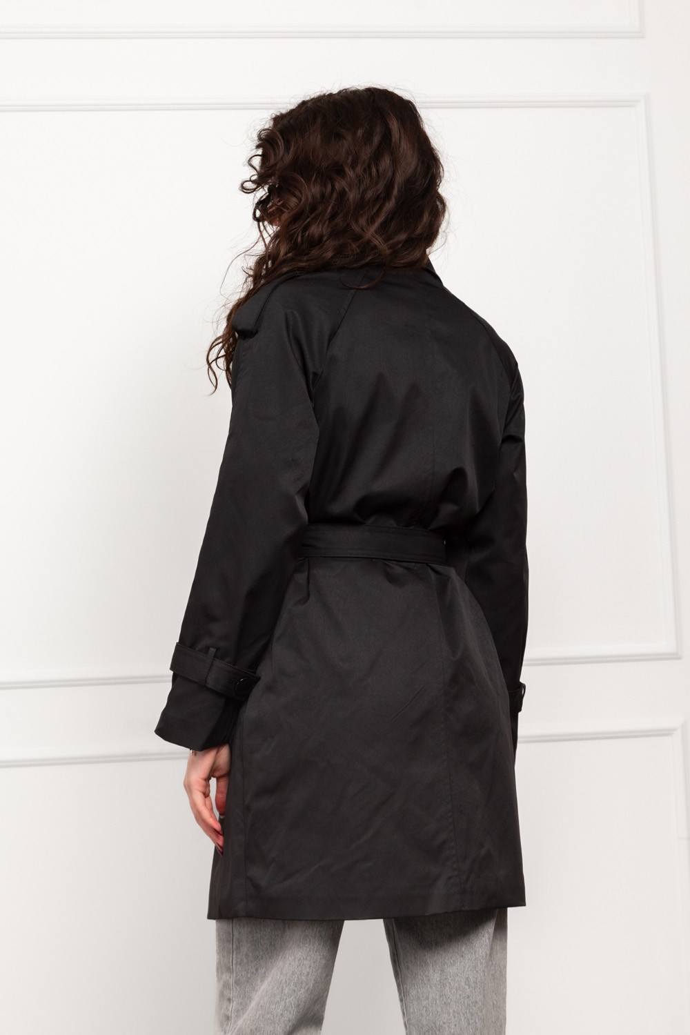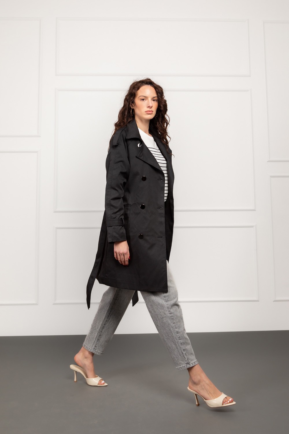 Crni klasični baloner s dvorednim kopčanjem i remenom u struku. Ovaj bezvremenski model oblikuje figuru, produljuje siluetu i daje chic dojam u svakoj kombinaciji. Ujedno je lagan, praktičan i idealan za prijelazne sezone kada želiš izgledati sređeno bez puno slojeva.