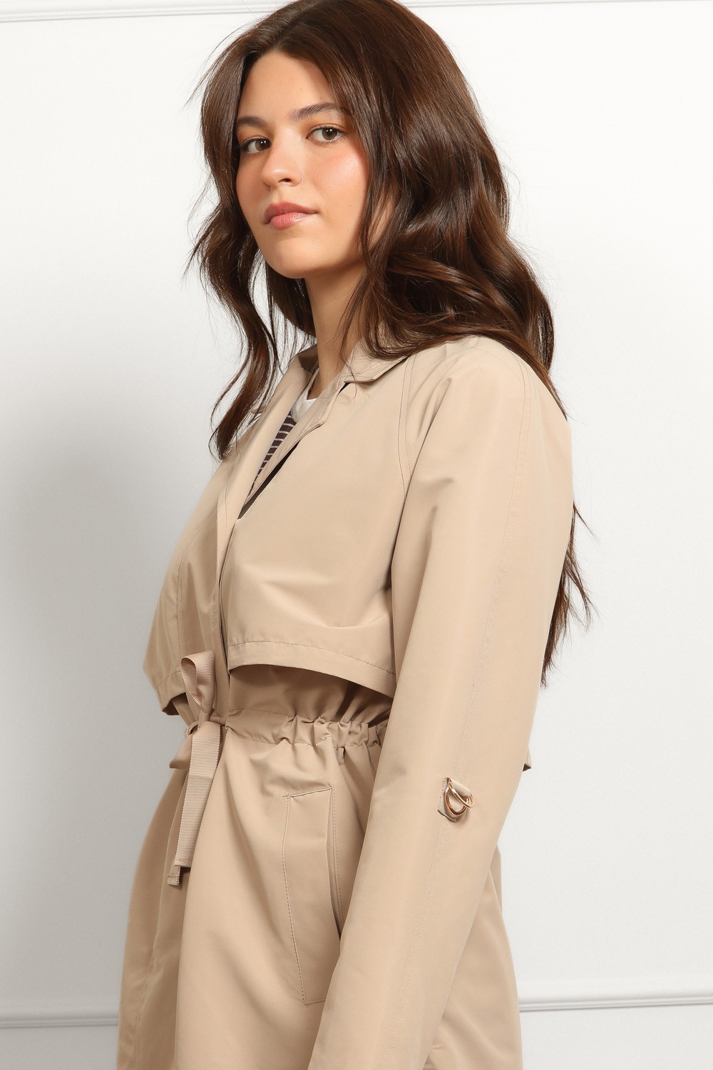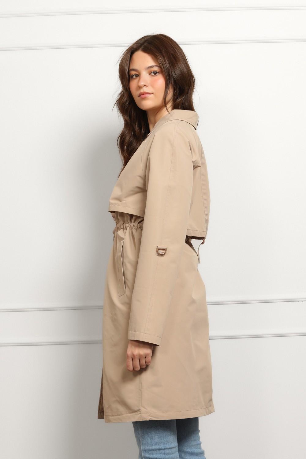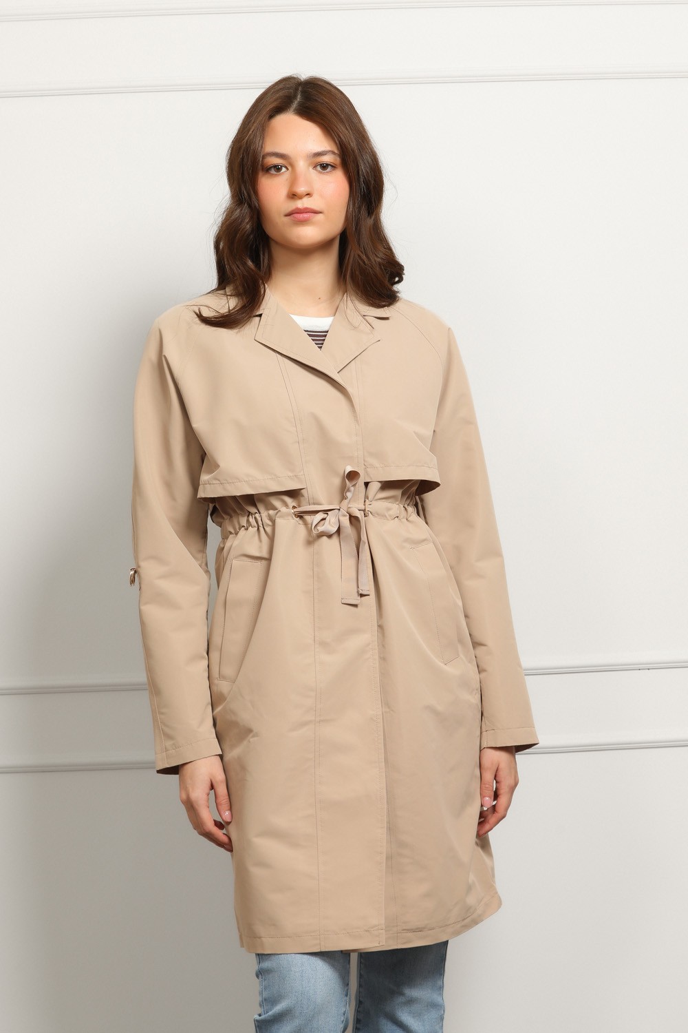 Lagani materijal čini ga idealnim prijelaznom jaknom za proljeće i jesen, a neutralna bež nijansa lako se kombinira.