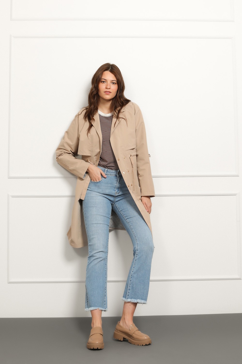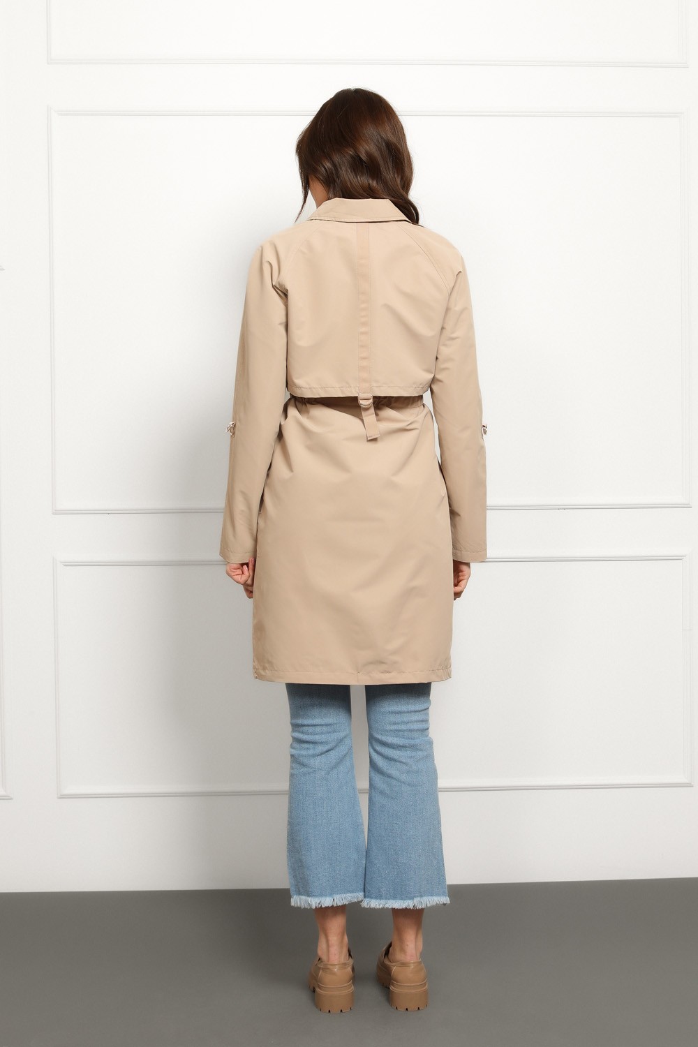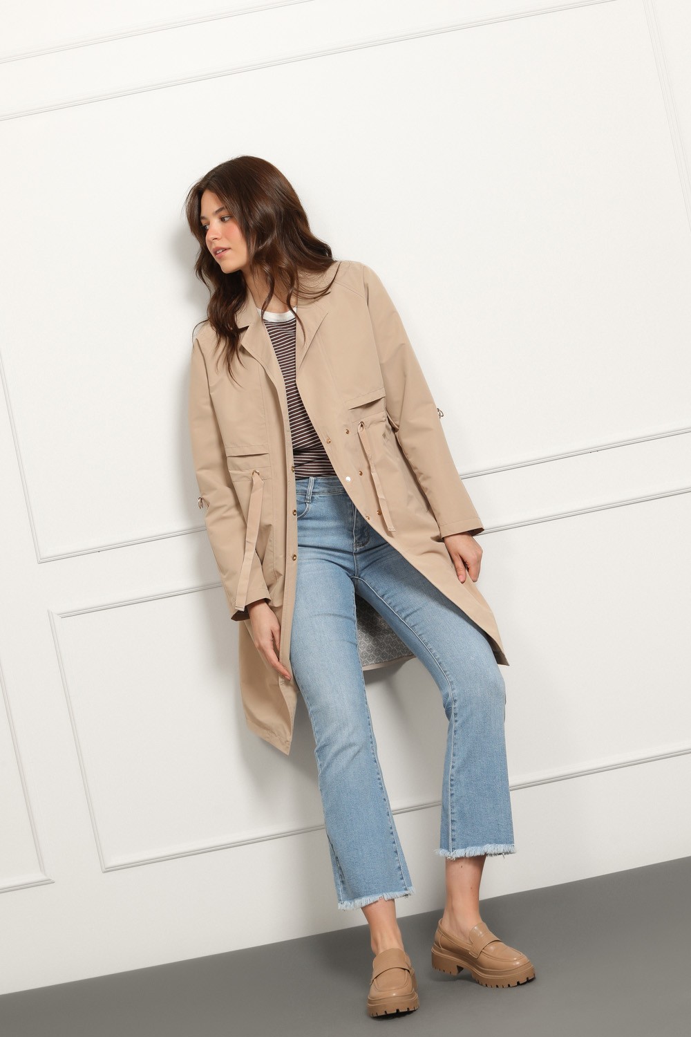 Lagani materijal čini ga idealnim prijelaznom jaknom za proljeće i jesen, a neutralna bež nijansa lako se kombinira.