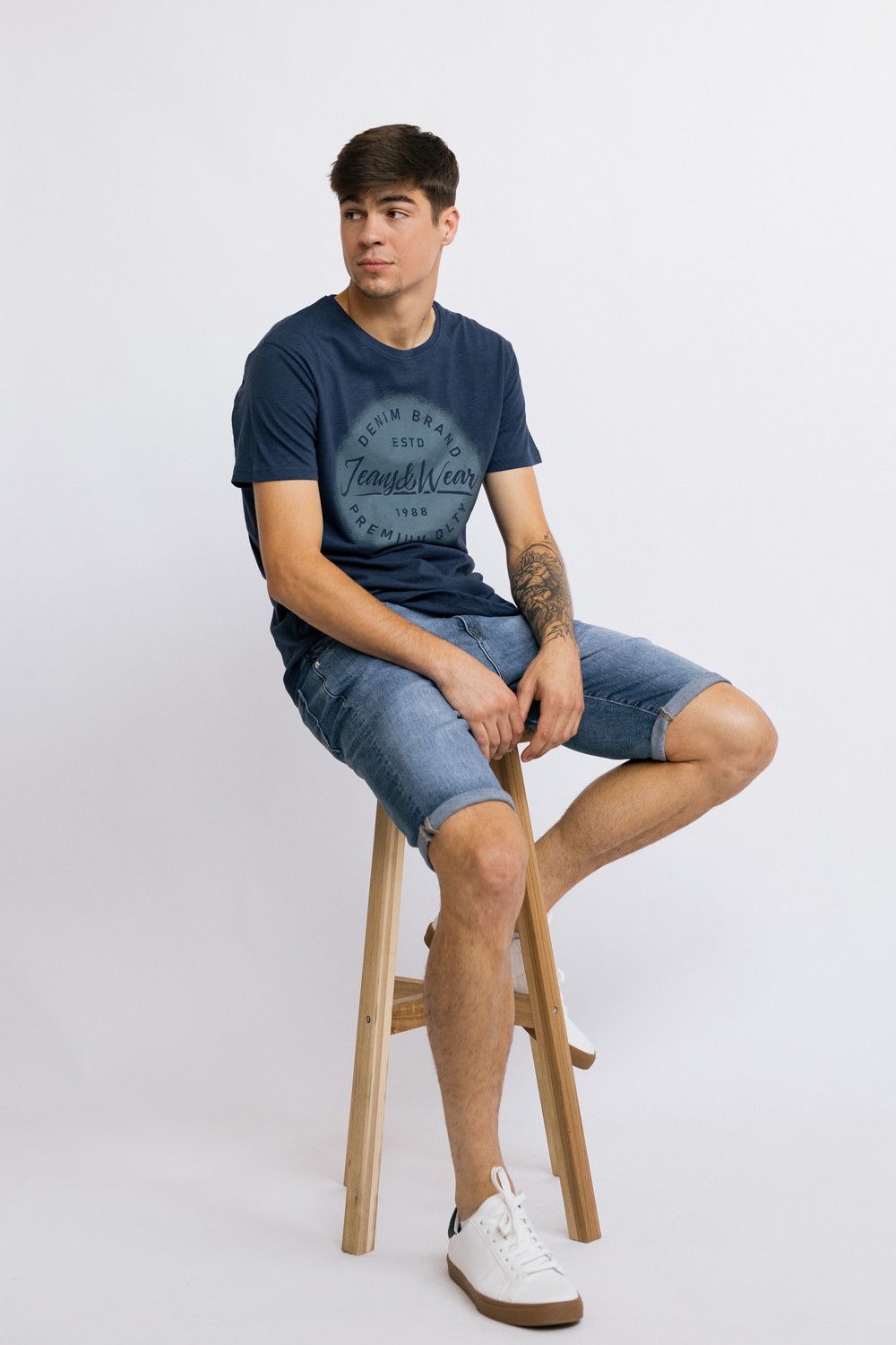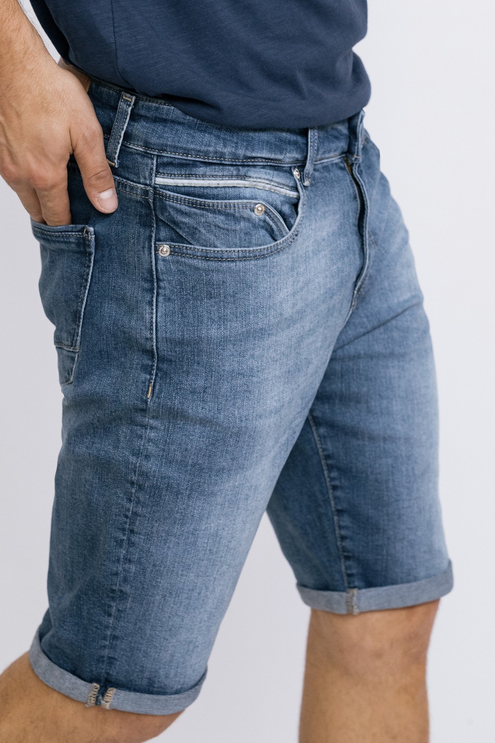 Kratke tamno plave traper muške hlače. Pet džepova, patentni zatvarač i gumb.- 97% PAMUK, 3% ELASTIN Model je visok 185cm i nosi veličinu S32..