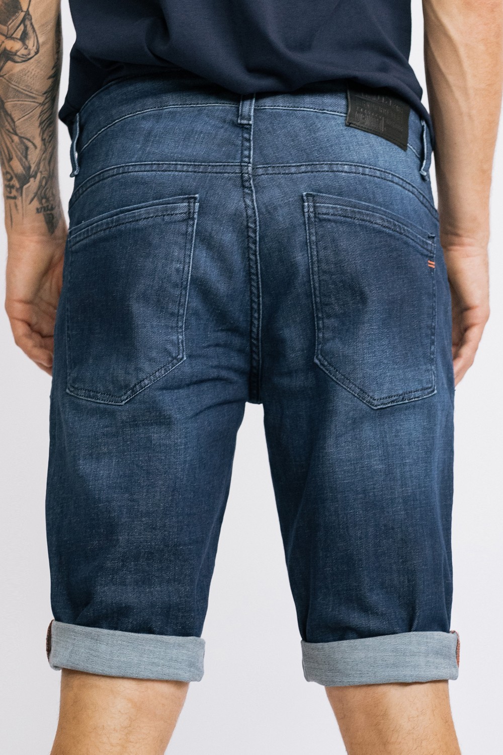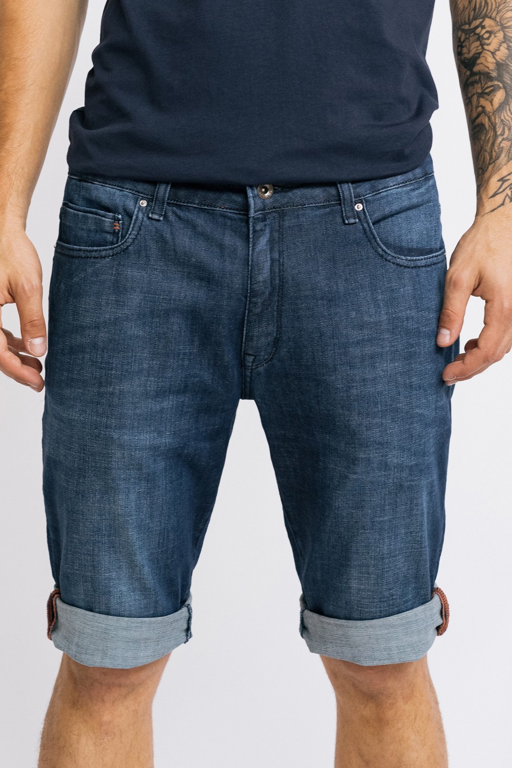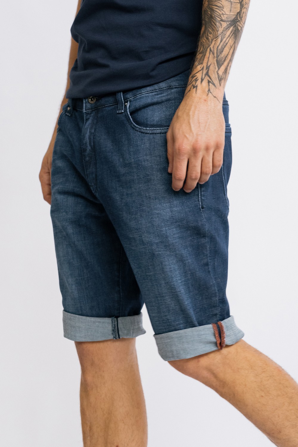 Traper tamno plave kratke hlače s džepovima, patentni zatvarač i gumb. Blago pranje sprijeda- 98% PAMUK , 2% ELASTINModel je visok 185cm i nosi veličinu S31..