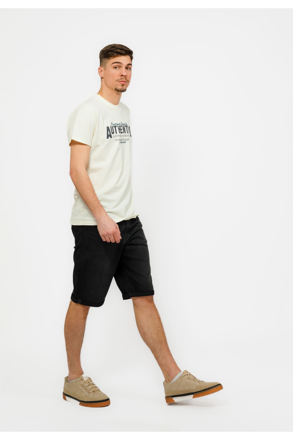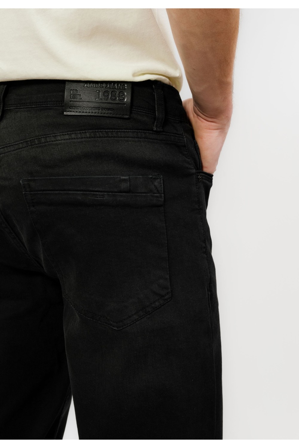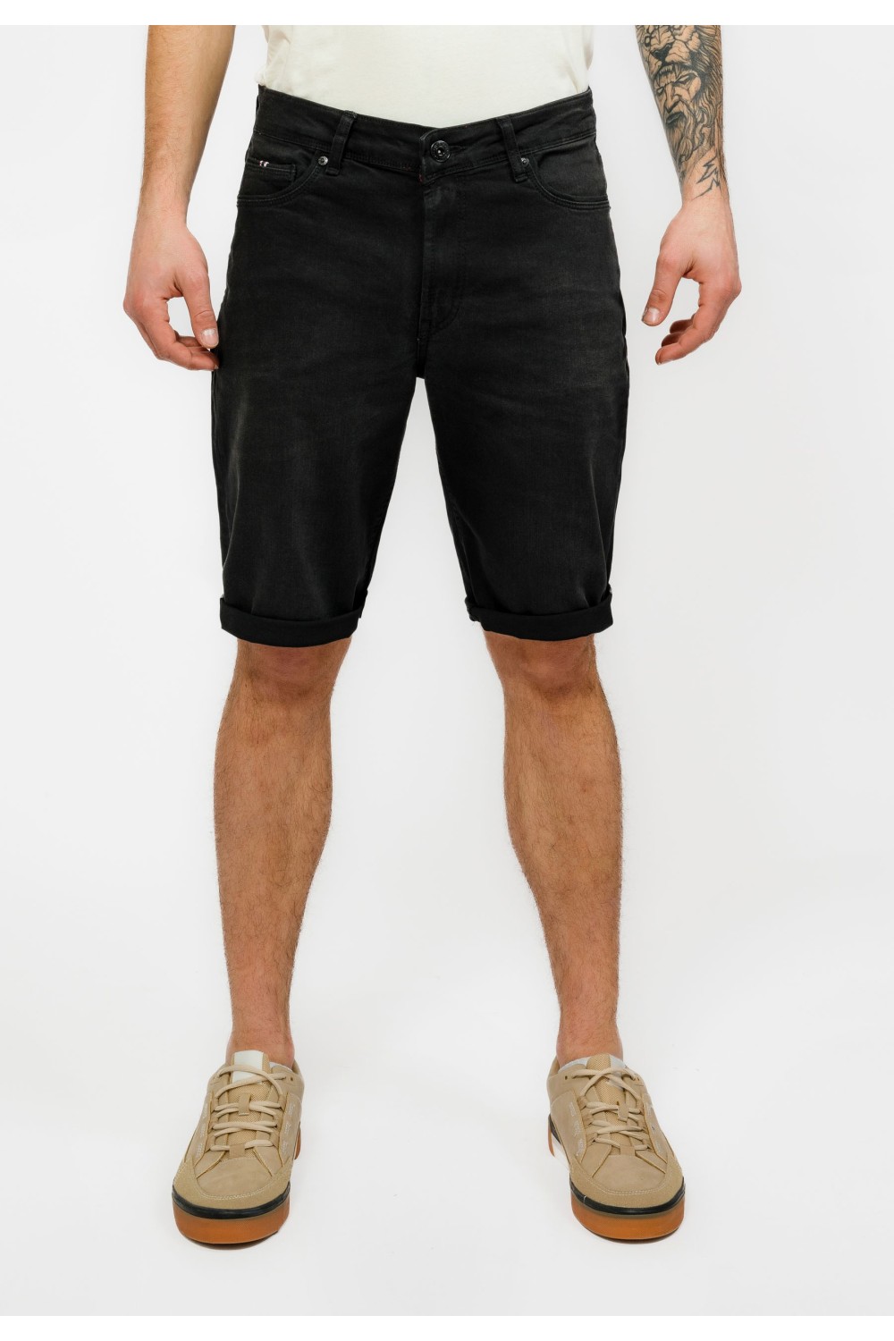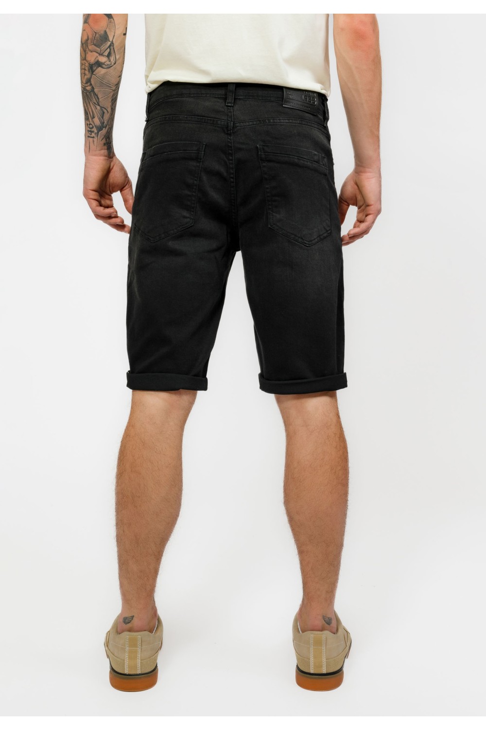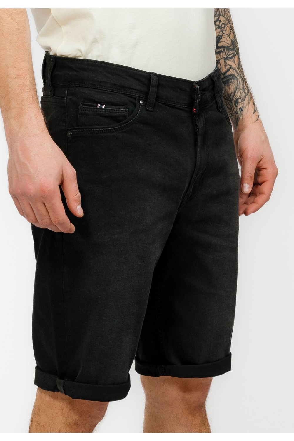 Kratke crne traper muške hlače. Blago trganje sprijeda. Pet džepova, patentni zatvarač i gumb.- 98% PAMUK, 1% ELASTINModel je visok 185cm i nosi veličinu S32..
