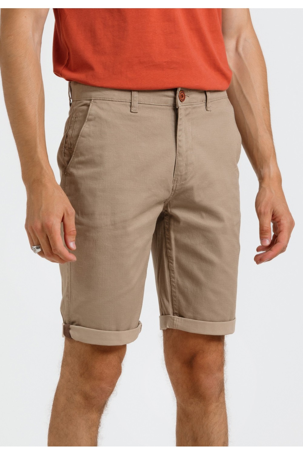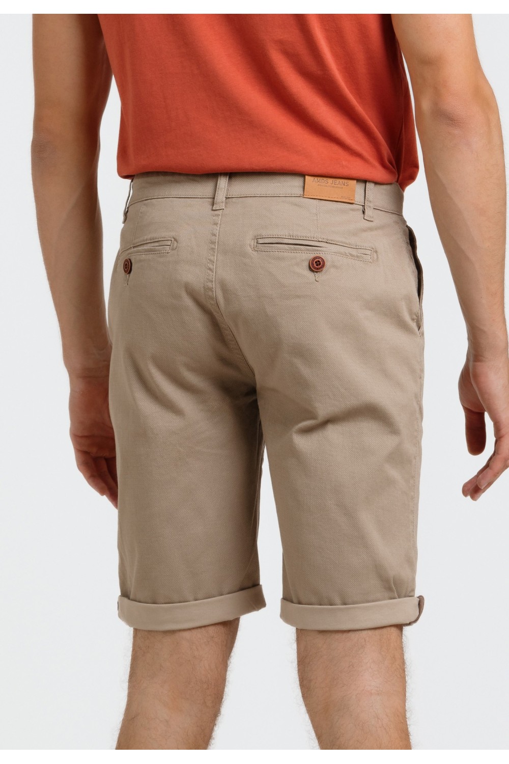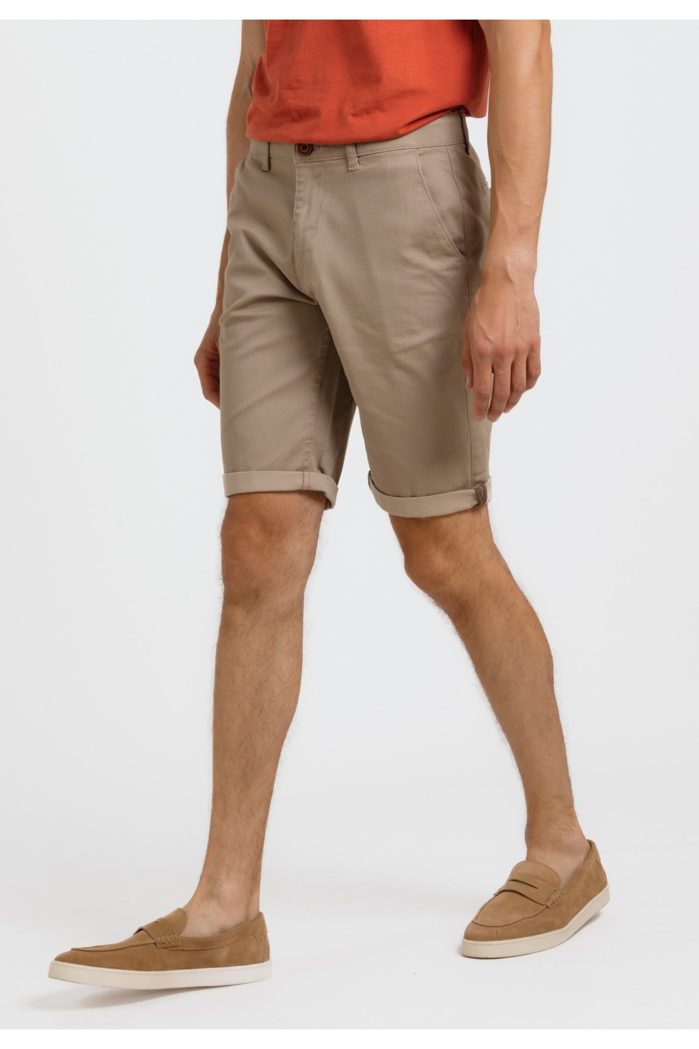 Keper bež kratke hlače. Podavinute nogavice sa detaljima u obliku zastavice na rubovima. Prednji džepovi sa detaljem metalne pločice na desnoj strani. Kopčanje sprijeda patent zatvaračem i g..