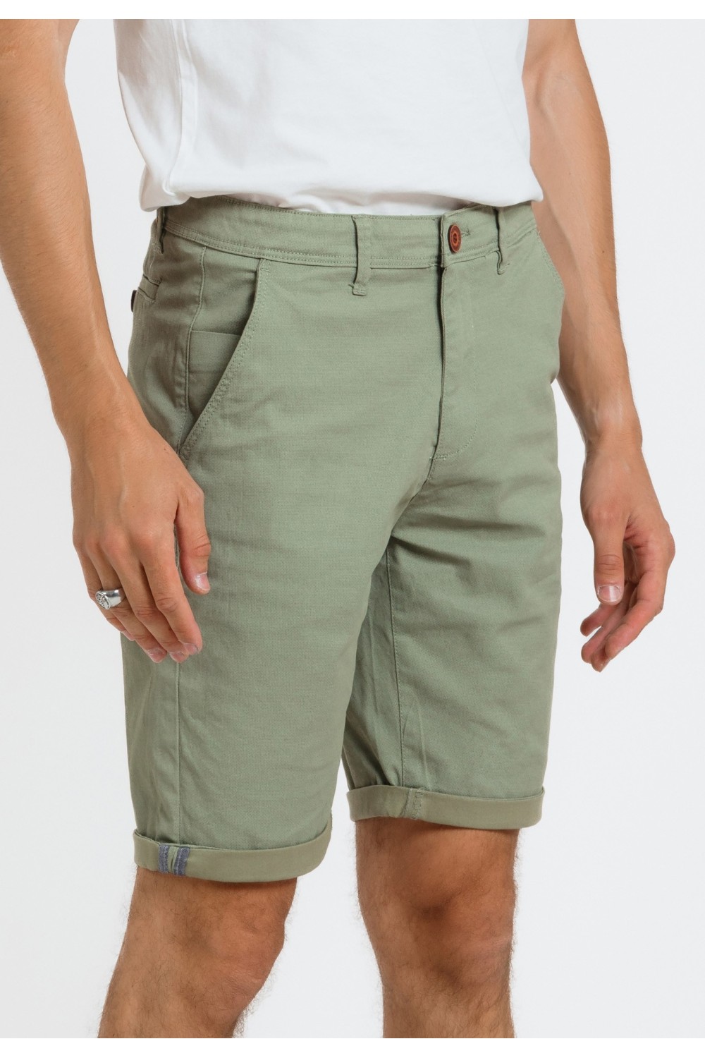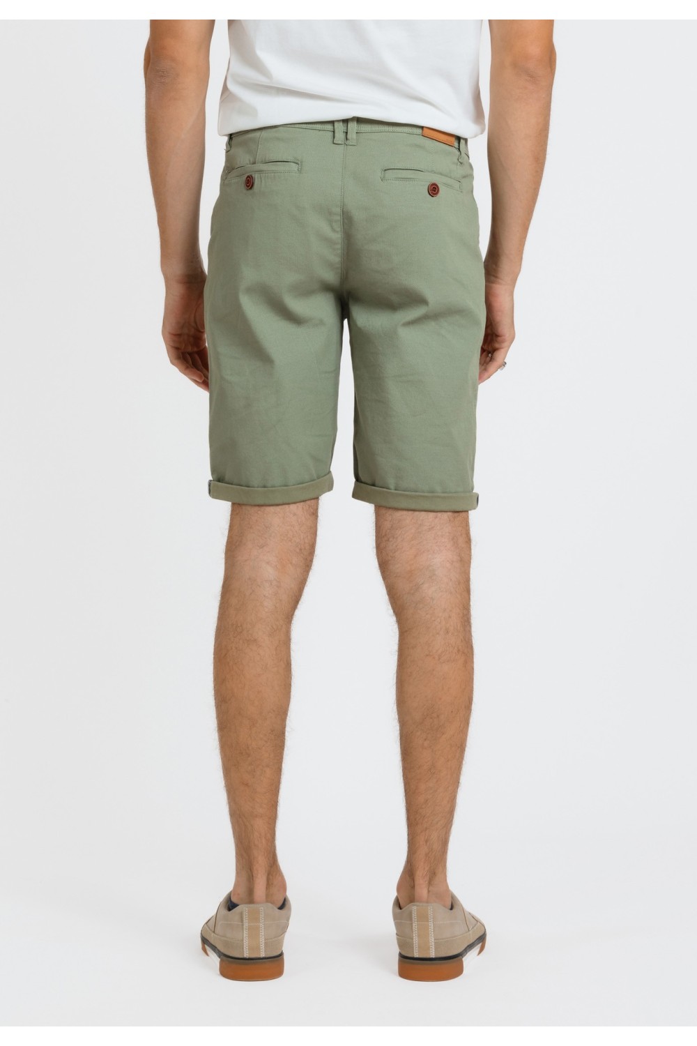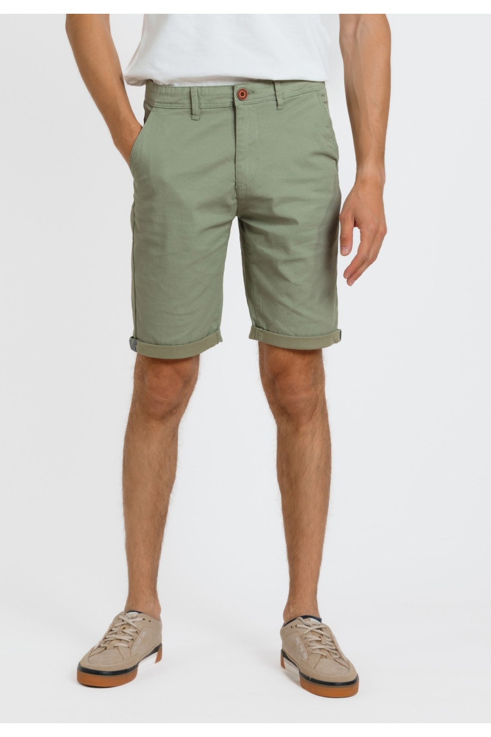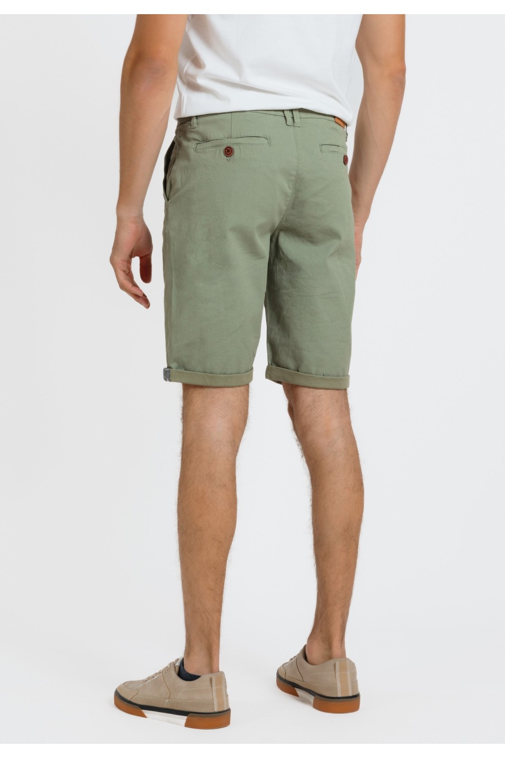 Maslinasto zelene bermude, s bočnim džepovima na preklop i vezicama za regulaciju. Sprijeda ušitci na nogavicama. Prednji, bočni te stražnji džepovi na preklop. Ušitci za remen. Kopčanje spr..