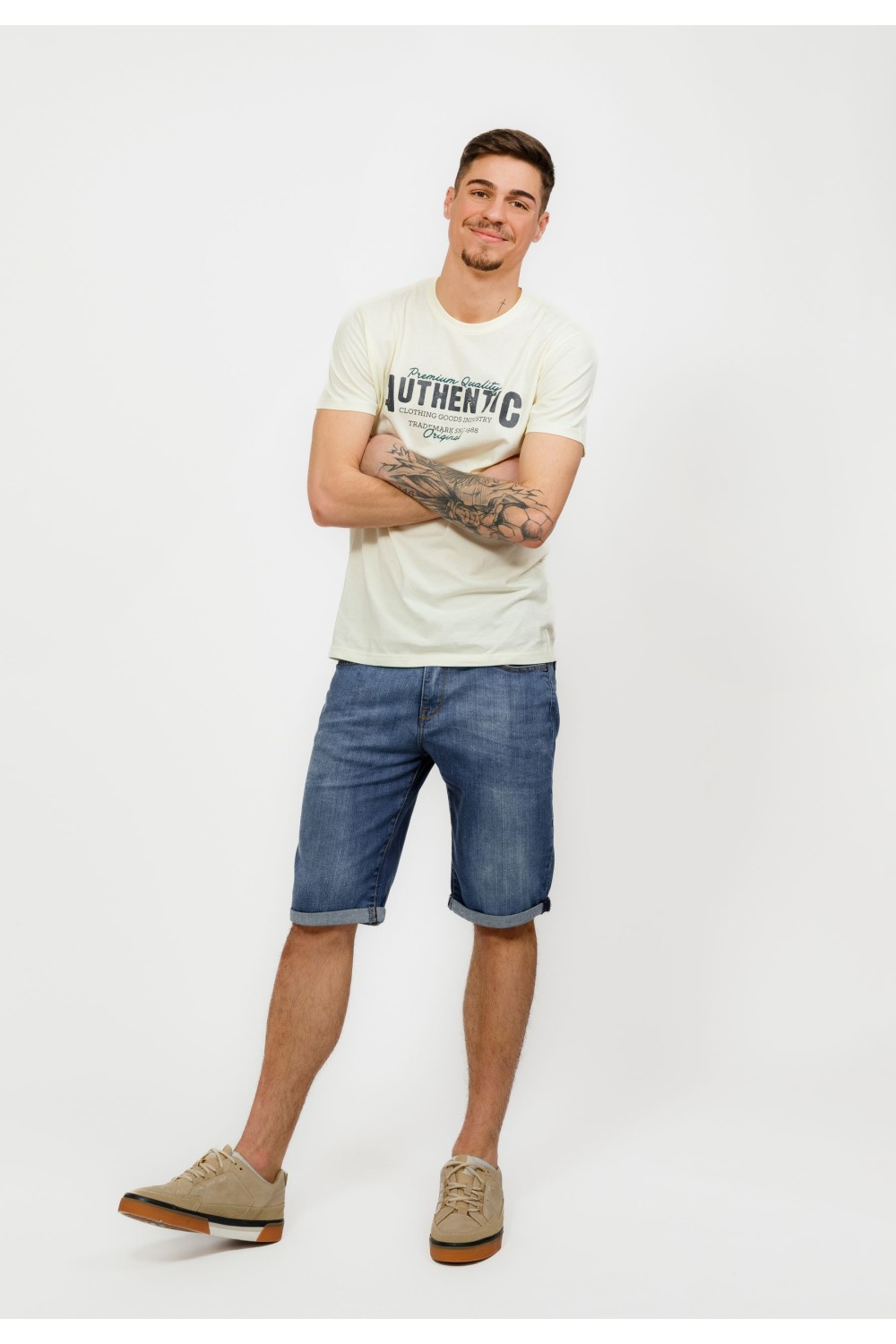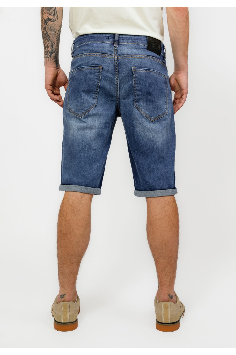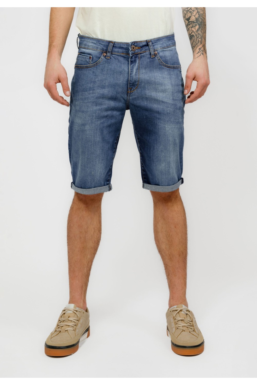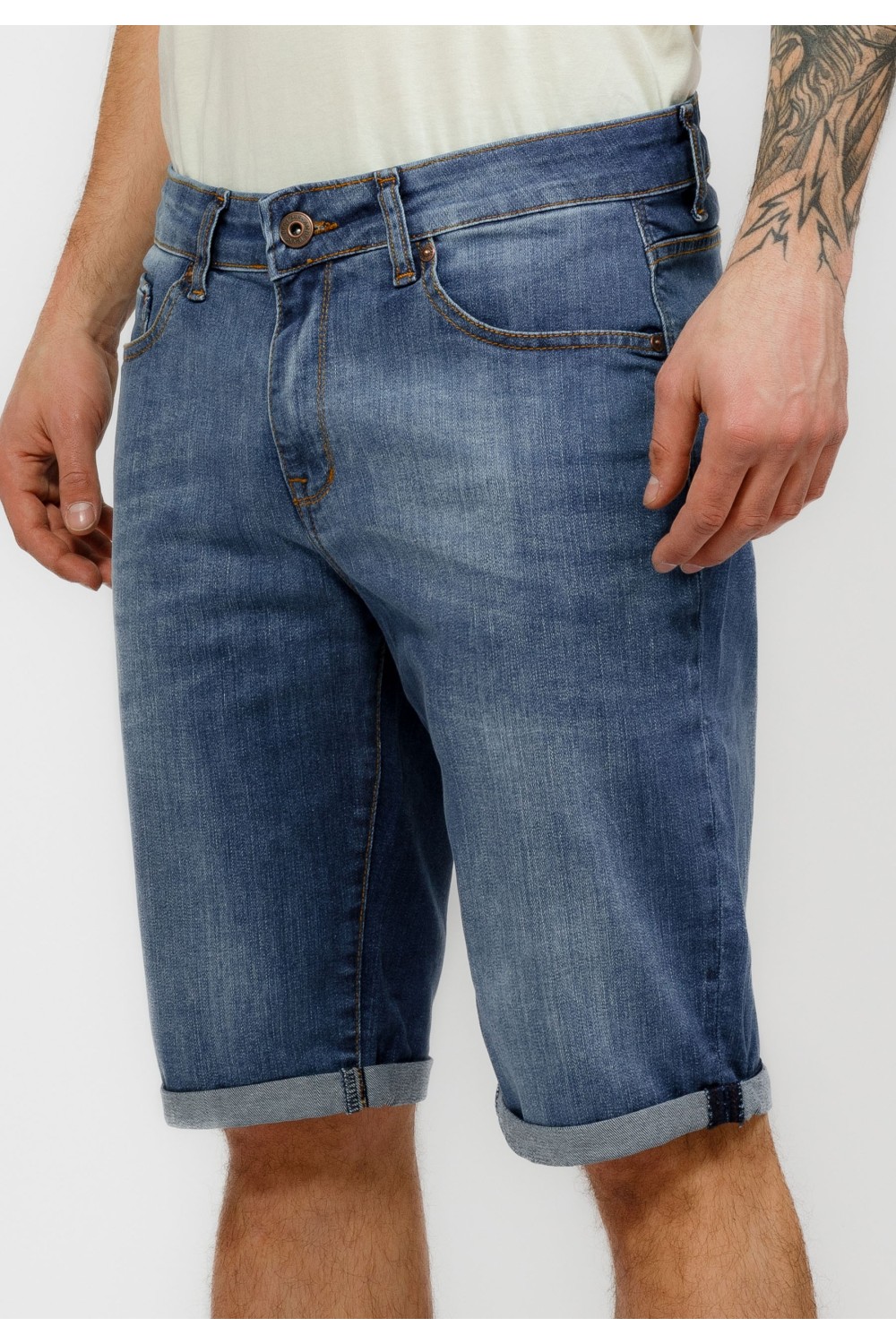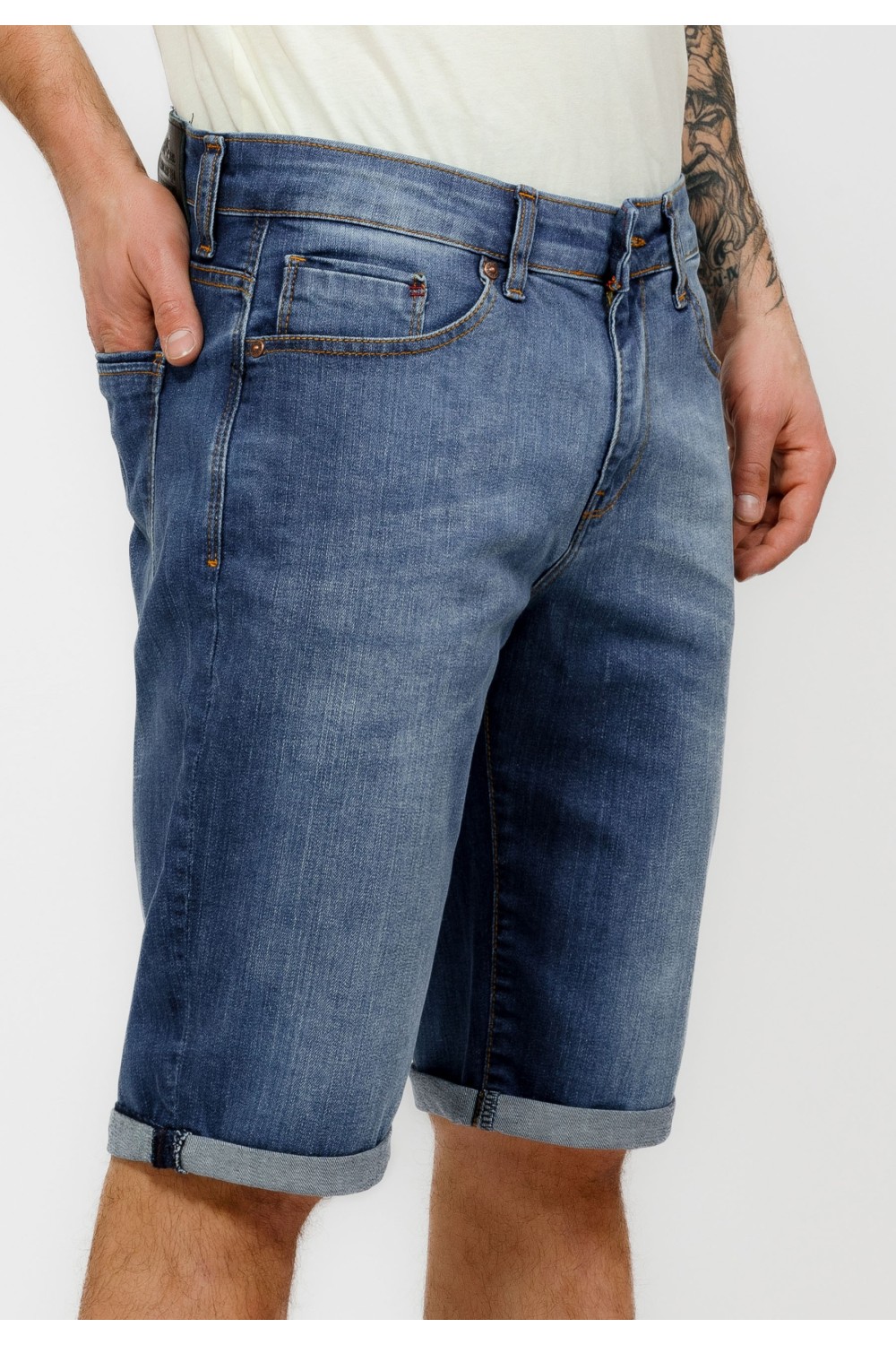 Traper bermude sa svijetlim pranjem sprijeda. Podavinute nogavice. Pet džepova, te kopčanje sprijeda patent zatvaračem i gumbom. -98% PAMUK, 2% ELASTINModel je visok 194 cm i nosi veličinu S..