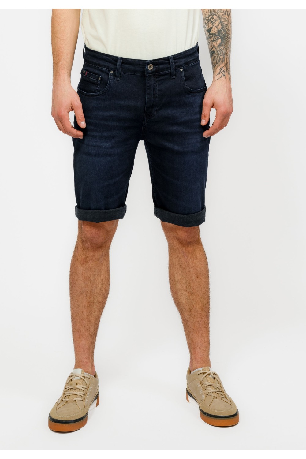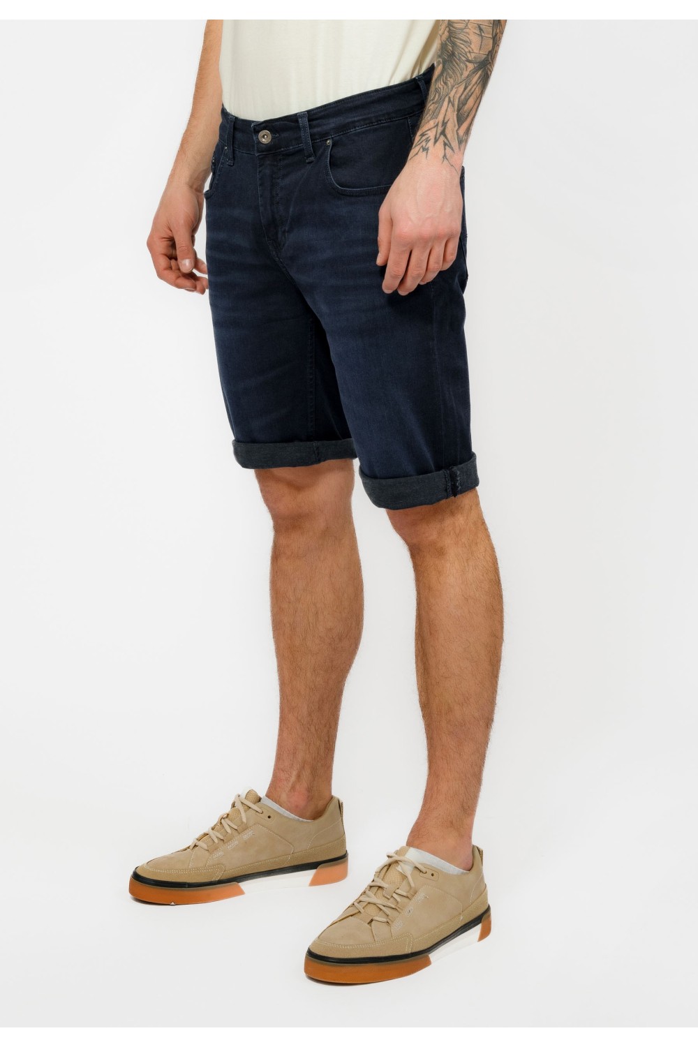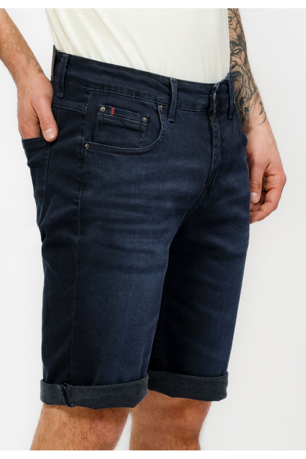 Traper bermude sa svijetlim pranjem sprijeda. Podavinute nogavice sa detaljem zastavice na rubovima. Pet džepova, te kopčanje sprijeda patent zatvaračem i gumbom. -99% PAMUK, 1% ELASTINModel..