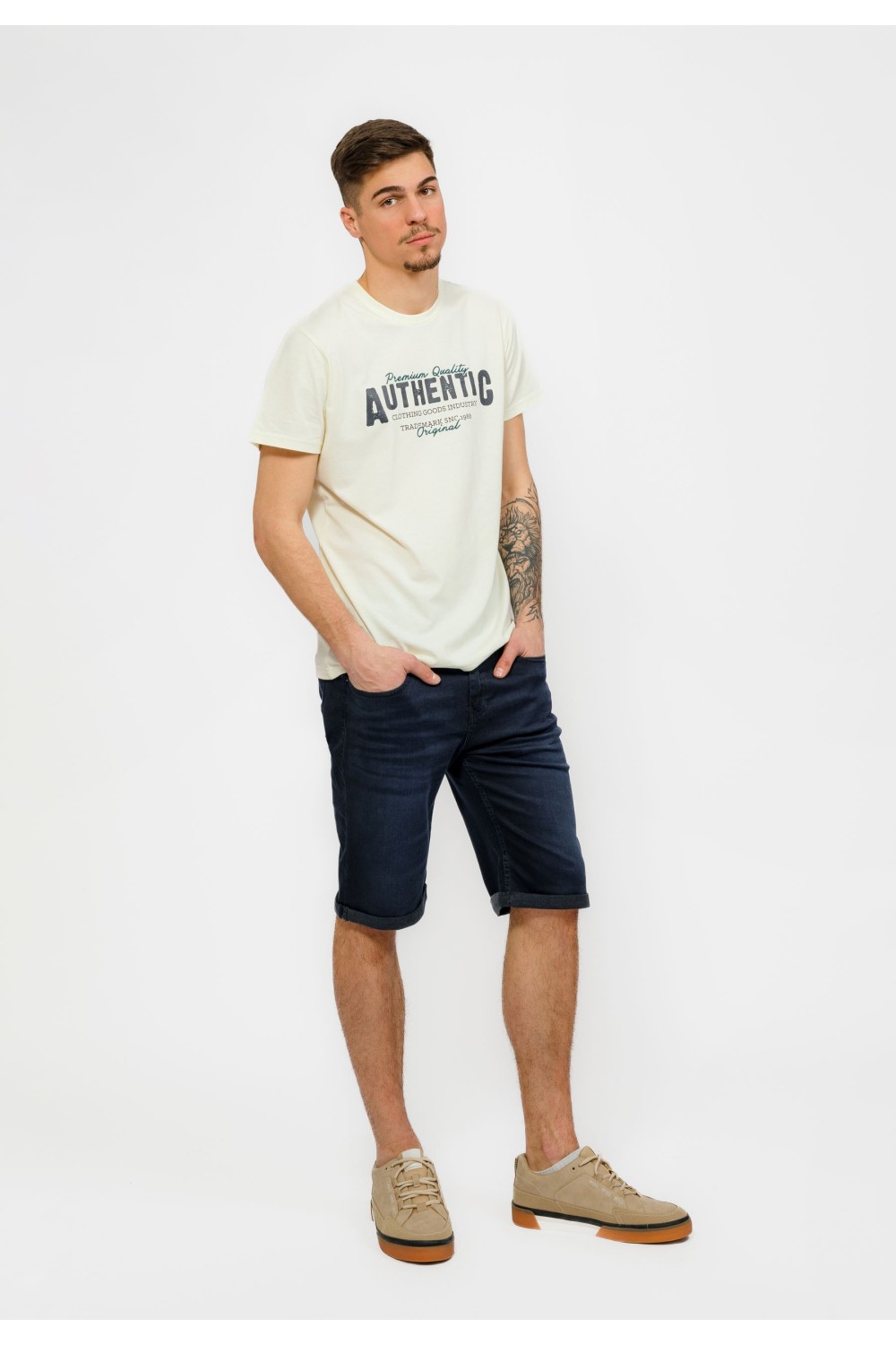 Keper bež kratke hlače. Podavinute nogavice sa detaljima u obliku zastavice na rubovima. Prednji džepovi sa detaljem metalne pločice na desnoj strani. Kopčanje sprijeda patent zatvaračem i g..