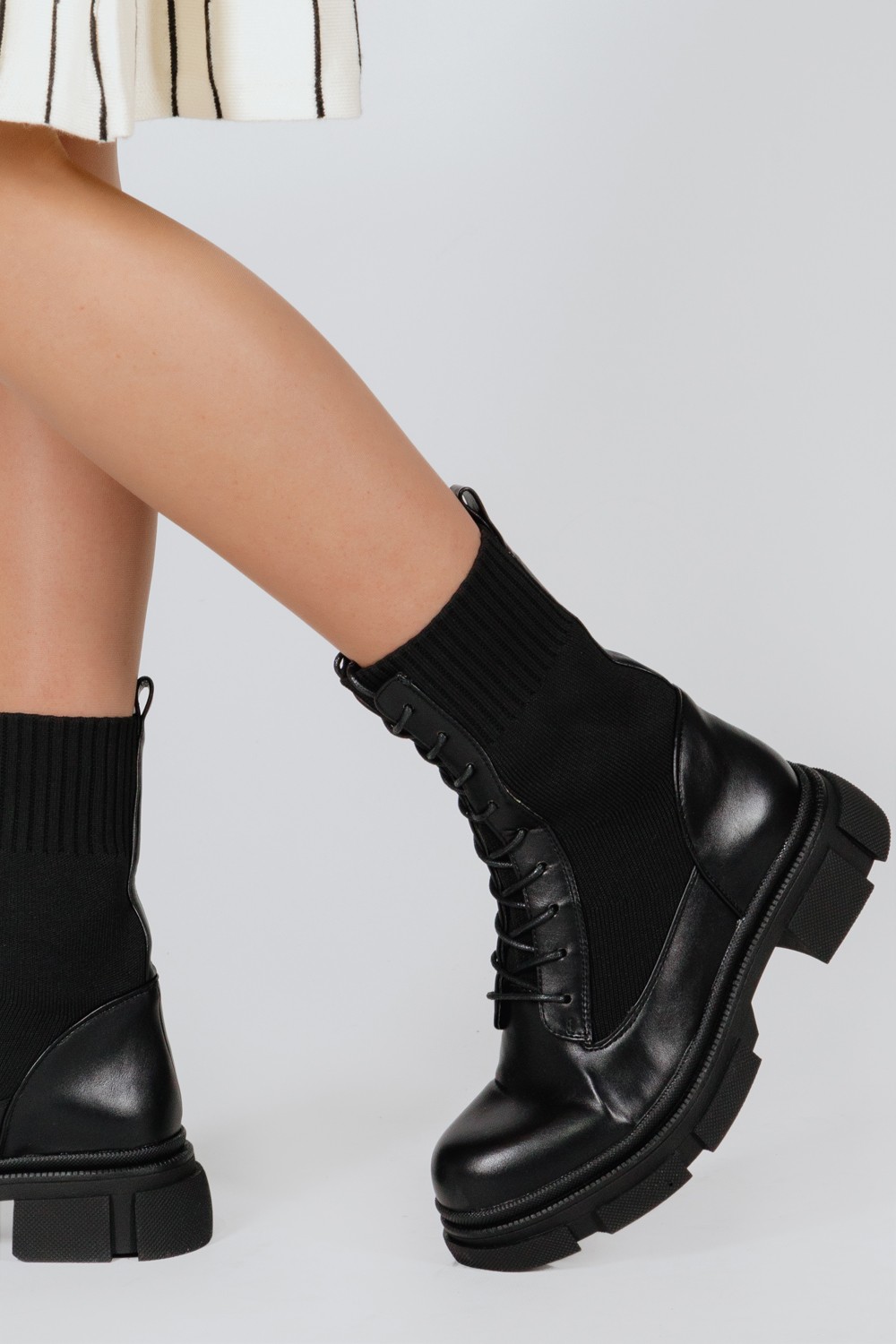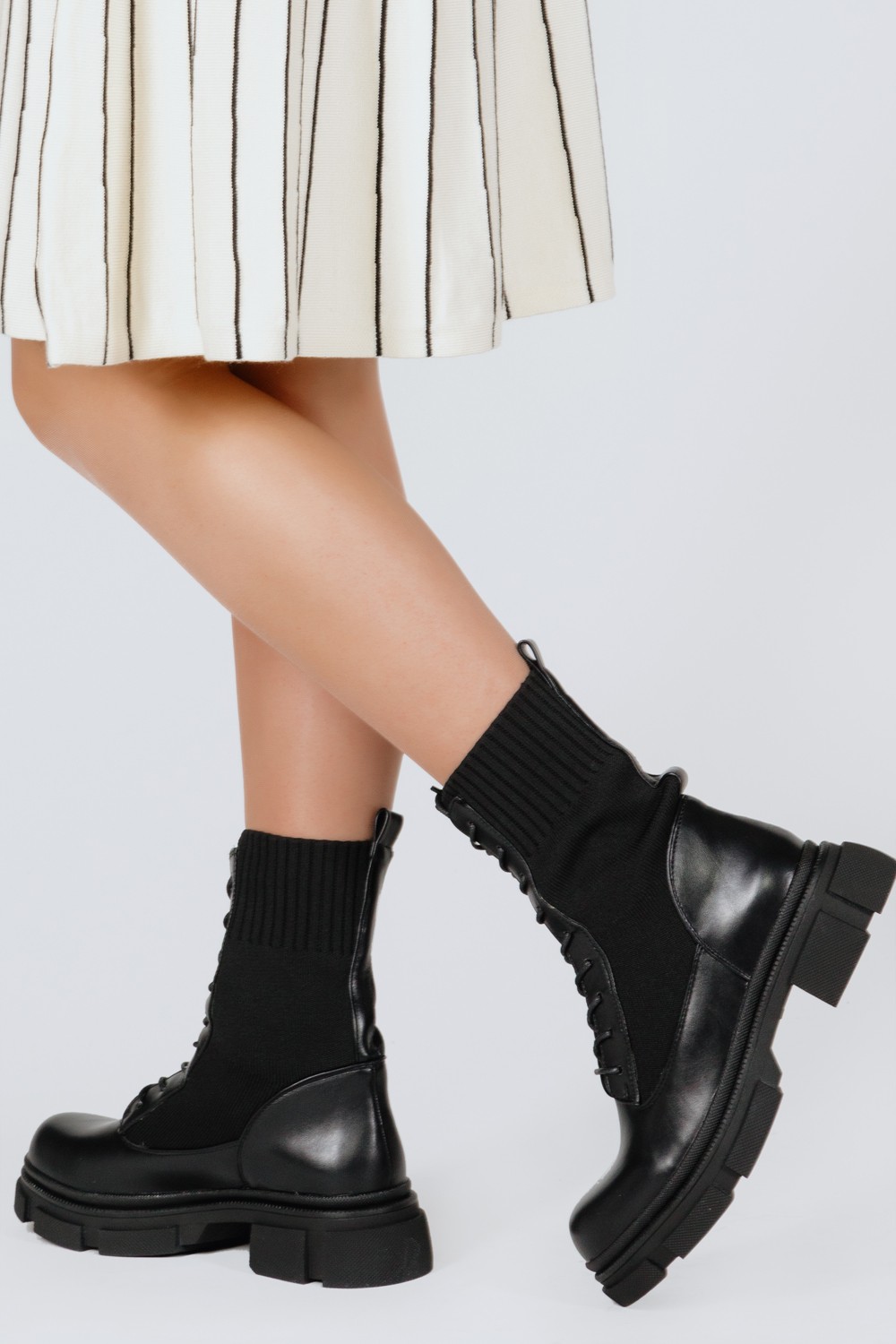 Čizme od umjetne kože na vezanje s dodatkom od pletiva u bočnom dijelu.