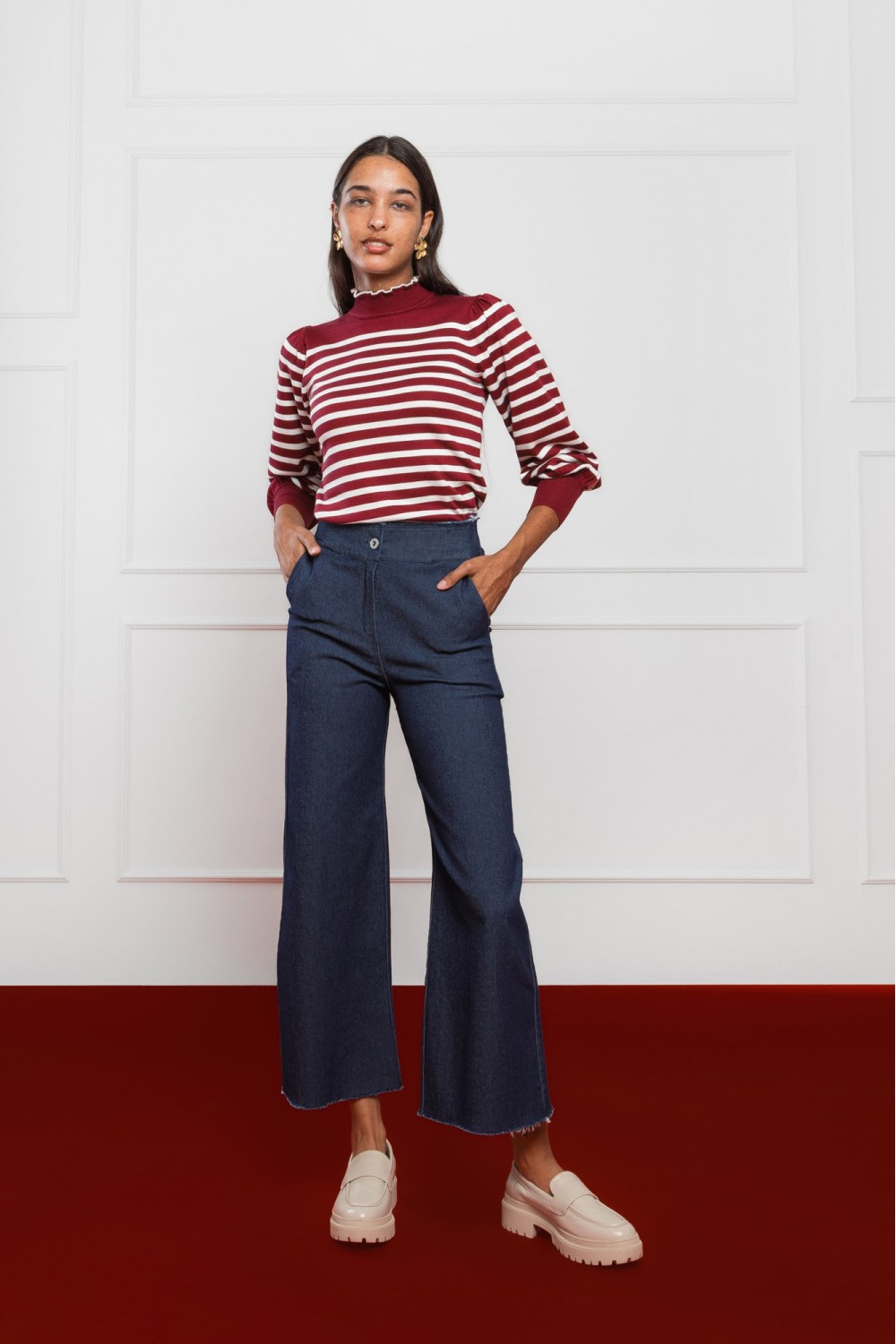 Traperice s visokim strukom i ukrasnim zlatnim gumbima. Tamnoplavi traper vizualno izdužuje figuru, dok elastični dodatak osigurava udobnost pri nošenju. Idealne su za kombiniranje s košuljo..