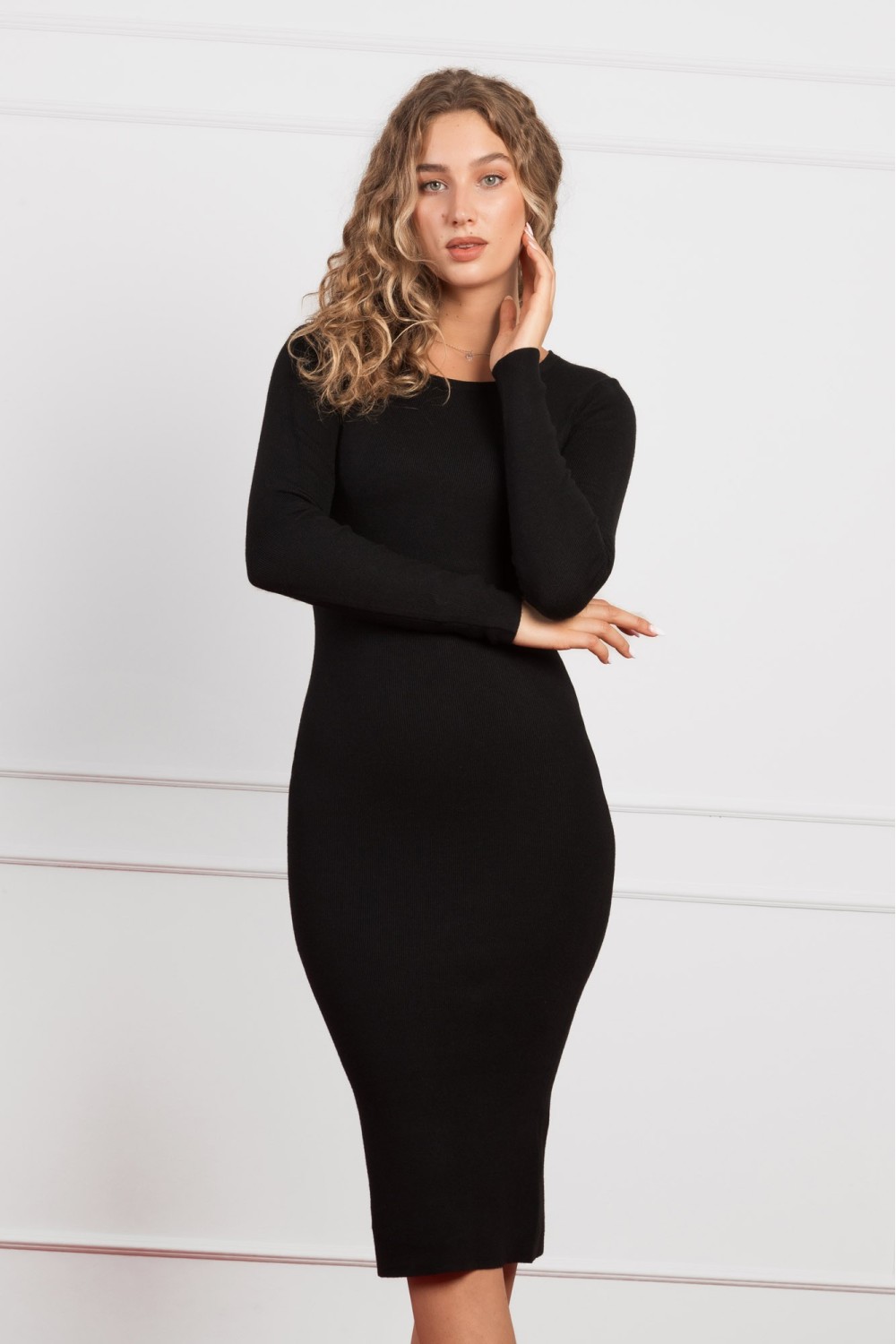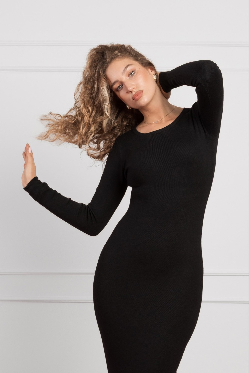 Elegantna crna midi haljina s dugim rukavima – komad koji uvijek moraš imati u ormaru. Model s preklopom naglašava figuru i pruža ženstven, sofisticiran izgled. Izrađena od rastezljivog mate..