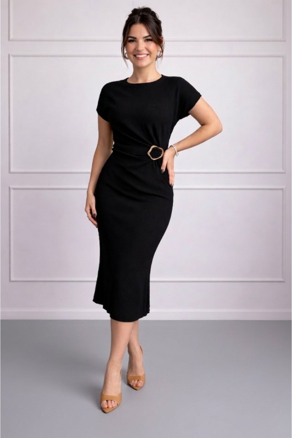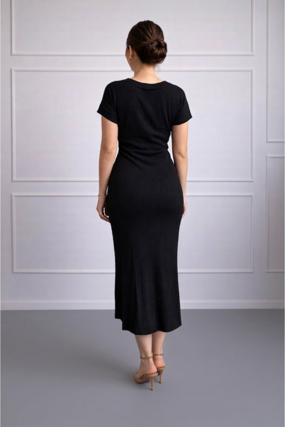 Elegantna crna midi haljina s dugim rukavima – komad koji uvijek moraš imati u ormaru. Model s preklopom naglašava figuru i pruža ženstven, sofisticiran izgled. Izrađena od rastezljivog mate..
