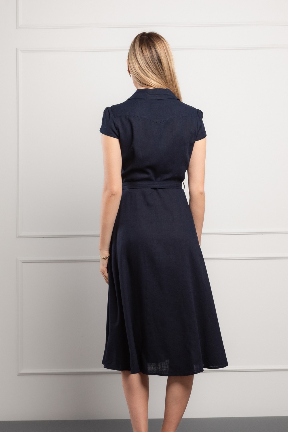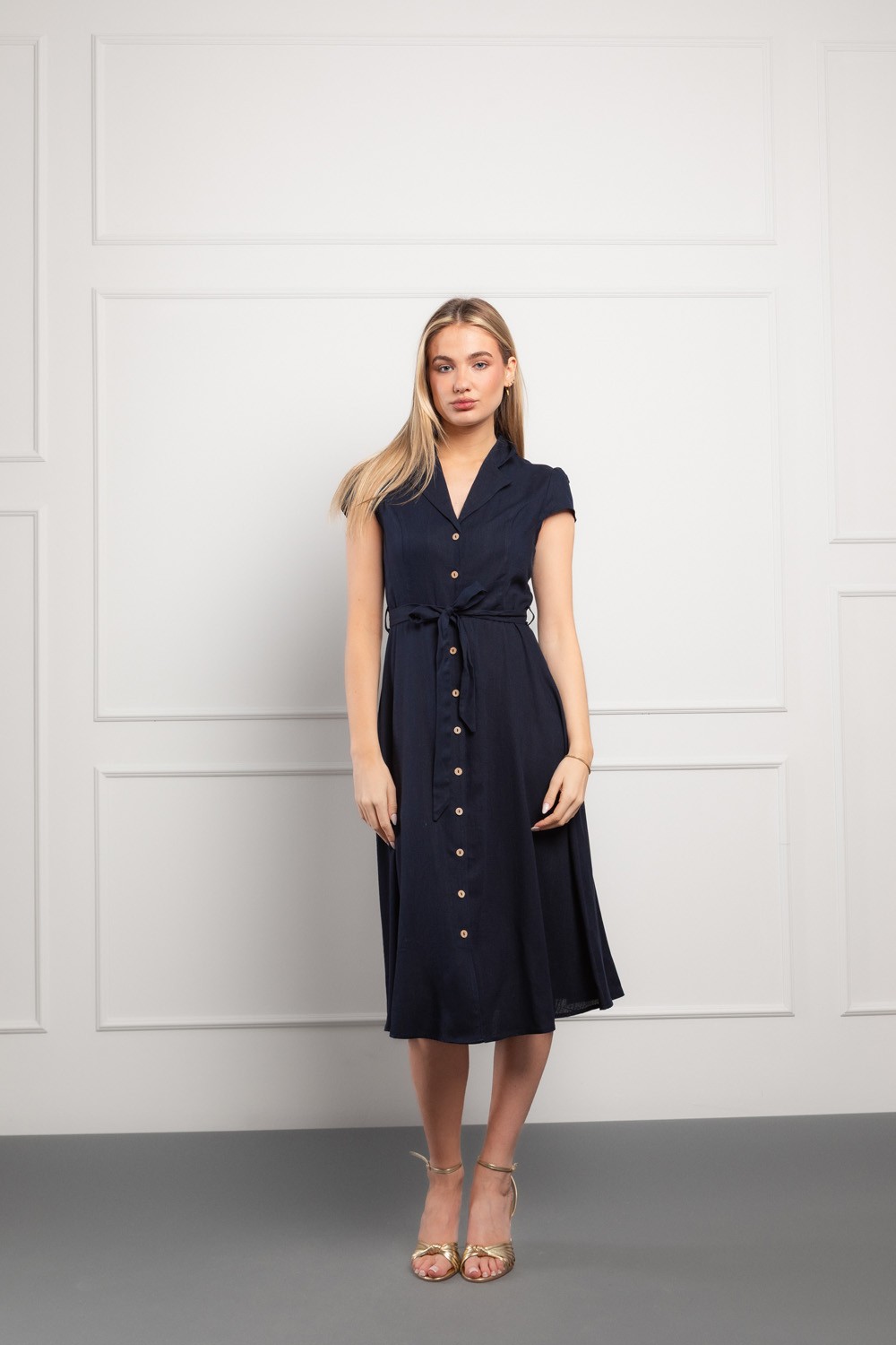 Midi haljina bez rukava u svijetloj nijansi s kontrastnim crnim točkama donosi spoj klasike i ženstvenosti. Košulja kroj s ovratnikom i kopčanjem cijelom dužinom daje joj profinjen izgled. L..