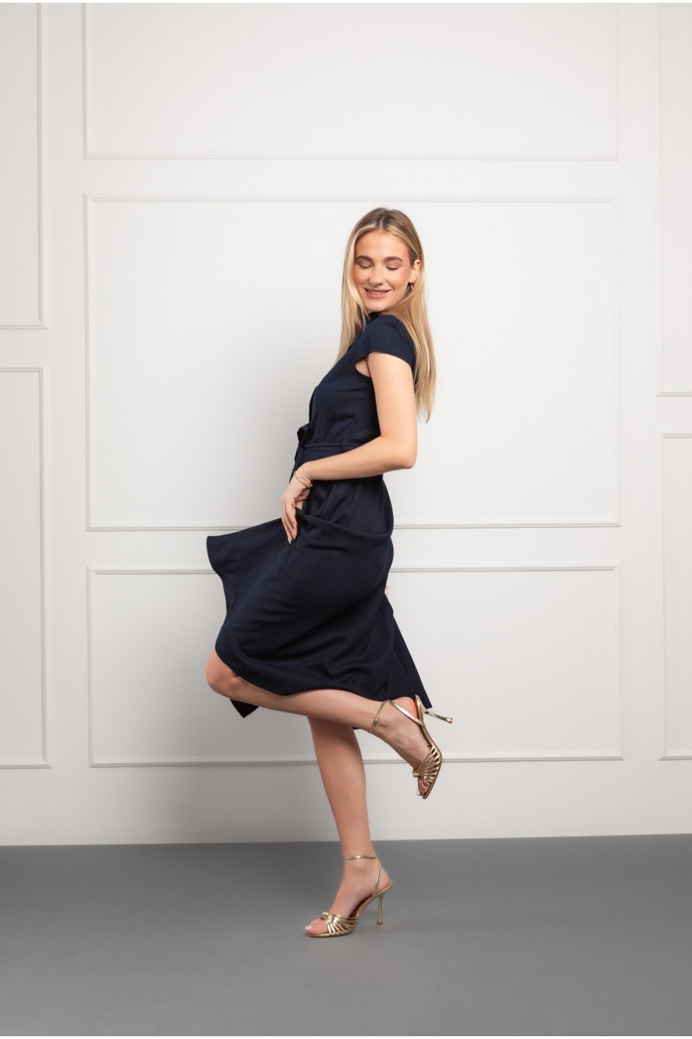 Elegantna haljina s cvjetnim uzorkom na zelenoj podlozi donosi svježinu i ženstvenost u svaki ormar. Model na preklop naglašava struk uz pojas od istog materijala, stvarajući laskav i romant..
