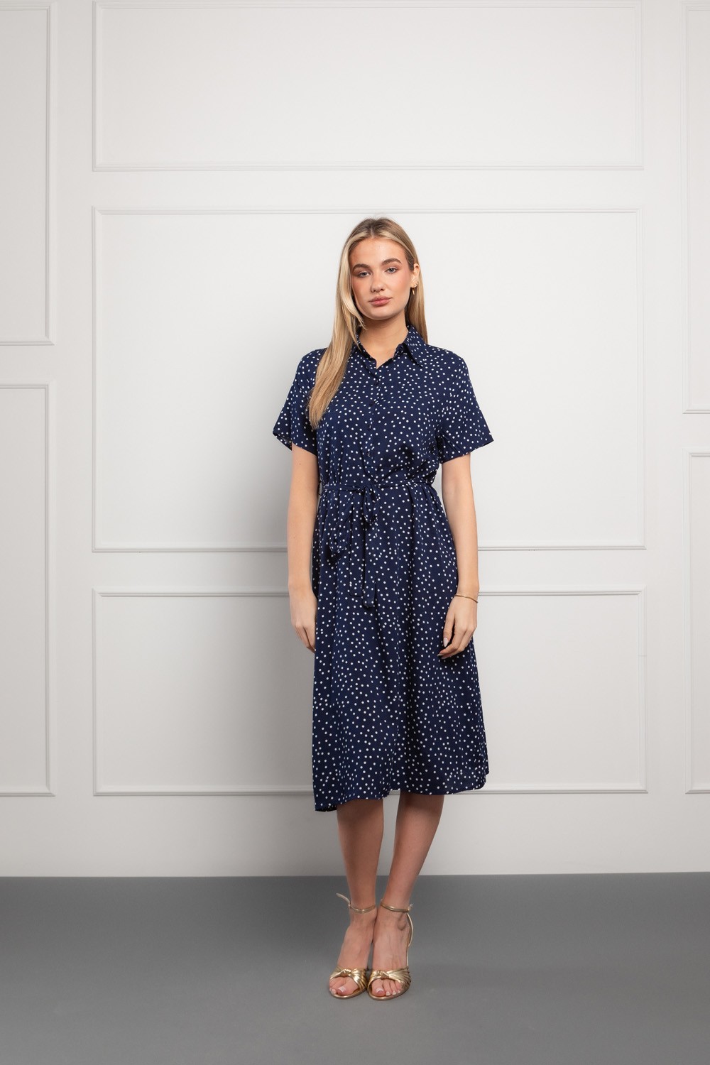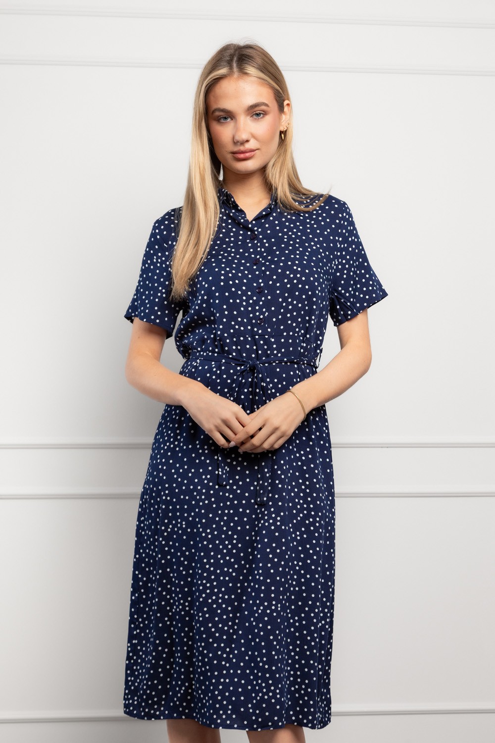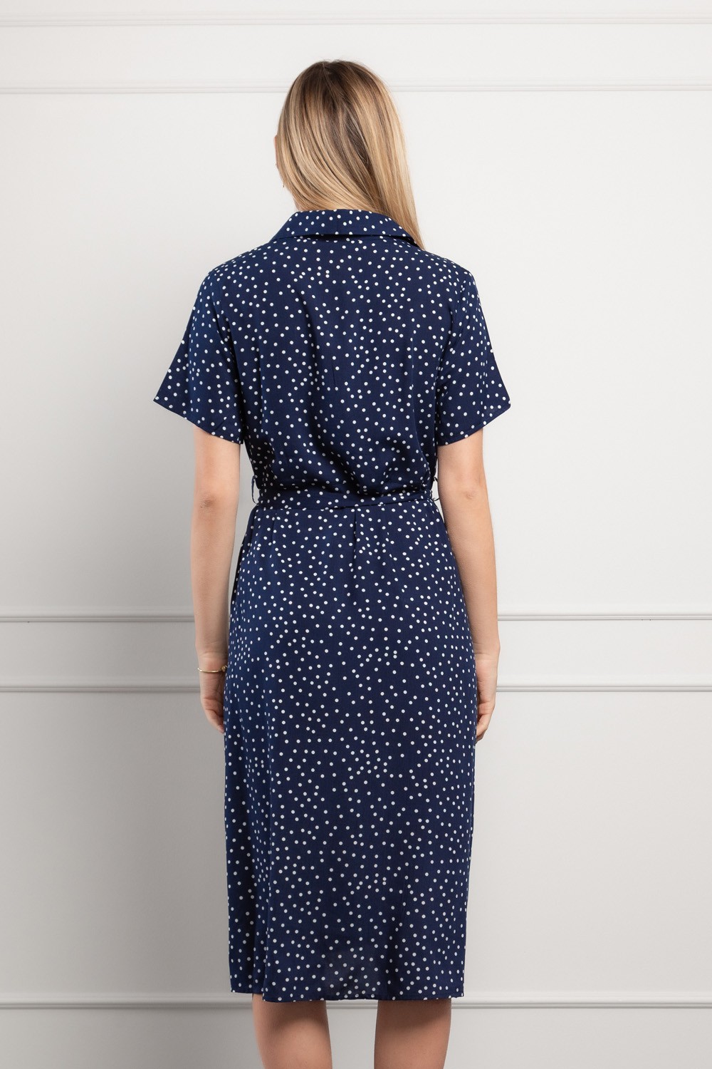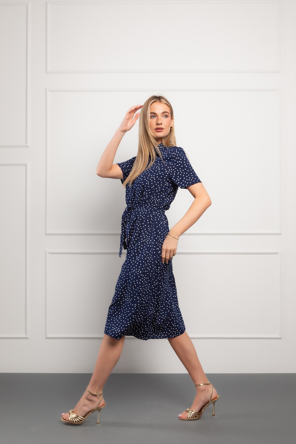 Ženstvena midi haljina s klasičnim točkastim uzorkom koja donosi bezvremensku eleganciju u svakodnevne kombinacije. Izrađena od laganog i ugodnog materijala, idealna je za toplije dane jer pruža osjećaj prozračnosti i udobnosti.