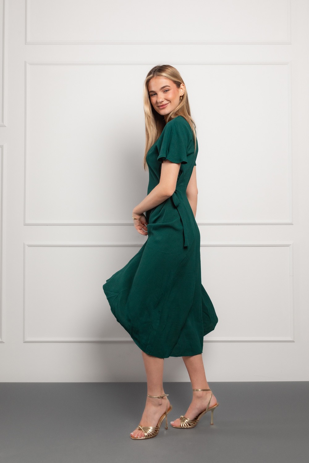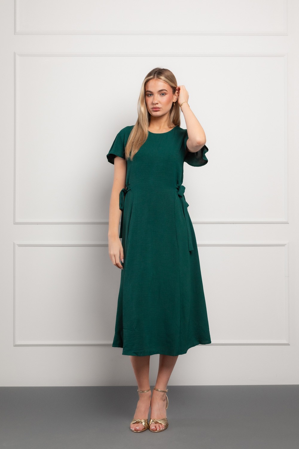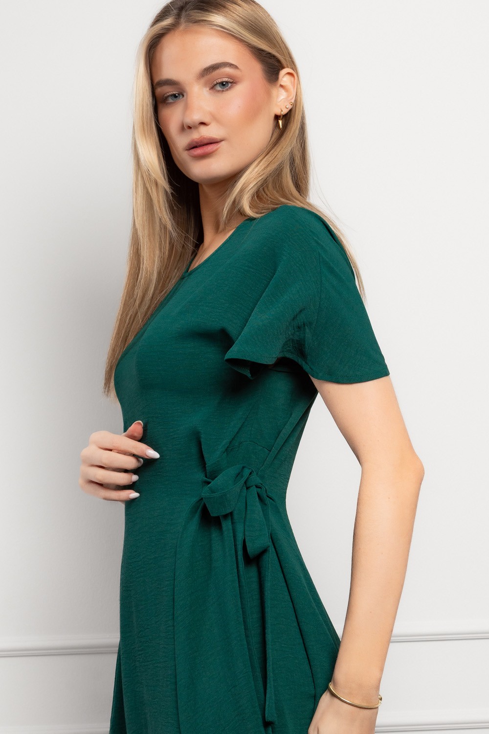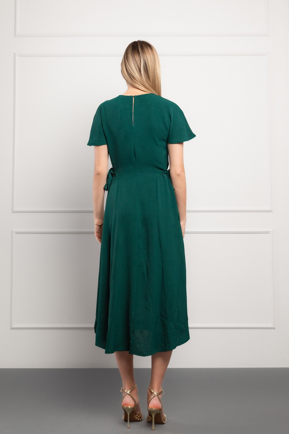 Ženska midi haljina u elegantnoj tamnozelenoj nijansi donosi jednostavan i profinjen izgled prikladan za razne prigode. Izrađena je od laganog materijala koji lijepo pada uz tijelo i pruža osjećaj udobnosti tijekom cijelog dana. Kratki rukavi, diskretan okrugli izrez i minimalistički kroj čine je svestranim komadom koji se lako uklapa u različite stilove.