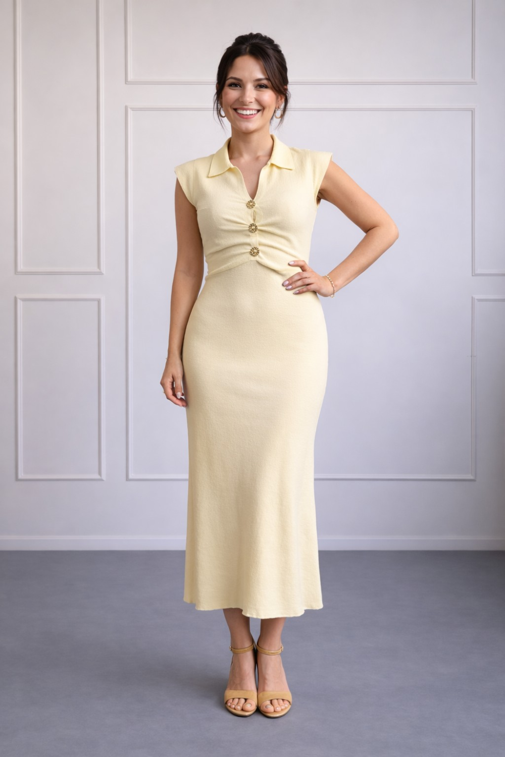 Elegantna midi haljina u prirodnoj maslinastoj nijansi savršen je spoj ležernog i sofisticiranog stila. Kopčanje sprijeda i decentna kragna daju joj košulja karakter, dok pojas u struku nagl..