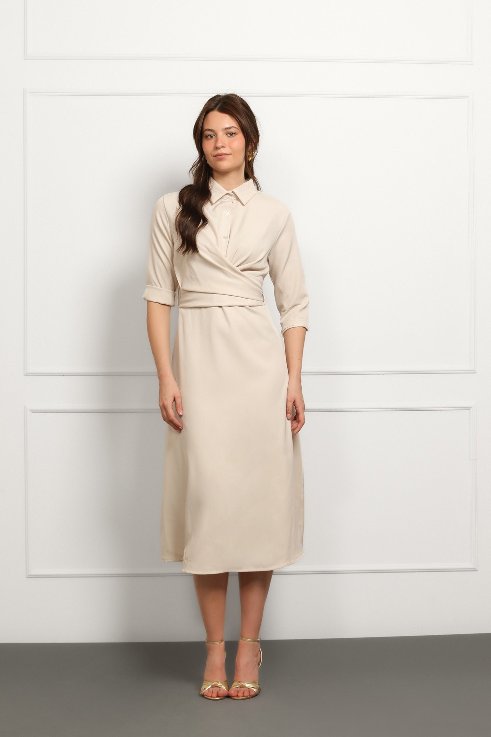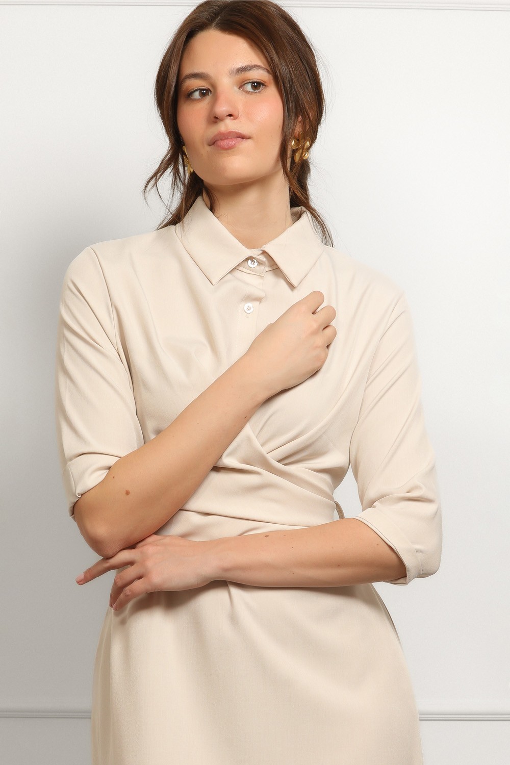 Elegantna haljina-košulja u nježnoj bež nijansi savršen je spoj klasičnog i modernog. Preklopni kroj s vezanjem u struku lijepo naglašava figuru, dok kragna i podvrnuti rukavi daju dozu ležerne sofisticiranosti.