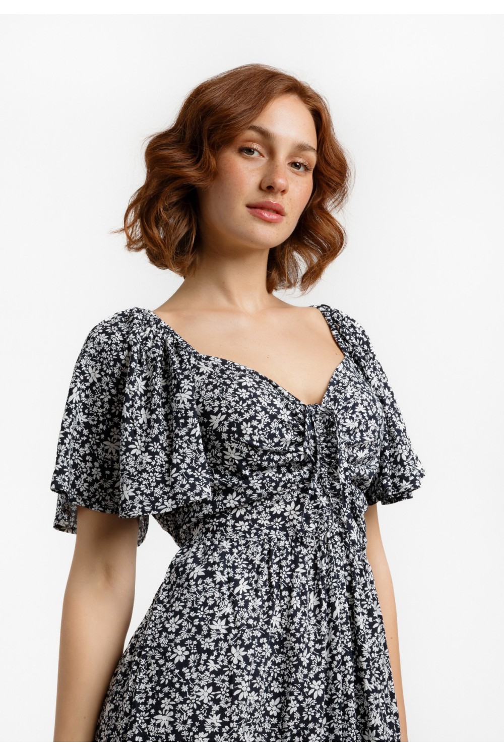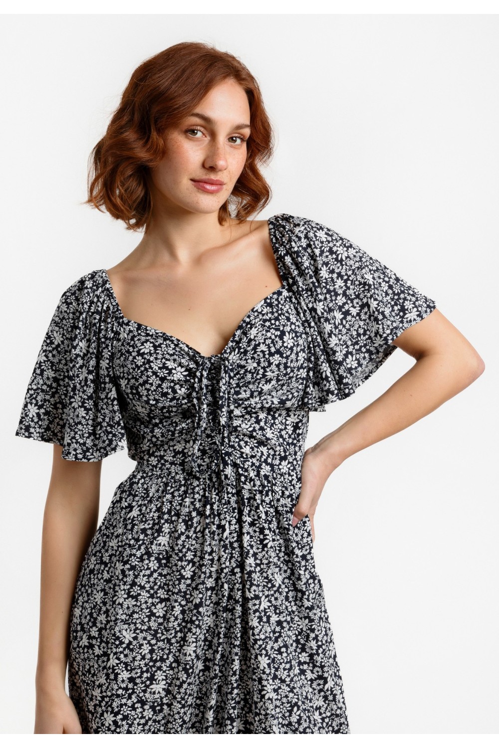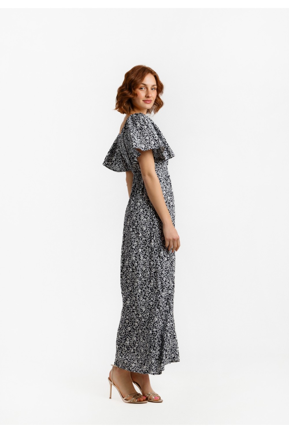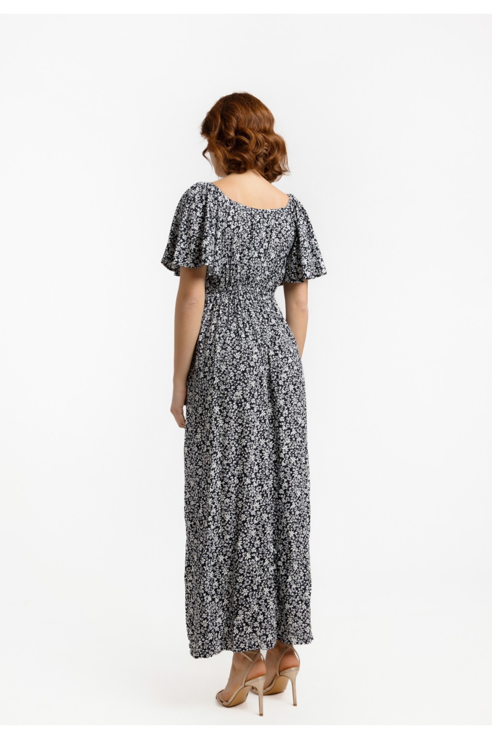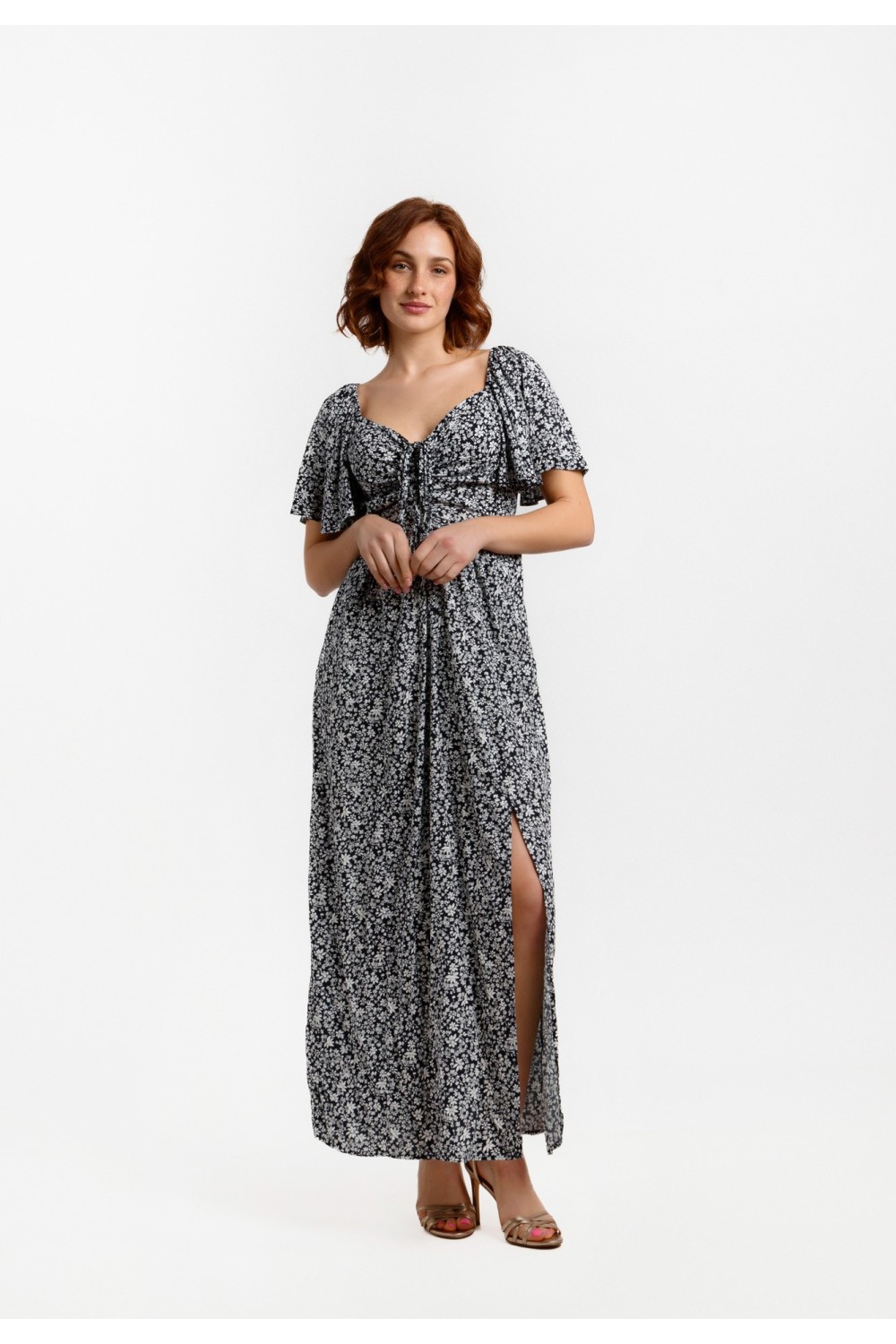Midi haljina, lepršavoga kroja sa cvjetnim uzorkom i zlatnim lurex nitima. Kratki rukavi sa prorezom, prednji dio na preklop. Elastični struk sa pojasom od istog materijala i uzorka. -100% P..