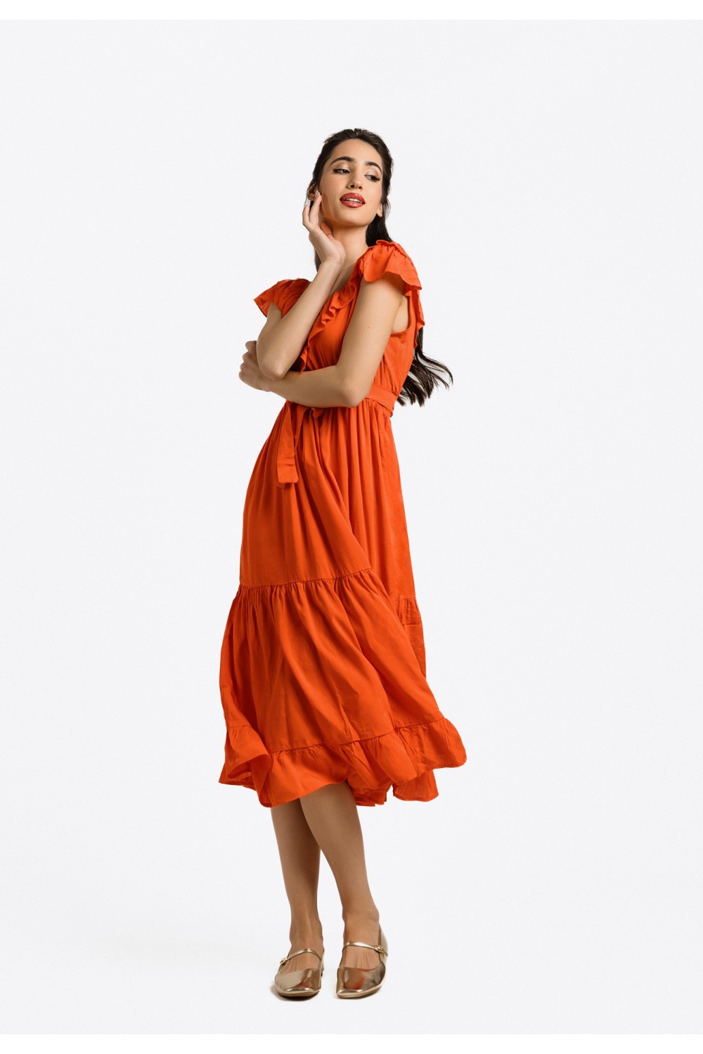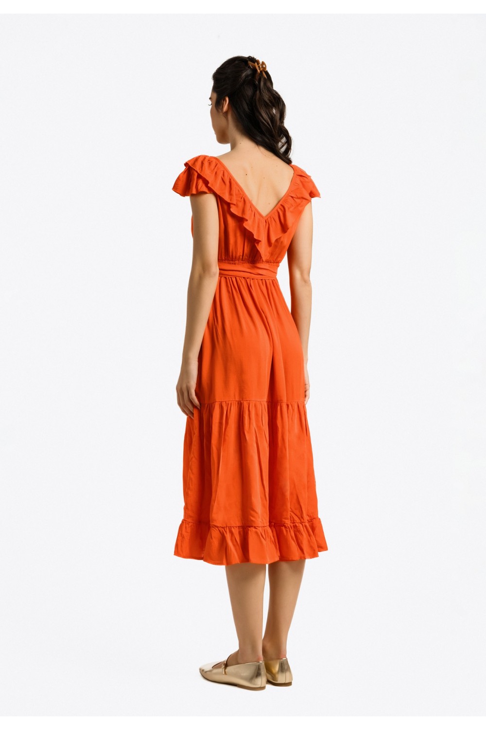 Midi haljina, lepršavoga kroja sa cvjetnim uzorkom i zlatnim lurex nitima. Kratki rukavi sa prorezom, prednji dio na preklop. Elastični struk sa pojasom od istog materijala i uzorka. -100% P..