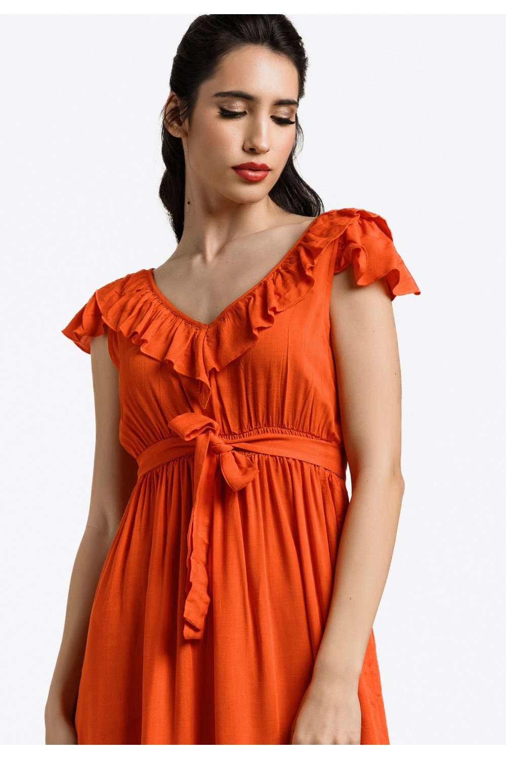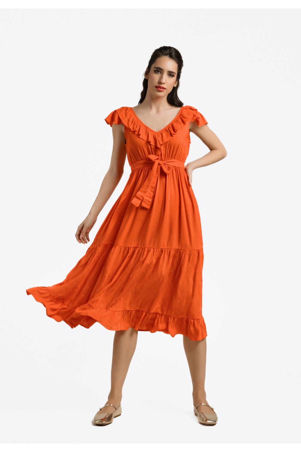 Midi haljina, 3/4 dužine rukava sa gumom oko ruba. Gornji dio poluproziran, s V izrezom sprijeda, na preklop. Elastičan struk s remenom u pojasu. U donjem dijelu podstava te prošivi s efekom..