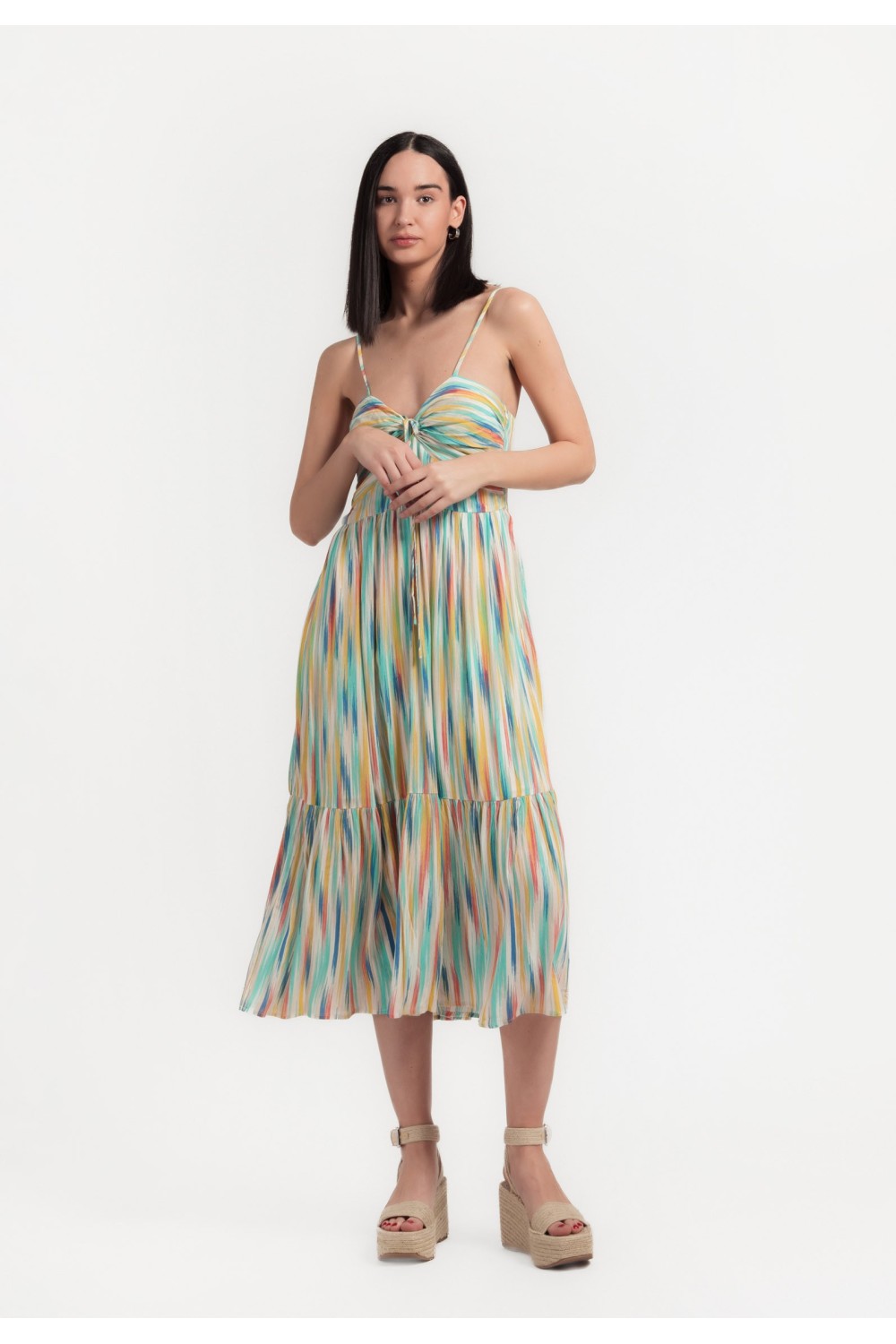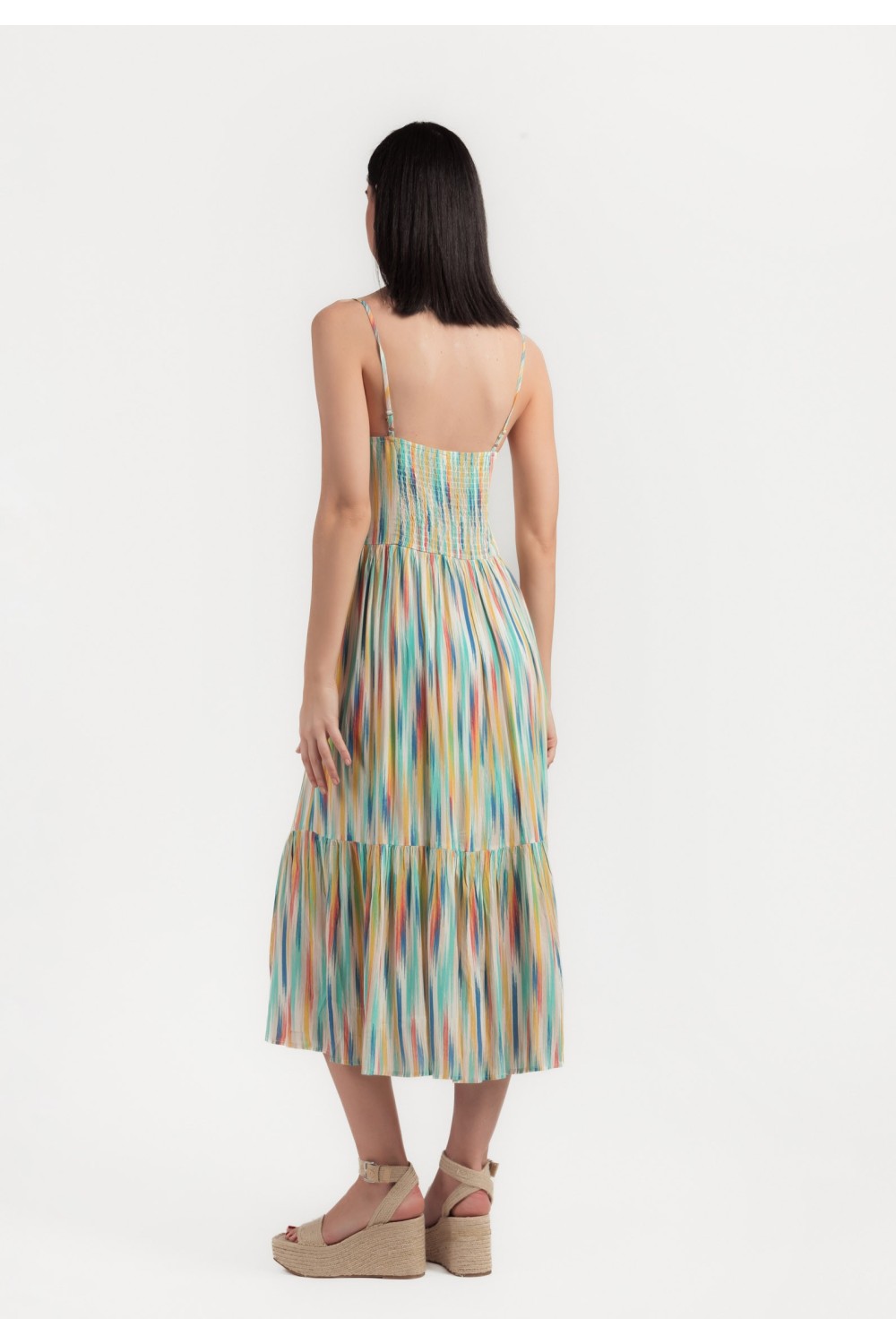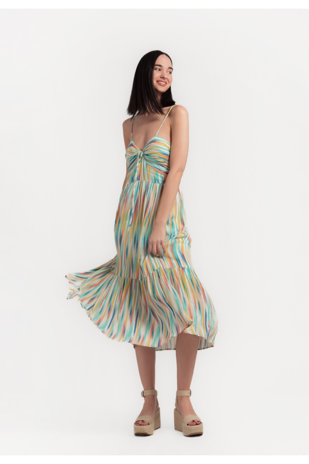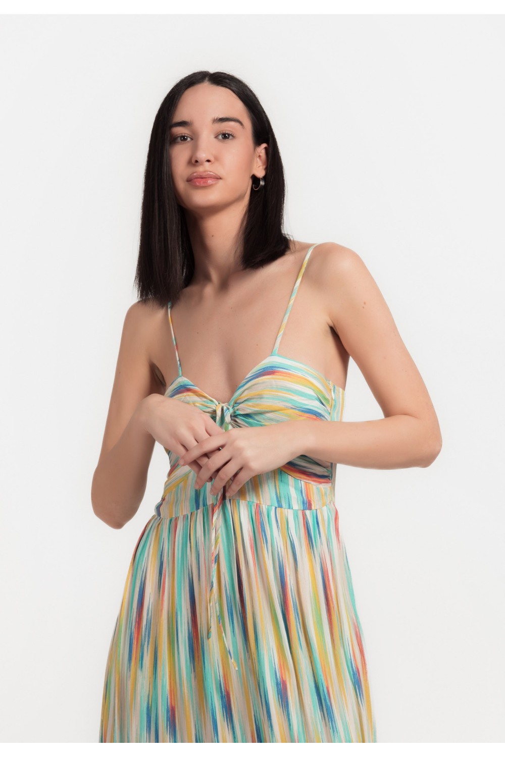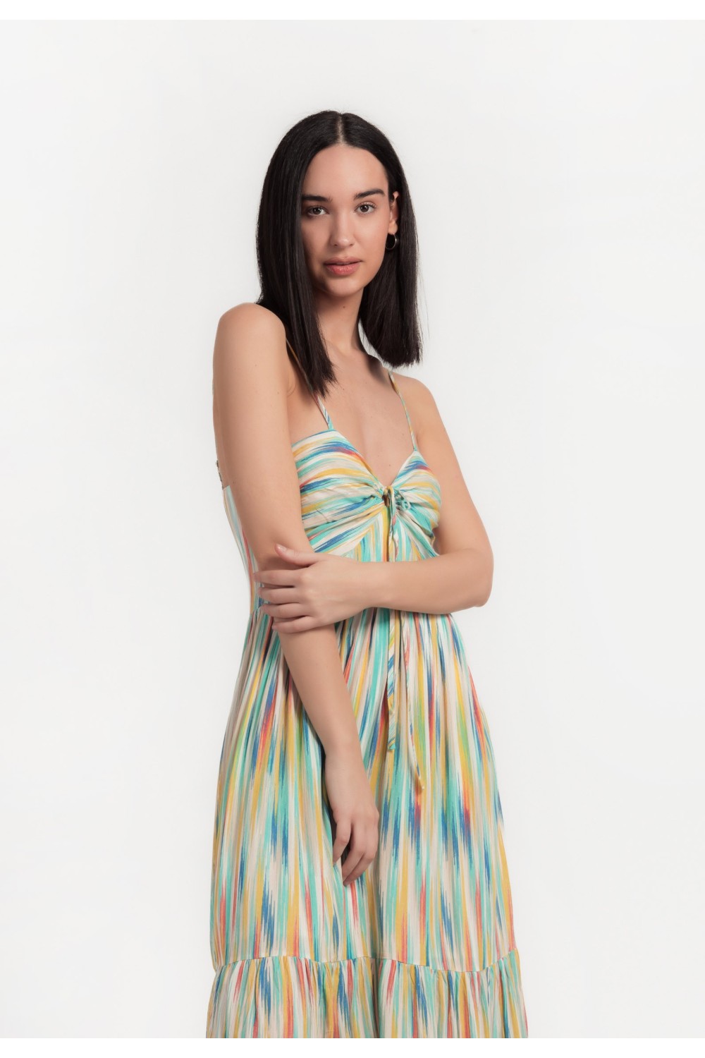 Lanena haljina na bretele, midi dužine. Vezice u struku za regulaciju širine haljine. Bočni džepovi. Proizvod je univerzalne veličine. -100% LANModel je visok 180 cm i nosi veličinu M (unive..