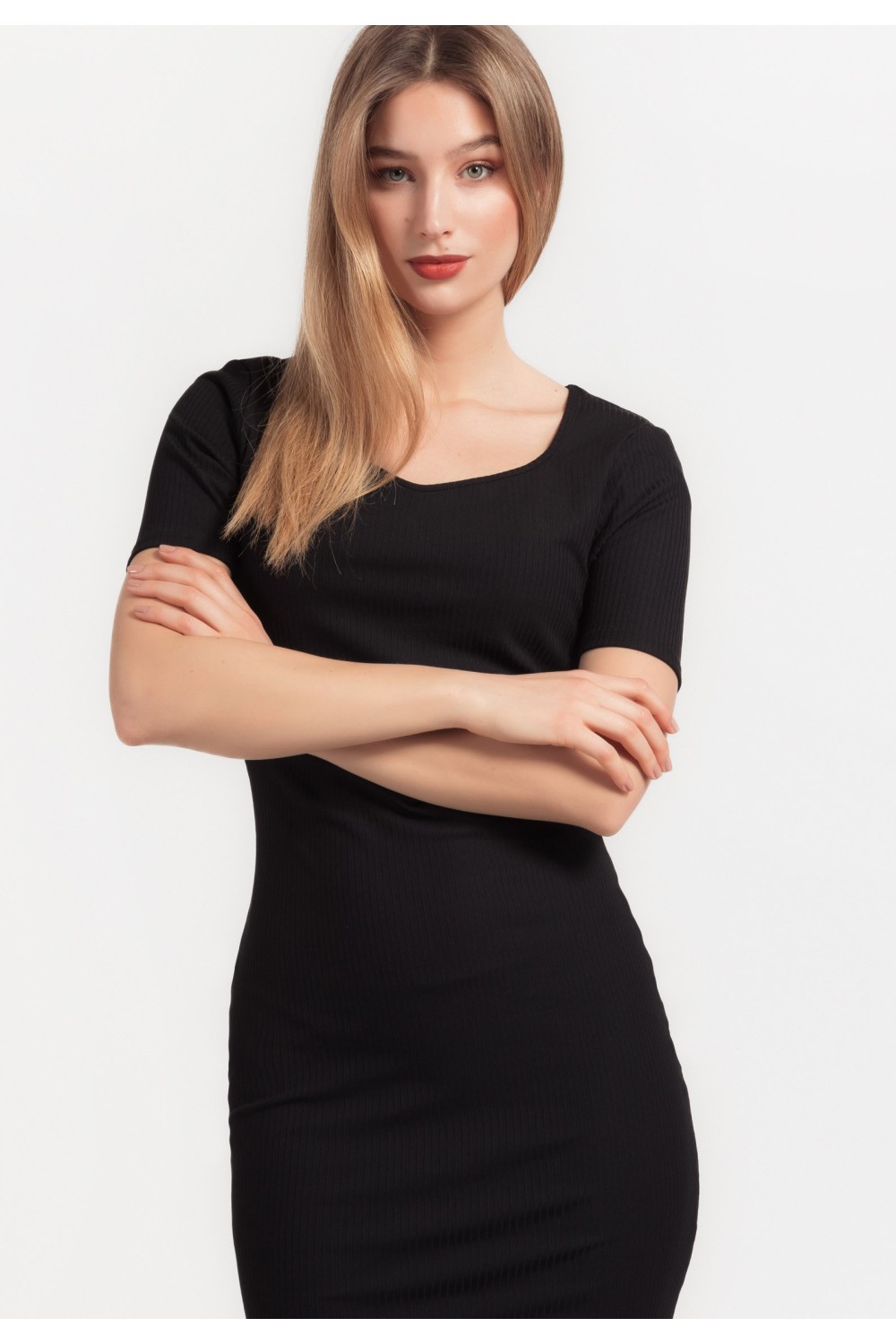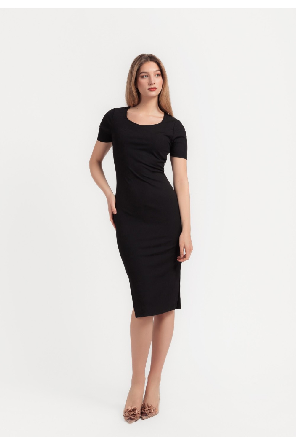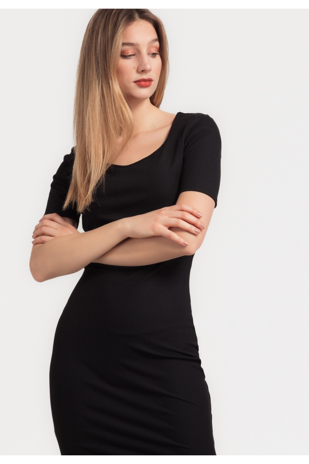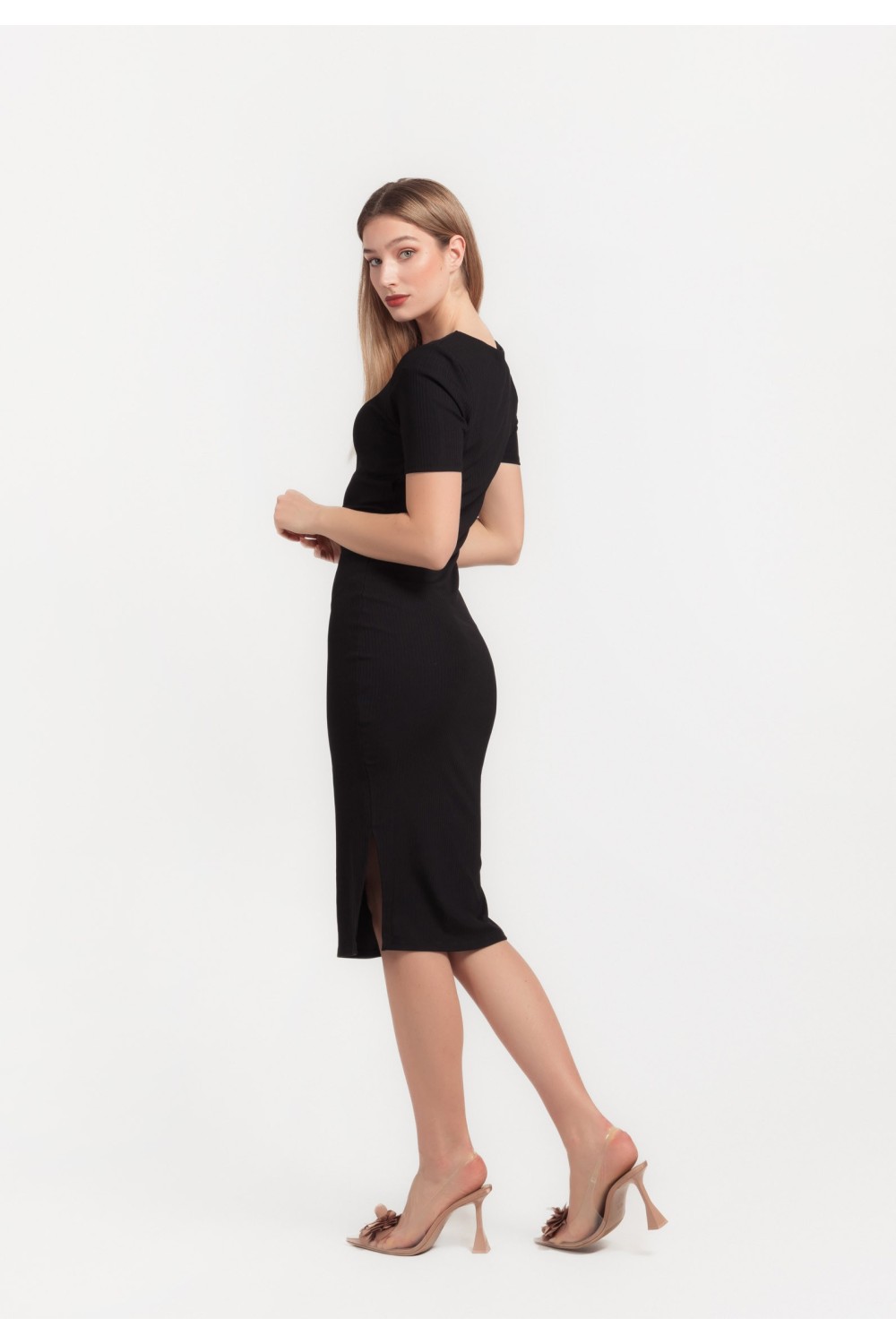 Midi haljina, 3/4 dužine rukava sa gumom oko ruba. Gornji dio poluproziran, s V izrezom sprijeda, na preklop. Elastičan struk s remenom u pojasu. U donjem dijelu podstava te prošivi s efekom..
