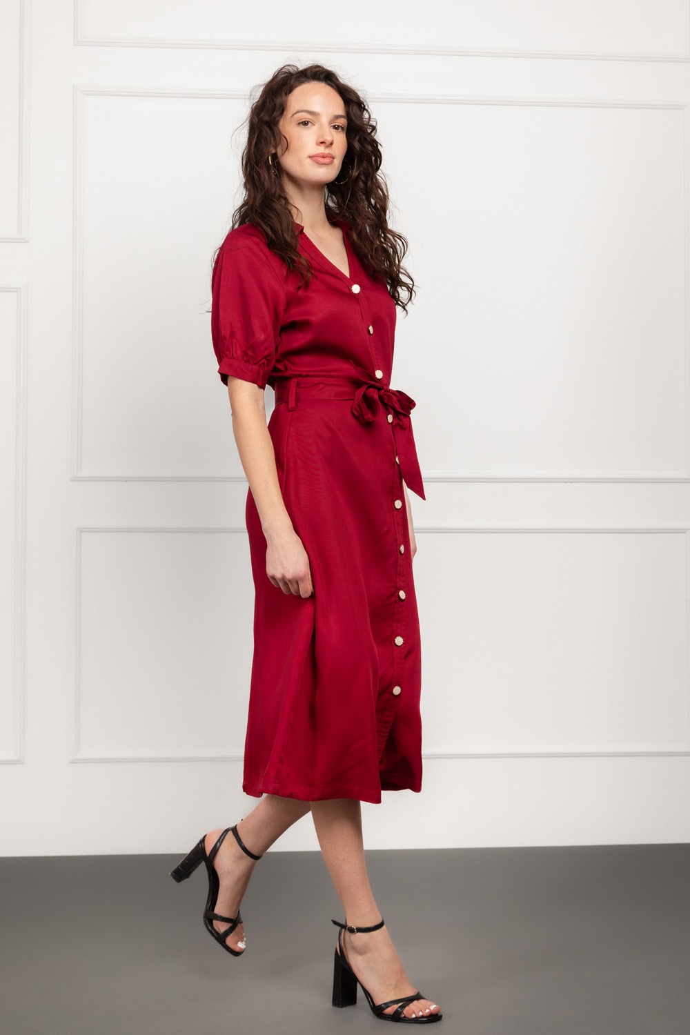 Midi haljina bez rukava u svijetloj nijansi s kontrastnim crnim točkama donosi spoj klasike i ženstvenosti. Košulja kroj s ovratnikom i kopčanjem cijelom dužinom daje joj profinjen izgled. L..