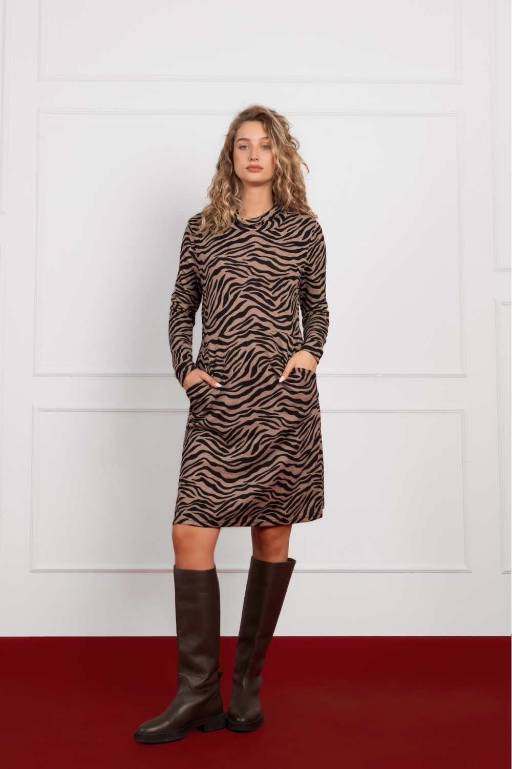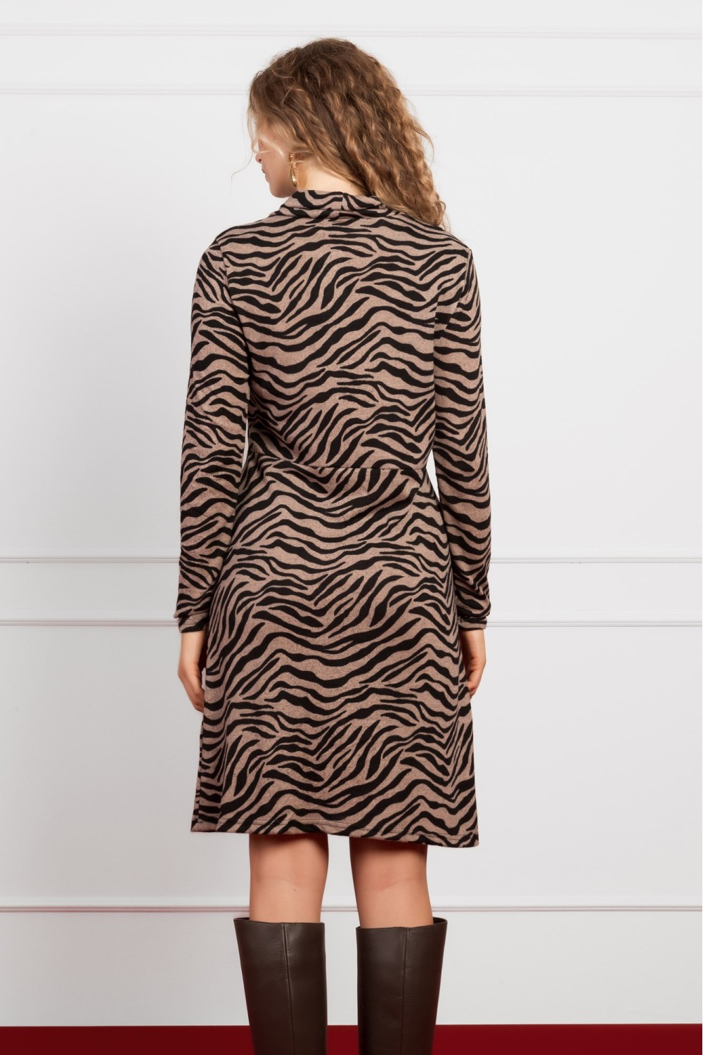 Smeđa midi haljina kratkih rukava s kontrastnim rubovima – jednostavna, a elegantna. Prilagođena svakodnevnom nošenju, ali i za poslovne ili večernje prilike uz pravi odabir modnih dodataka...