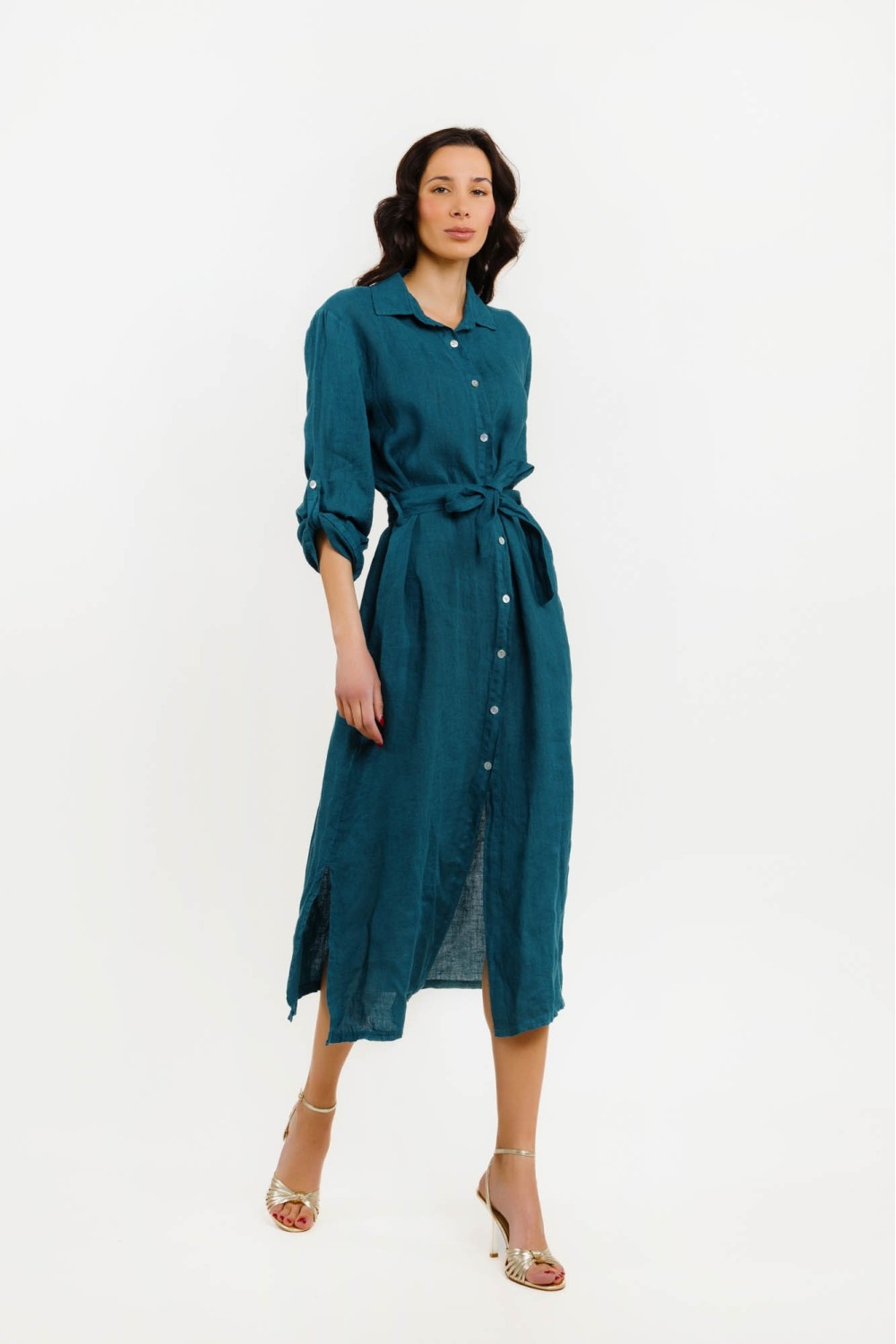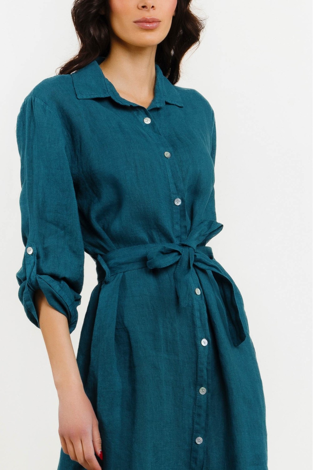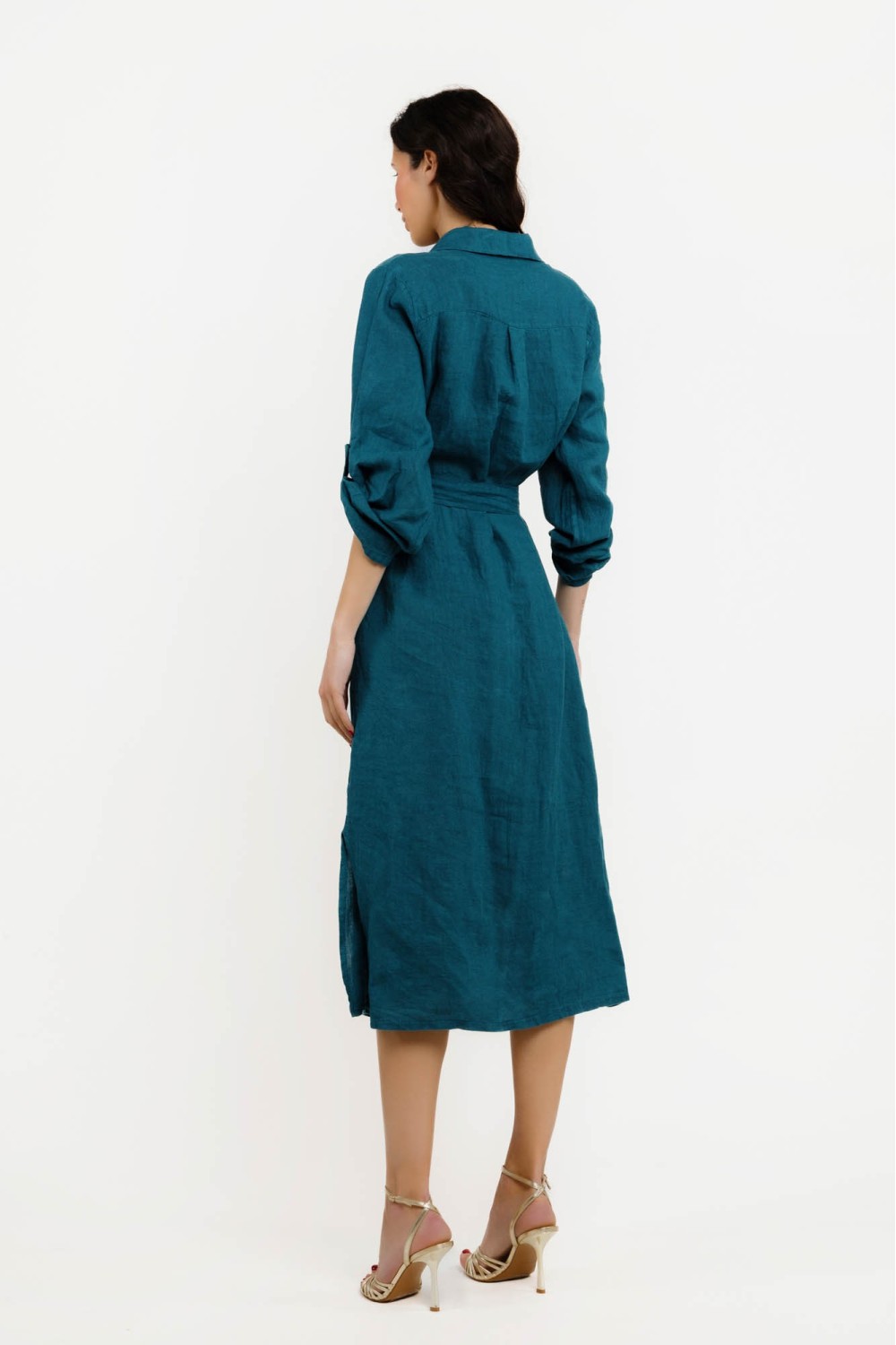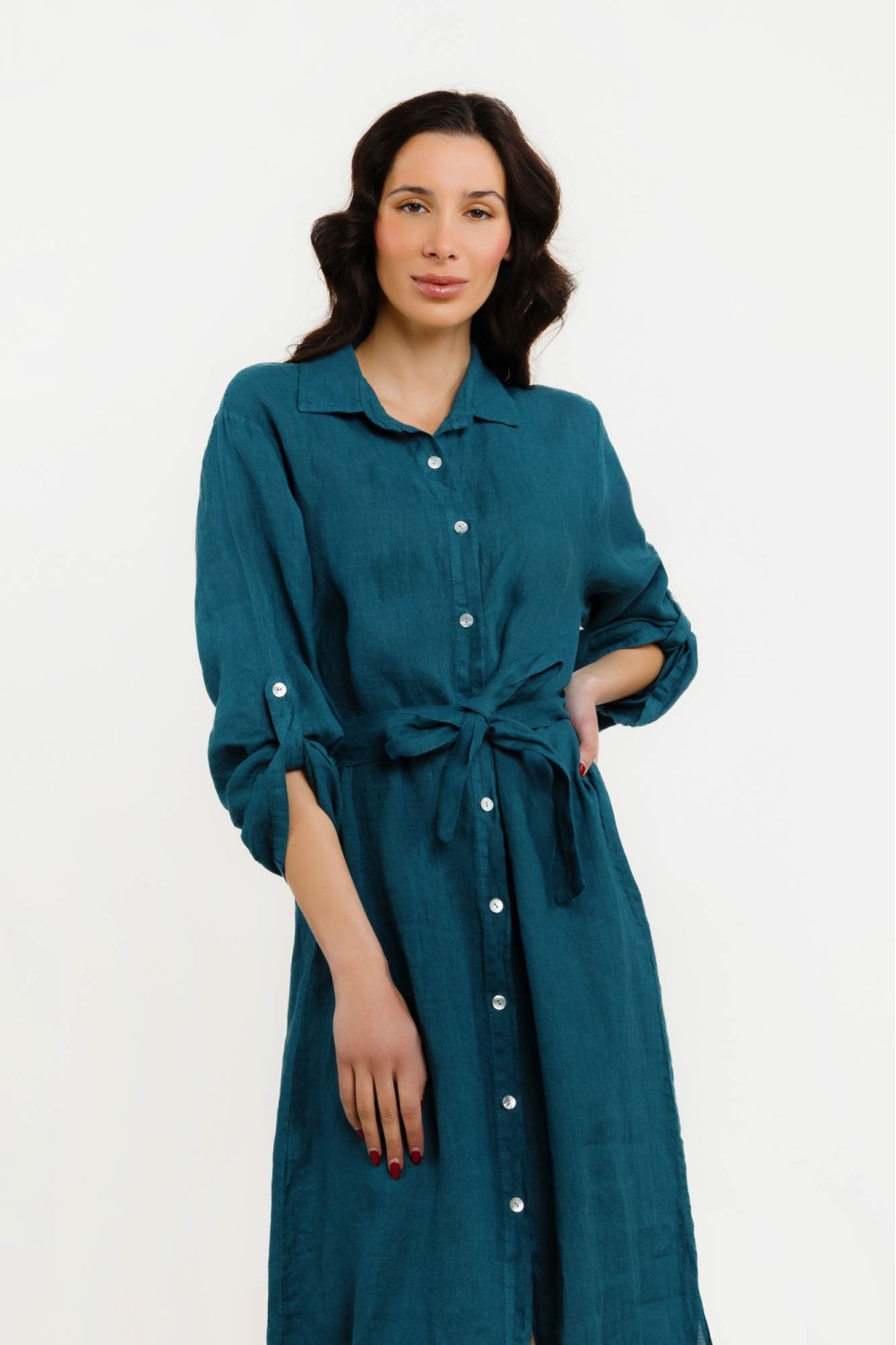 Lanena haljina na bretele, midi dužine. Vezice u struku za regulaciju širine haljine. Bočni džepovi. Proizvod je univerzalne veličine. -100% LANModel je visok 180 cm i nosi veličinu M (unive..
