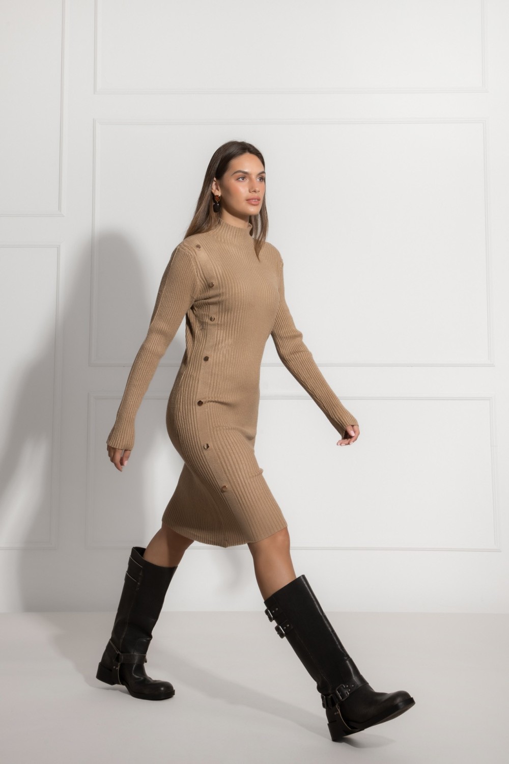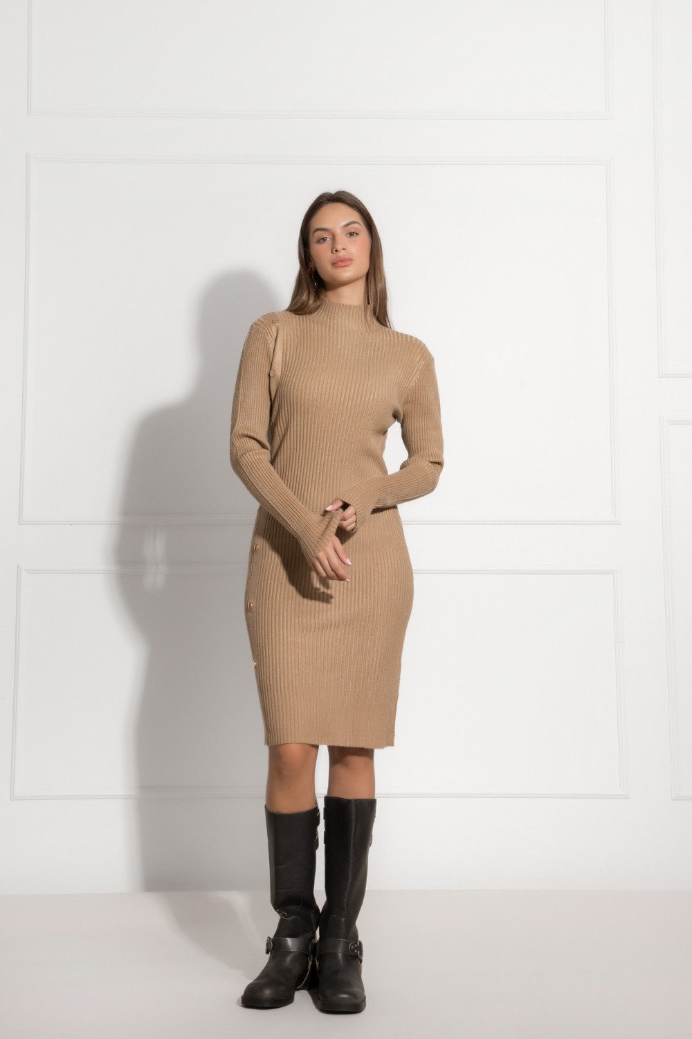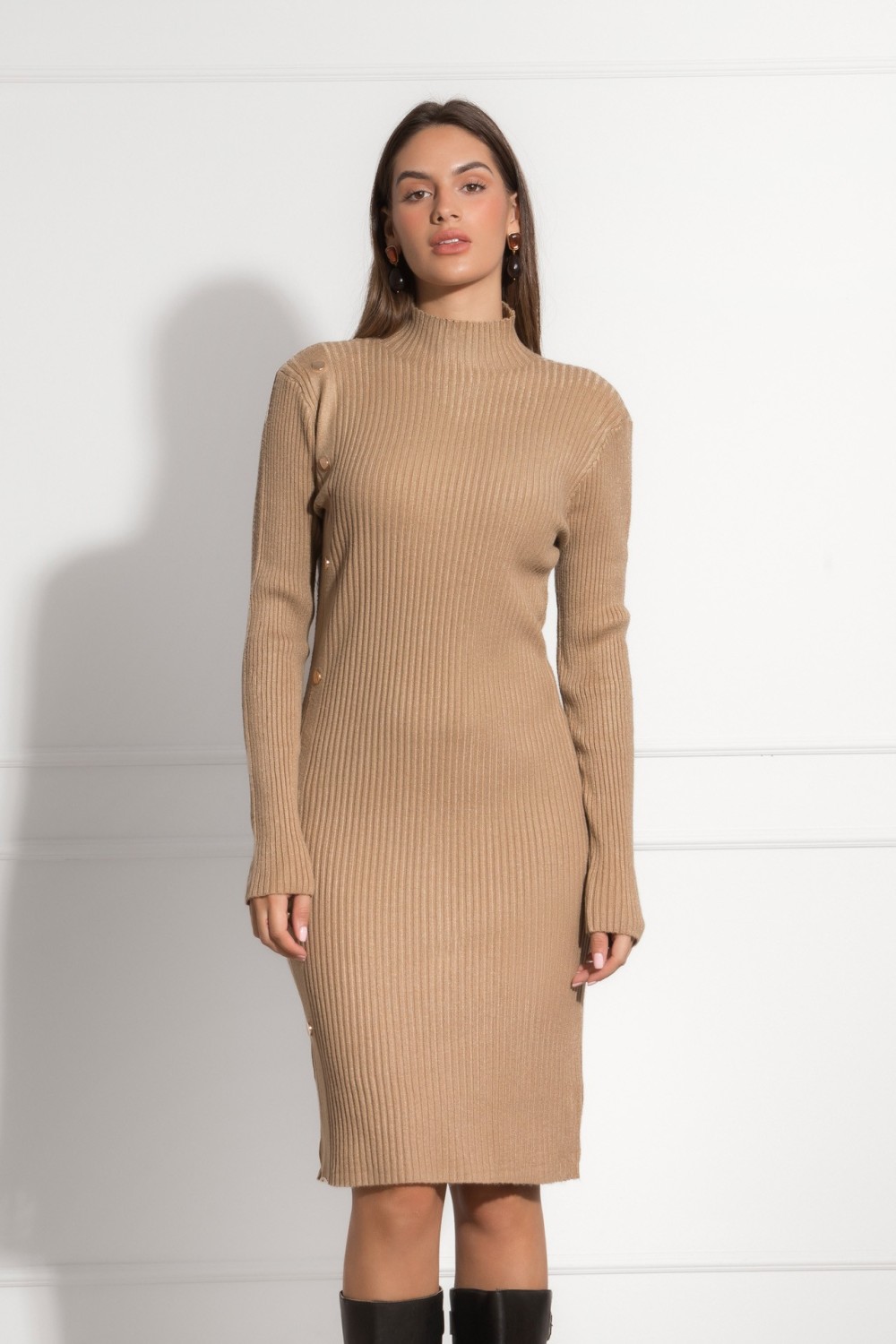 Pletena haljina dugog rukava, uz tijelo sa detaljima zlatnih lažnih dugmadi na rukavima i ramenu. Pojas oko struka od istog materijale i boje.- 90% VISKOZA, 10% NAJLONModel je visok 175 cm i..