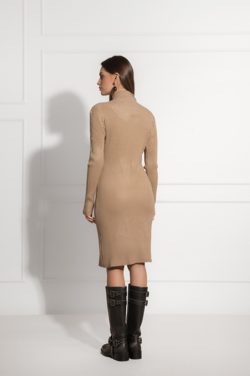 Pletena midi haljina uz tijelo, dugog rukava i povišenog ovratnika sa detaljima pletiva sprijeda.-50% VISKOZA, 30% POLIESTER, 20% NAJLON Model je visok 180 cm i nosi veličinu S/V36..