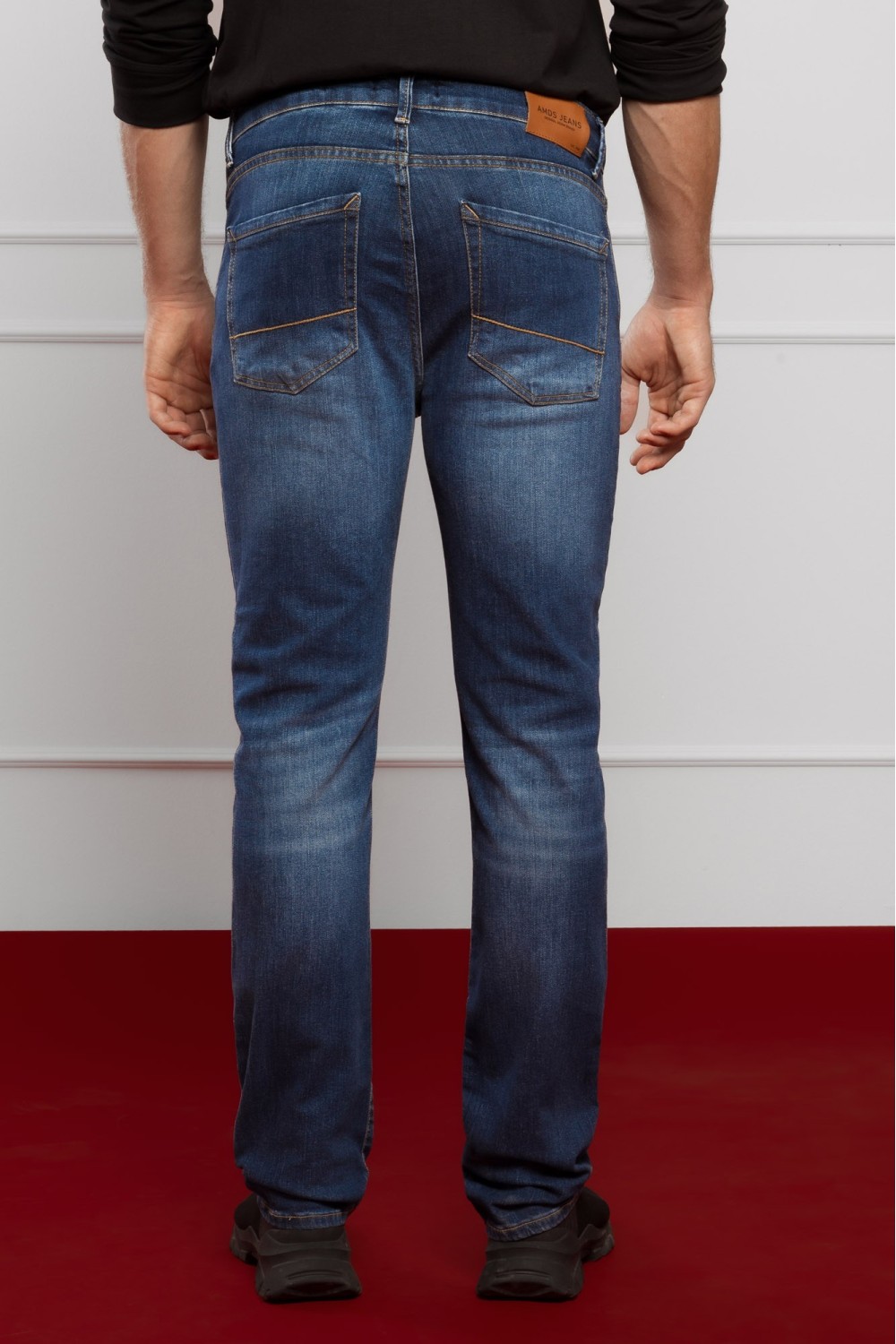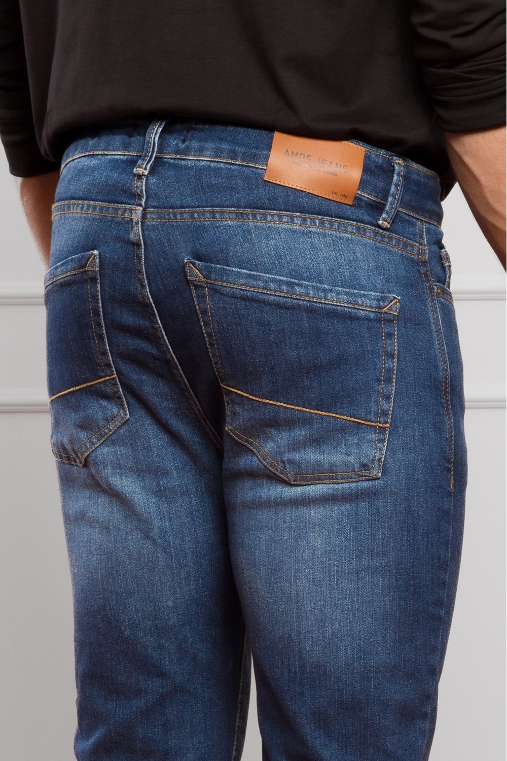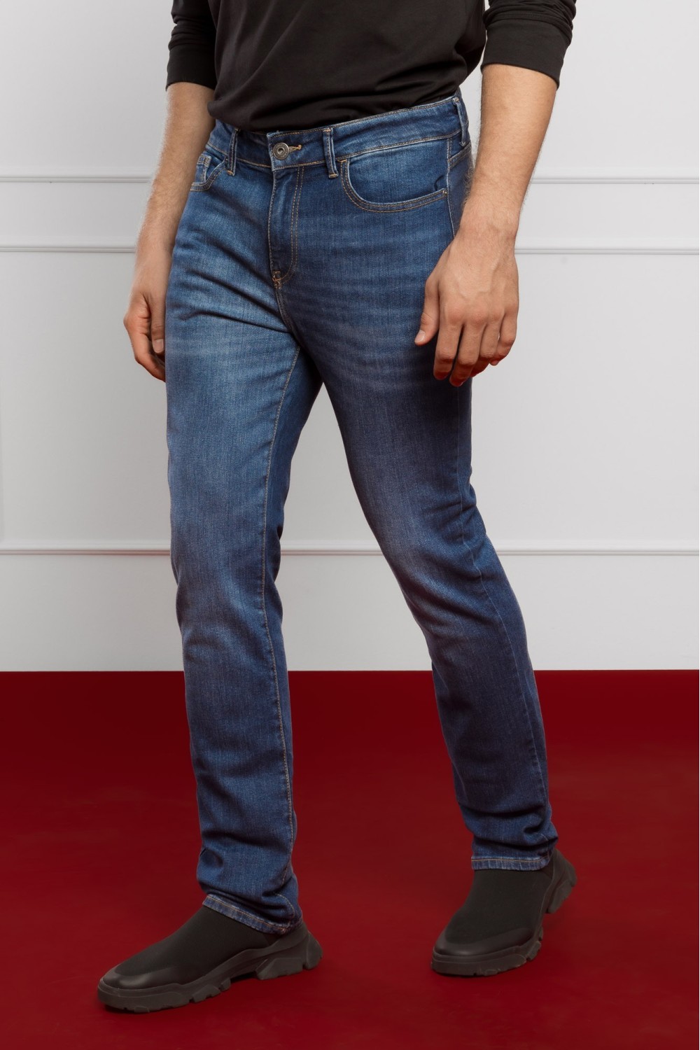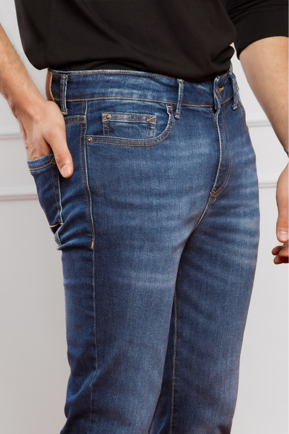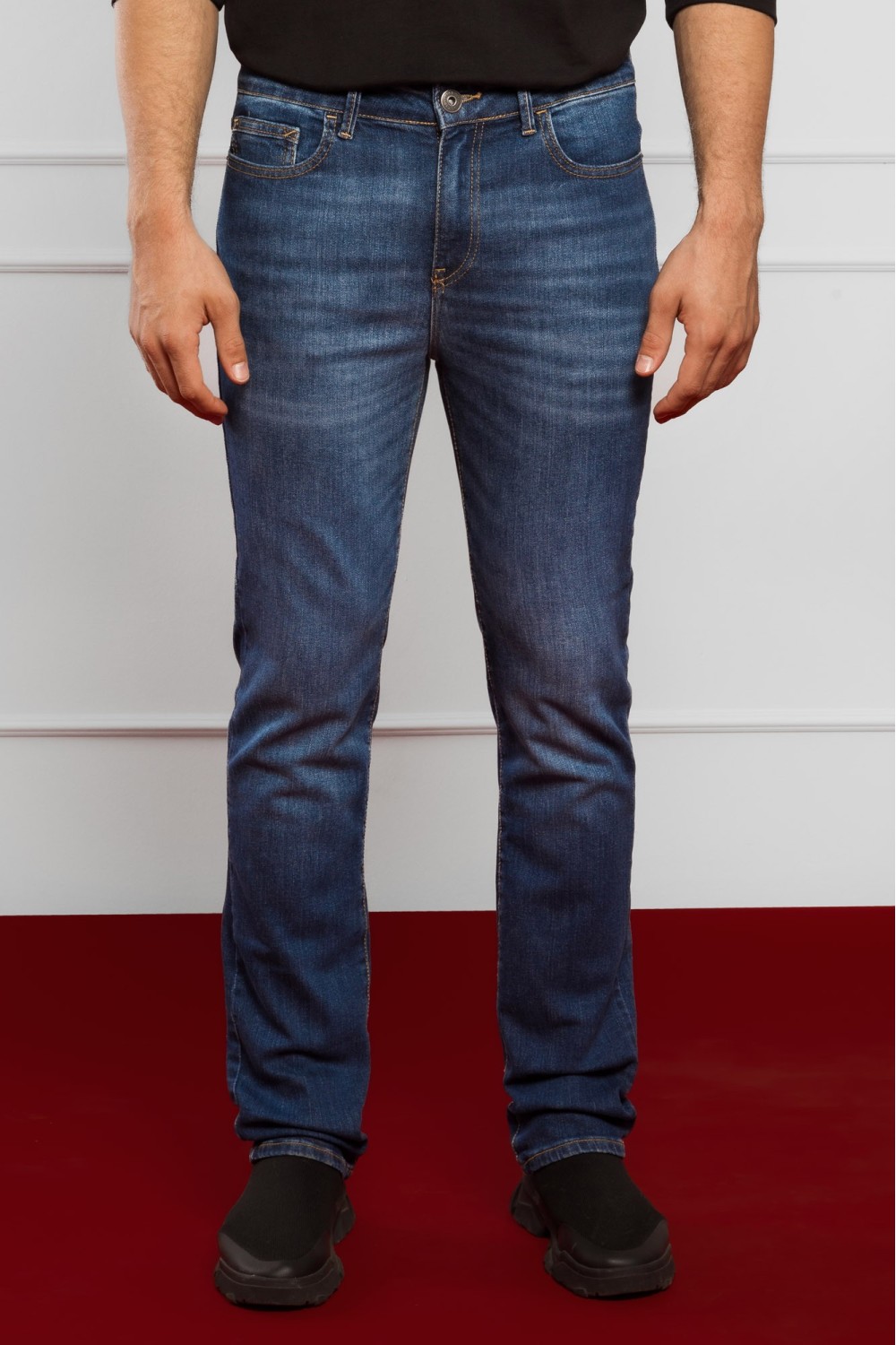 Tamne traper muške hlače, ravnih nogavica. Regular fit nosivost. Pet džepova, kopčanje sprijeda patent zatvaračem i gumbom.-98% PAMUK, 2% ELASTINModel je visok 190 cm i nosi veličinu S32...
