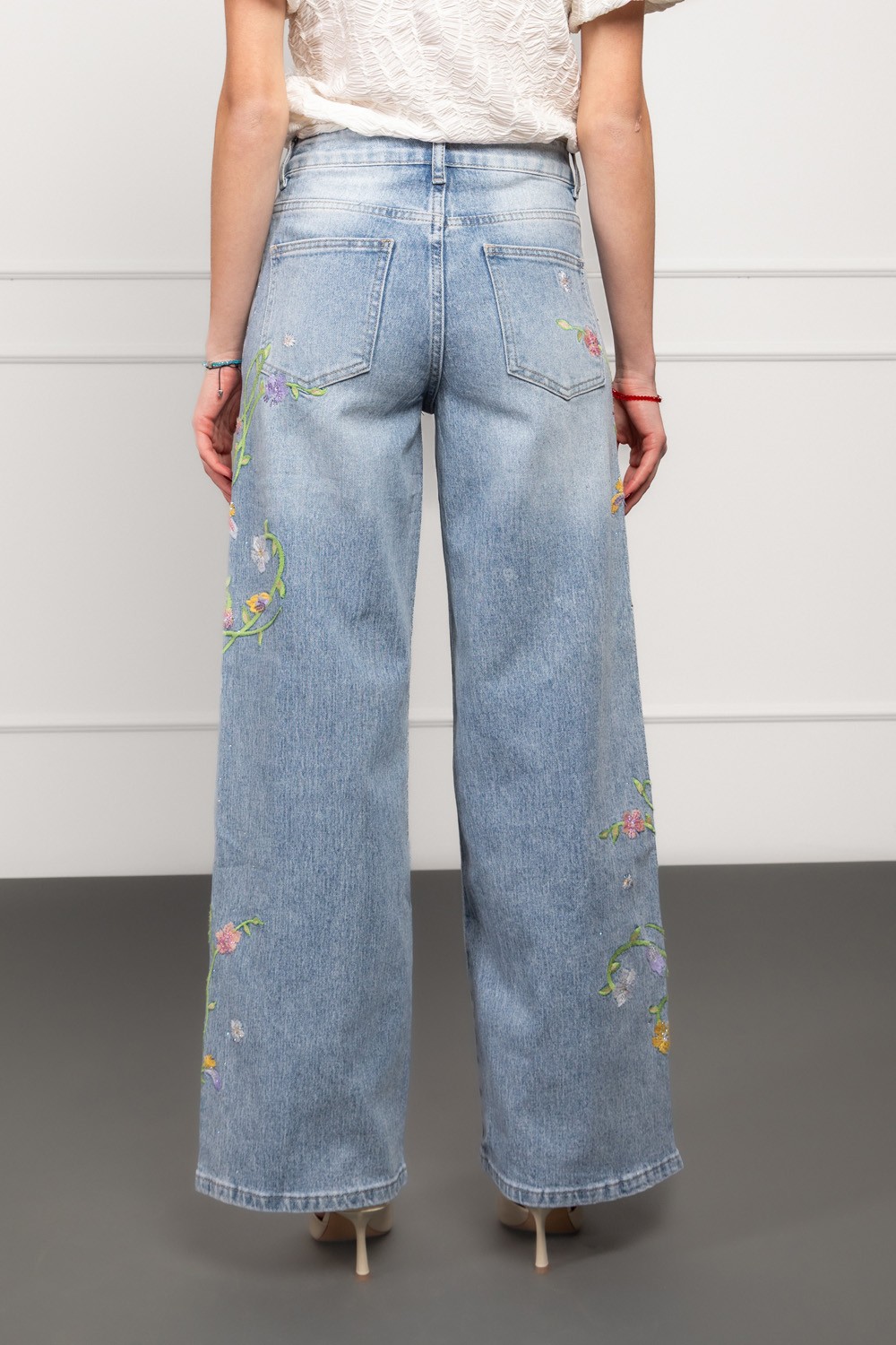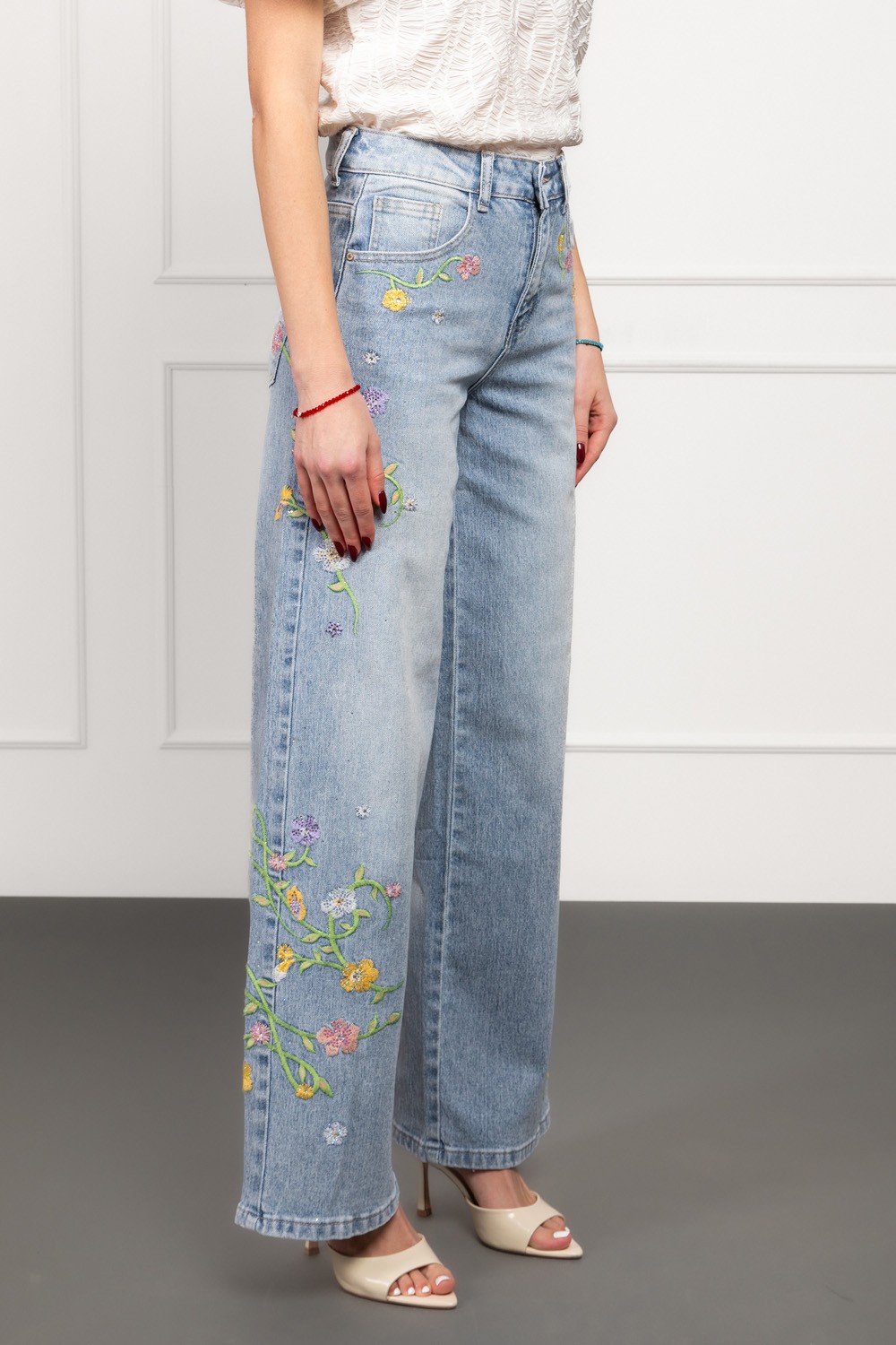 Traper hlače u svijetlom denimu sa cvjetnim vezenjem donose romantičan, ali moderan “proljeće/ljeto” izgled. Vezeni detalji u više boja raspoređeni su uz džepove i bočne strane nogavica pa komad izgleda posebno i razigrano, bez da je napadan. Kroj je ravan i ležerniji što omogućava udobno nošenje kroz cijeli dan.