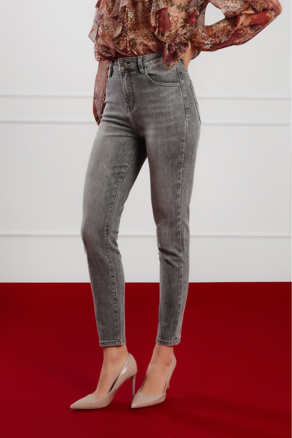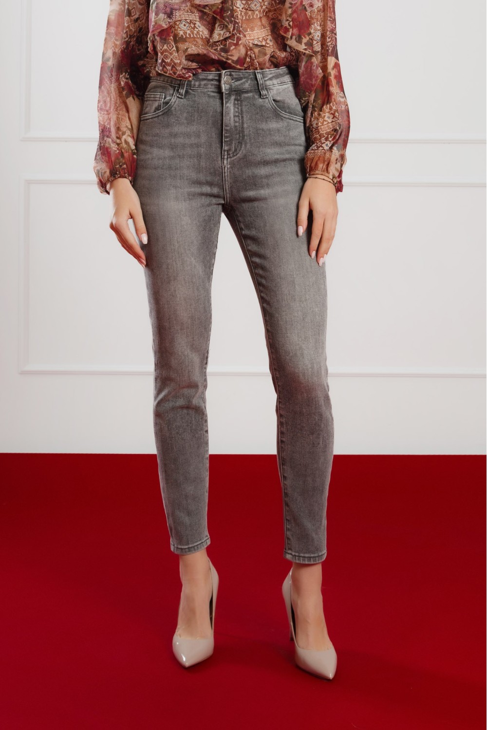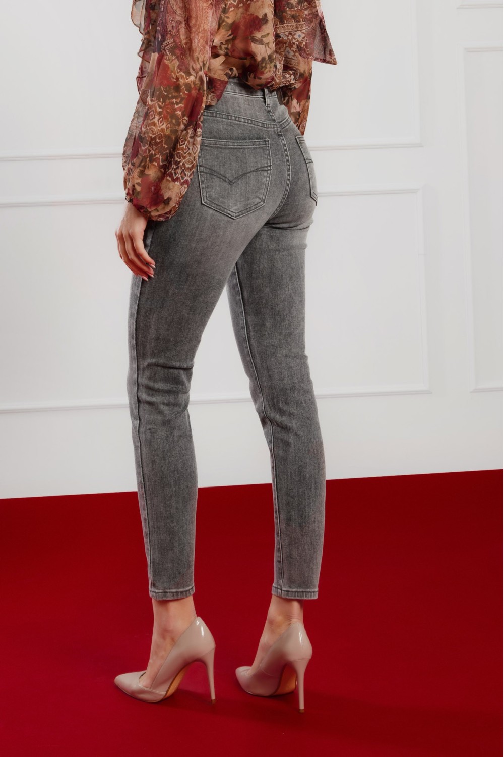 Ženske traper hlače, užih nogavica na materijalu sa elastinom. Pet džepova i kopčanje sprijeda patent zatvaračem i gumbom. Push up model s nešto drugačijim rezanjem na stražnjem dijelu, skin..