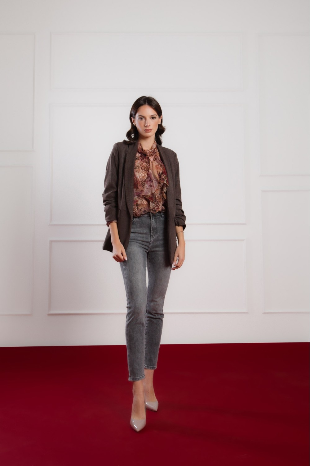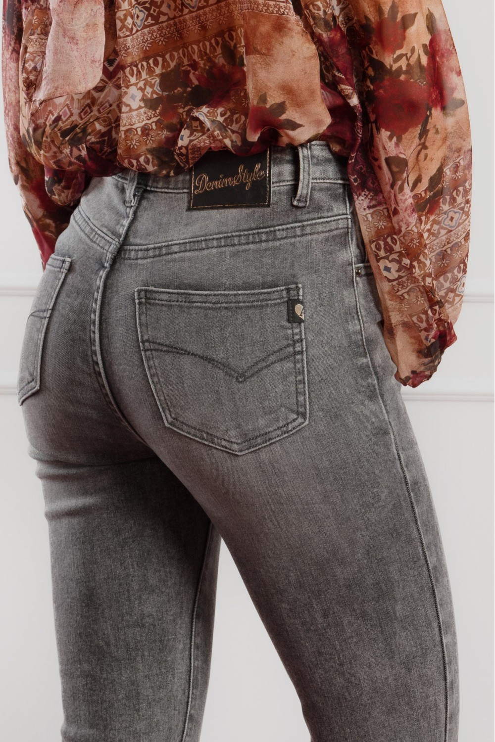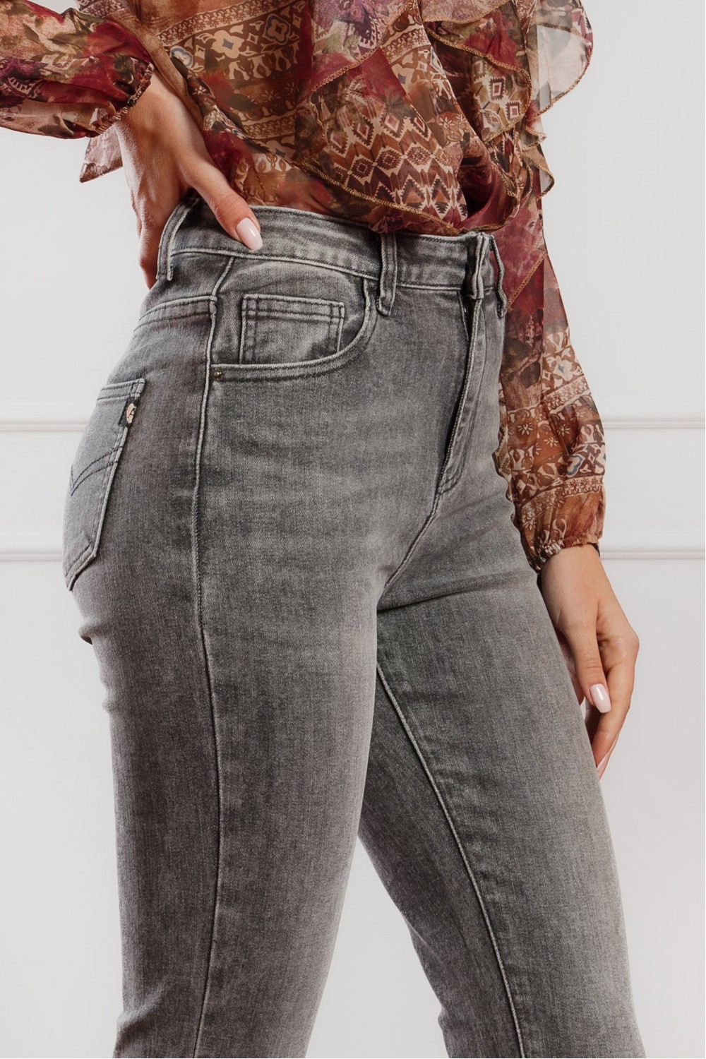 Ženske traper hlače, užih nogavica na materijalu sa elastinom. Pet džepova i kopčanje sprijeda patent zatvaračem i gumbom. Push up model s nešto drugačijim rezanjem na stražnjem dijelu, skin..