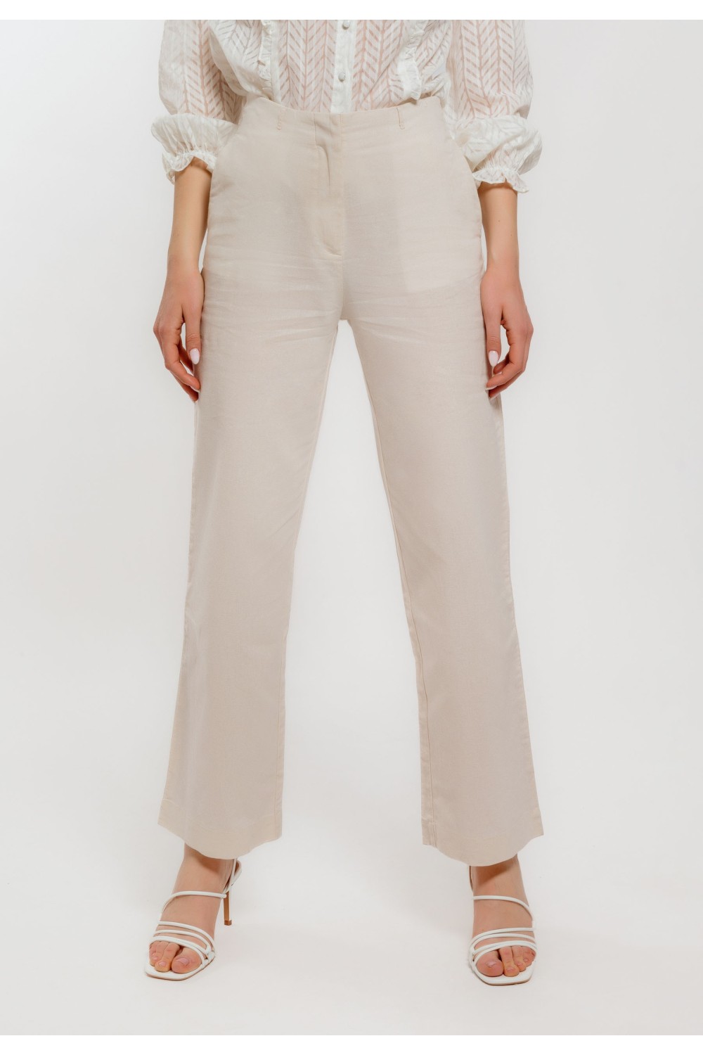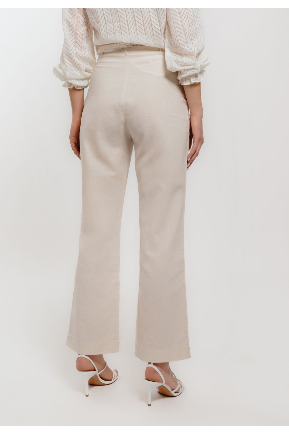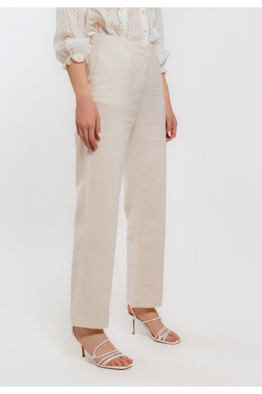 Ženske bijele hlače elegantnog, ravnog kroja savršeno prate liniju tijela i pružaju uredan, profinjen izgled. Srednje visok struk i klasično kopčanje doprinose udobnosti i stabilnom pristaja..