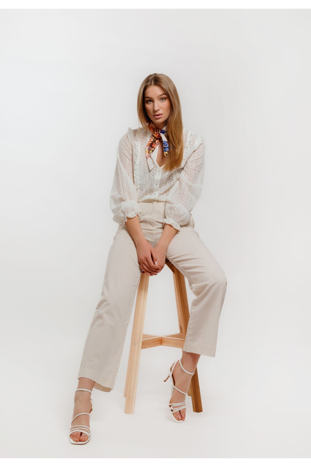 Košulja dugih rukava sa okruglim izrezom i trakicom za vezanje mašne. Uzorak košulje je cvjetnog motiva, kroj je širi. Na samom porubu rukava model ima elastične prošive za regulaciju širin..
