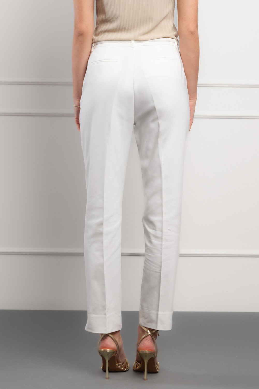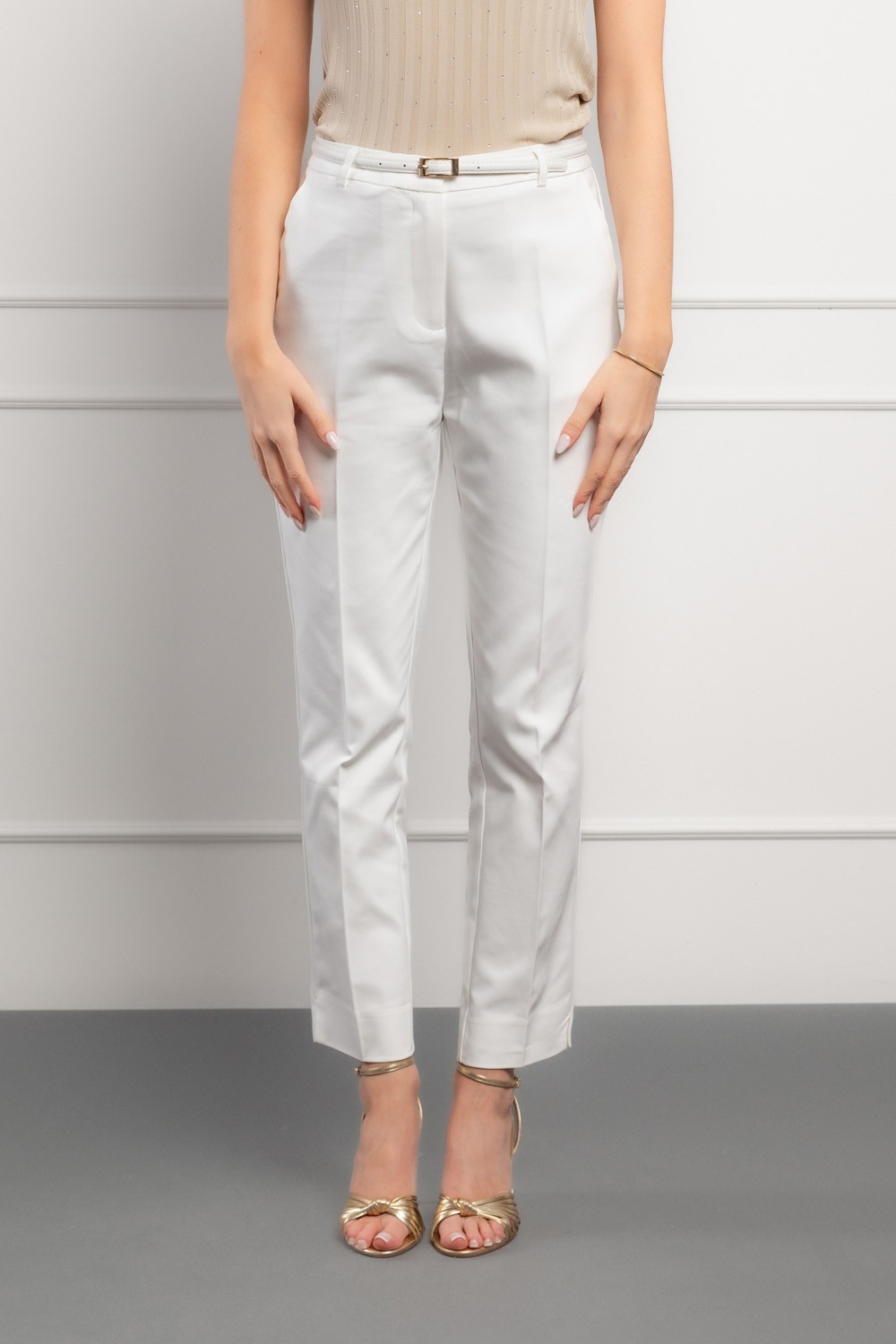 Ženske bijele hlače elegantnog, ravnog kroja savršeno prate liniju tijela i pružaju uredan, profinjen izgled. Srednje visok struk i klasično kopčanje doprinose udobnosti i stabilnom pristajanju, dok blago sužene nogavice vizualno izdužuju figuru.