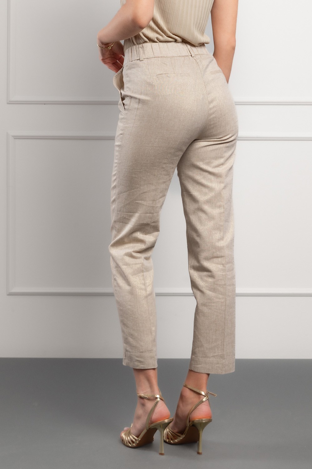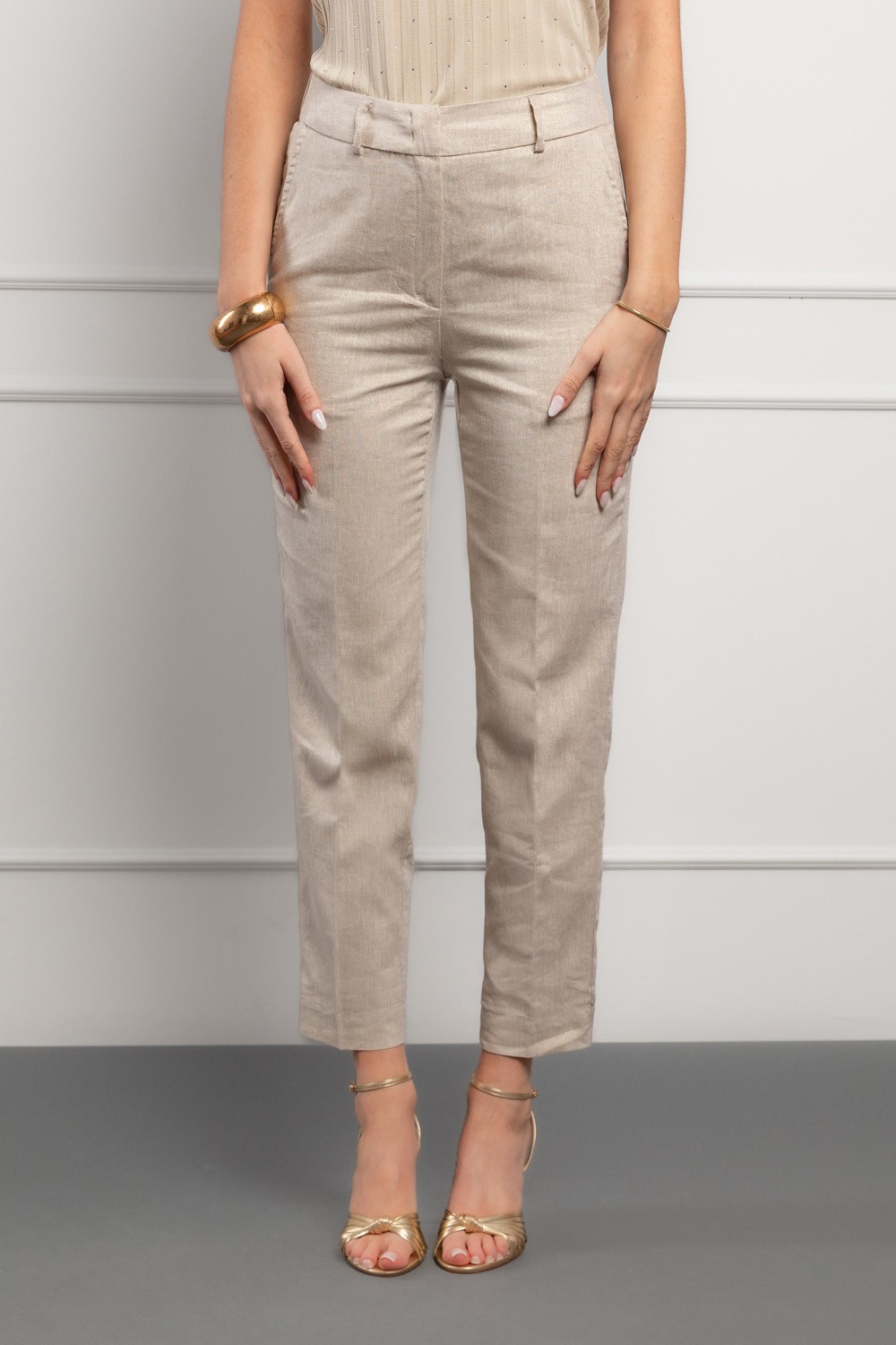 Ženske lanene bež hlače ravnog kroja donose kombinaciju elegancije i udobnosti u jednom komadu. Model je dizajniran s klasičnim strukom i čistim linijama koje vizualno izdužuju nogu i pružaju uredan, sofisticiran izgled.
