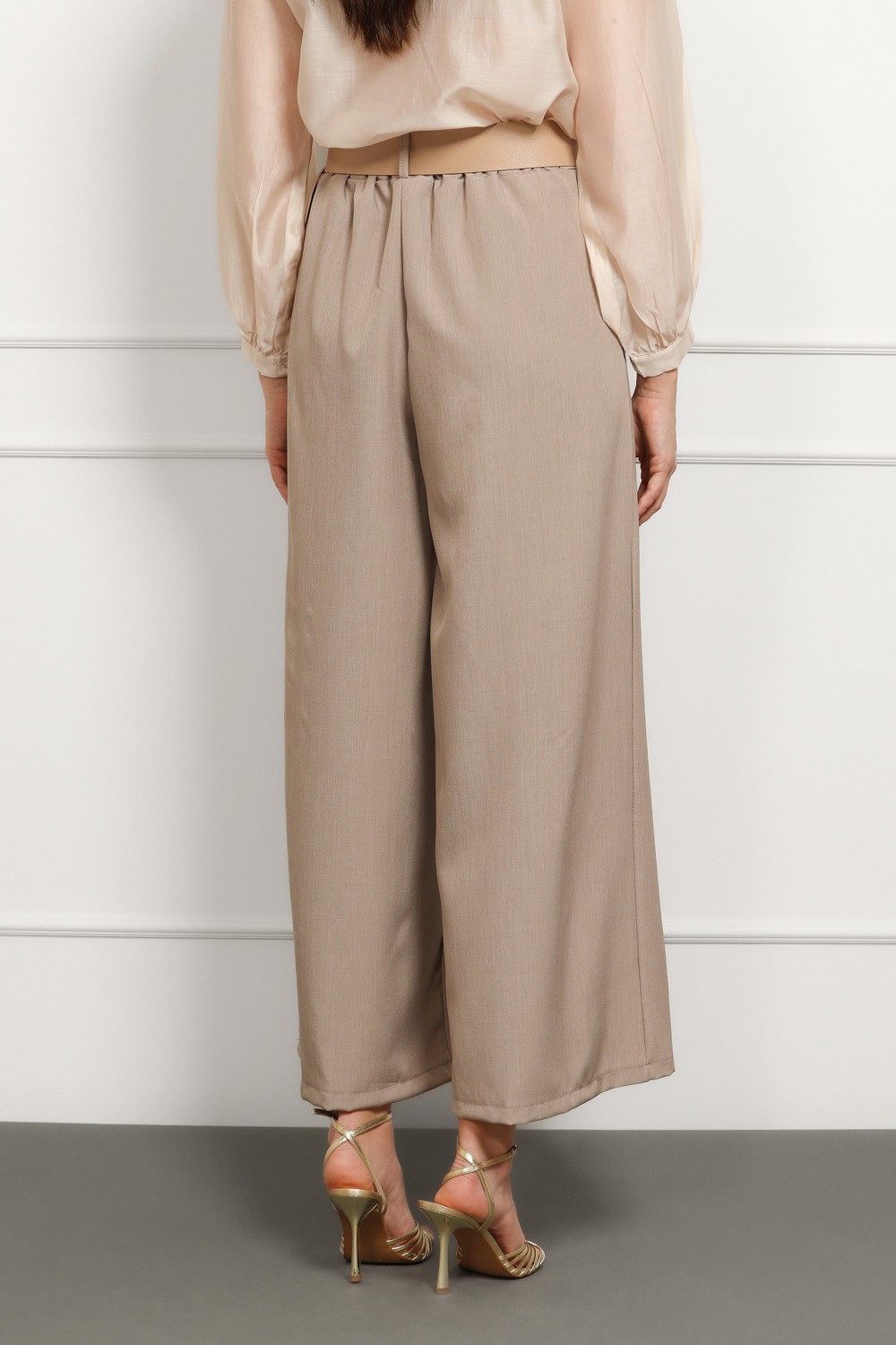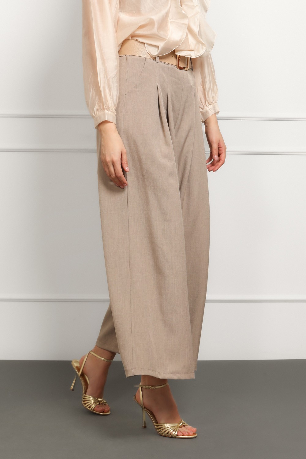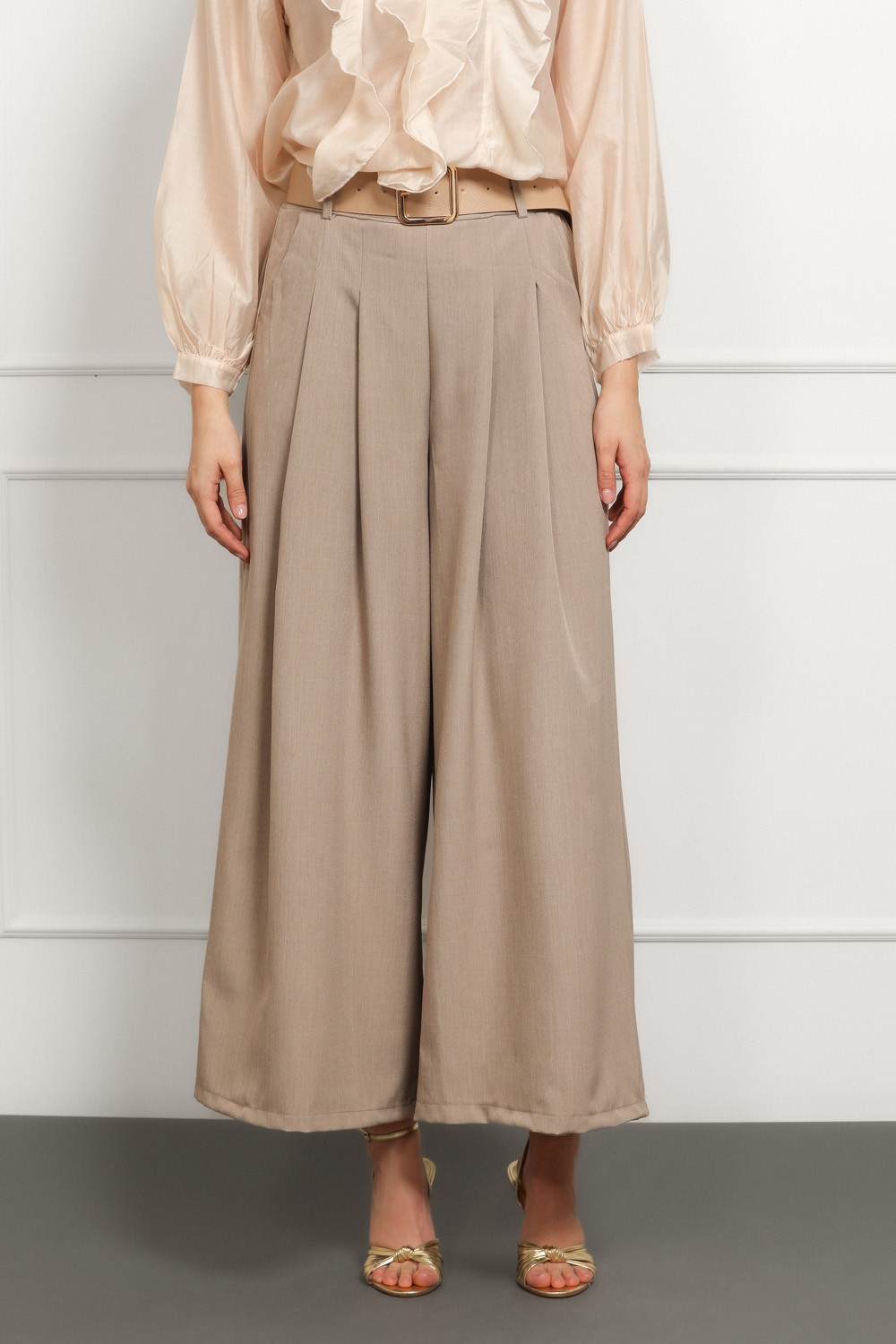 Elegantne ženske hlače u sofisticiranoj bež nijansi, savršen izbor za poslovne i svečanije kombinacije. Visoki struk s naglašenim plisiranim detaljima vizualno izdužuje figuru, dok široke nogavice daju profinjen i moderan izgled.