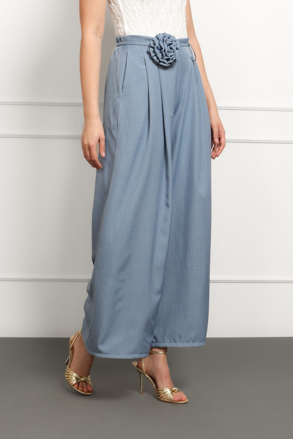 Lepršave ženske hlače u nježnoj plavoj nijansi. Model je visokog struka s naglašenim plisiranim detaljima te širokim nogavicama.