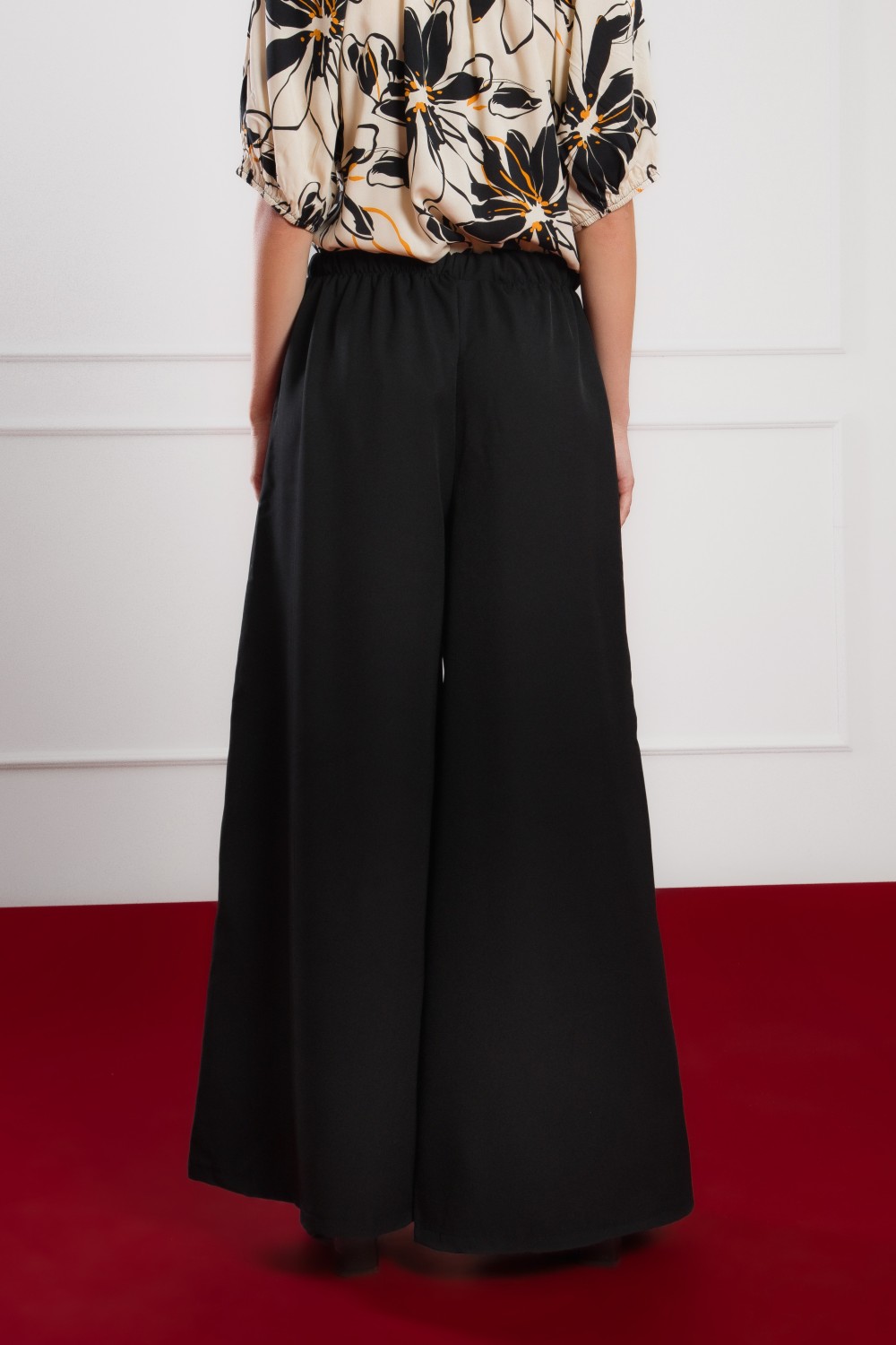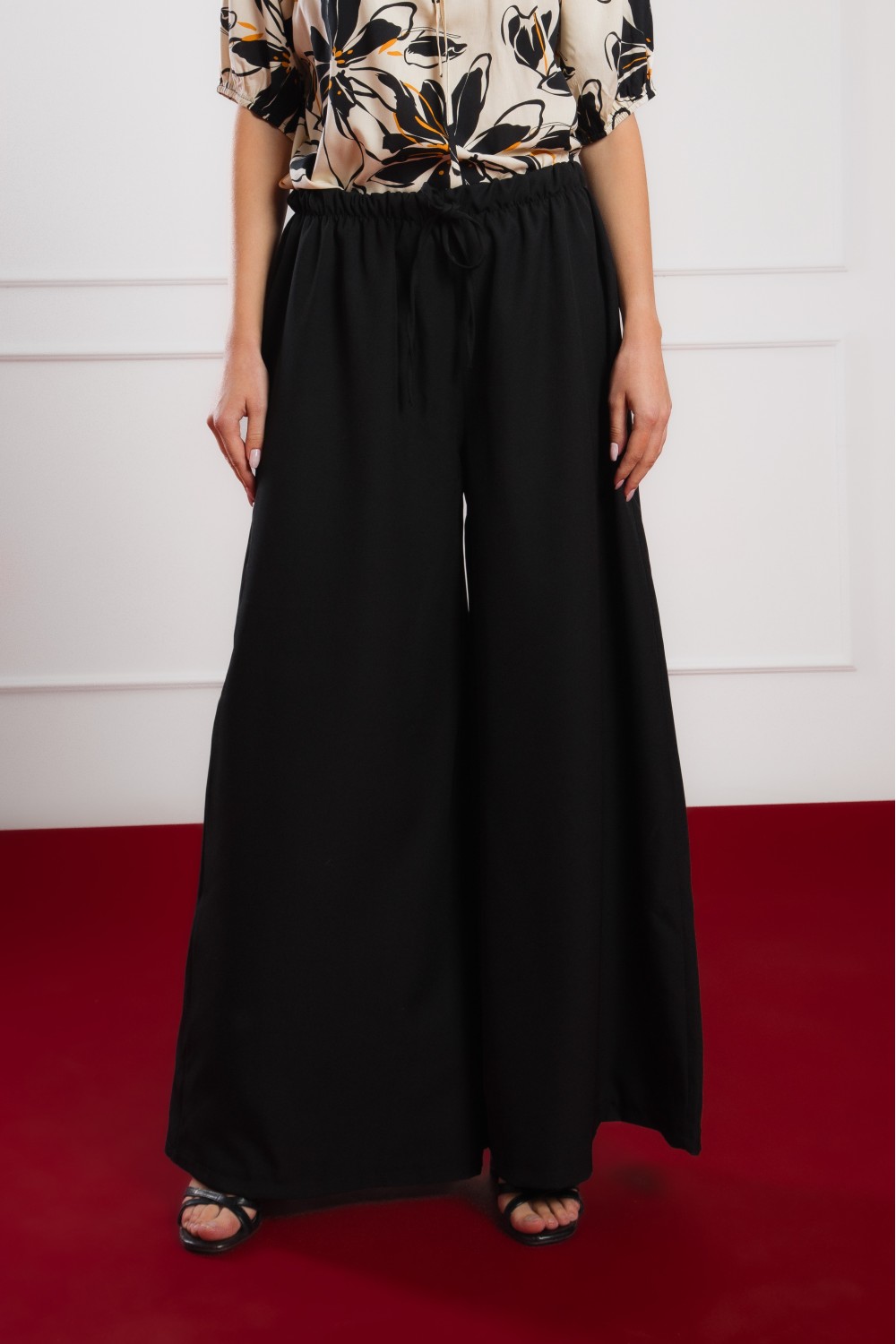 Elegantne crne hlače širokog kroja s elastičnim strukom i vezicom za dodatnu prilagodbu. Lagano padaju uz tijelo i stvaraju profinjenu, izduženu siluetu, dok mekani materijal osigurava udobn..
