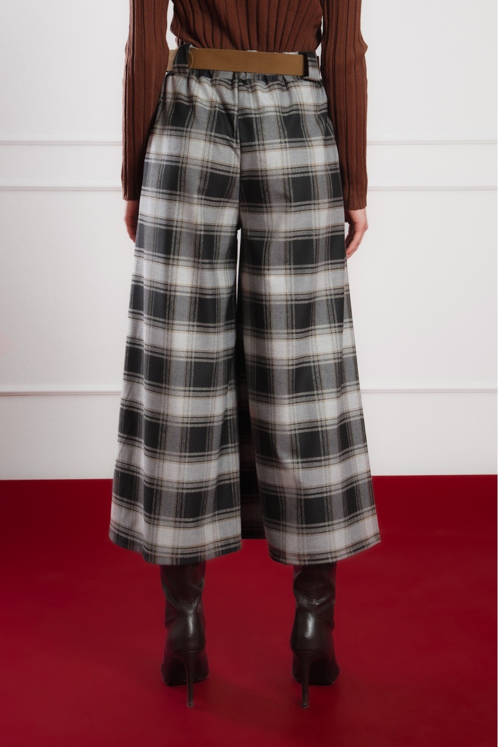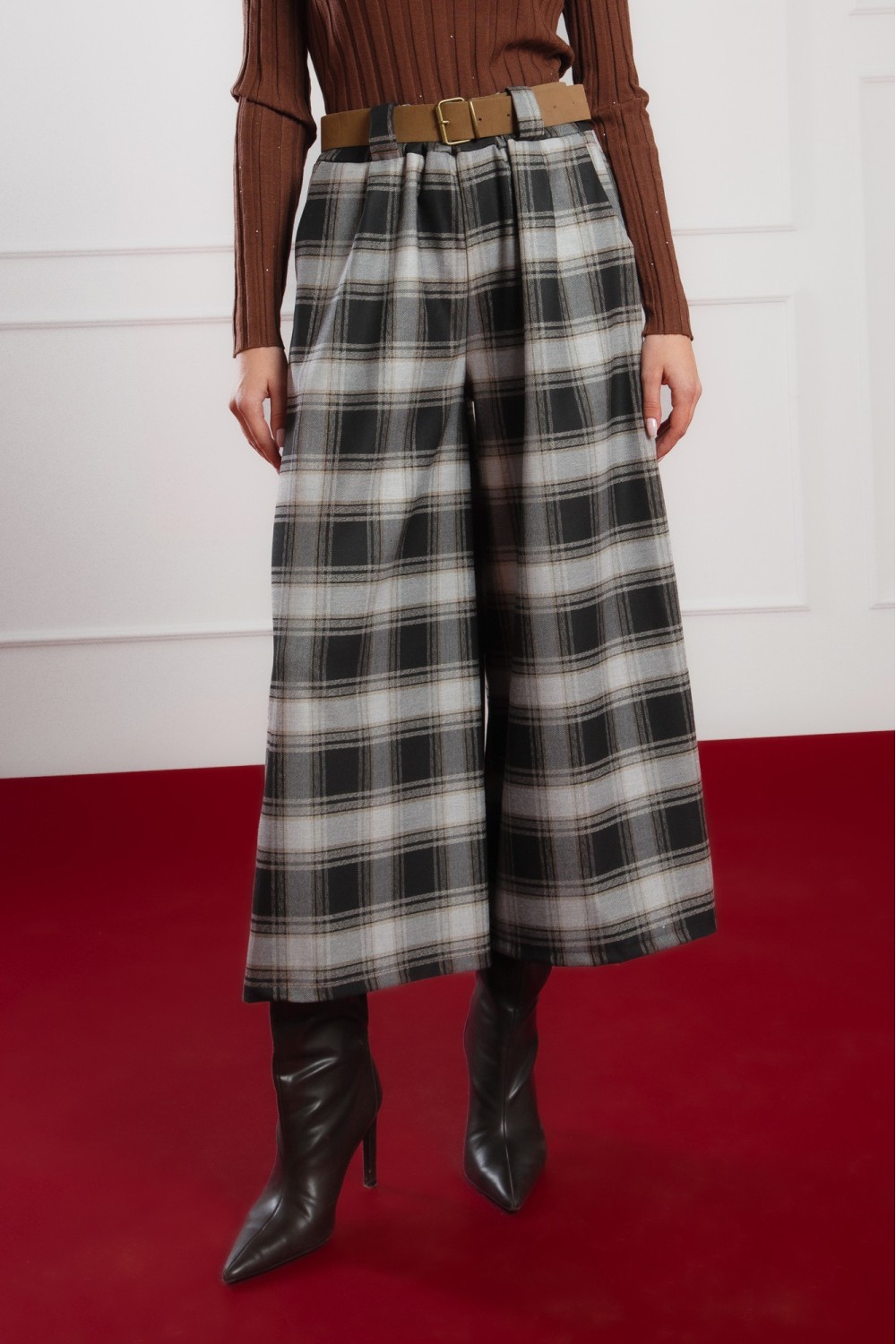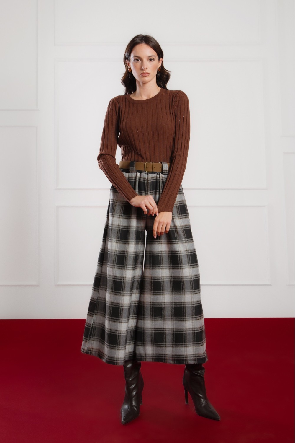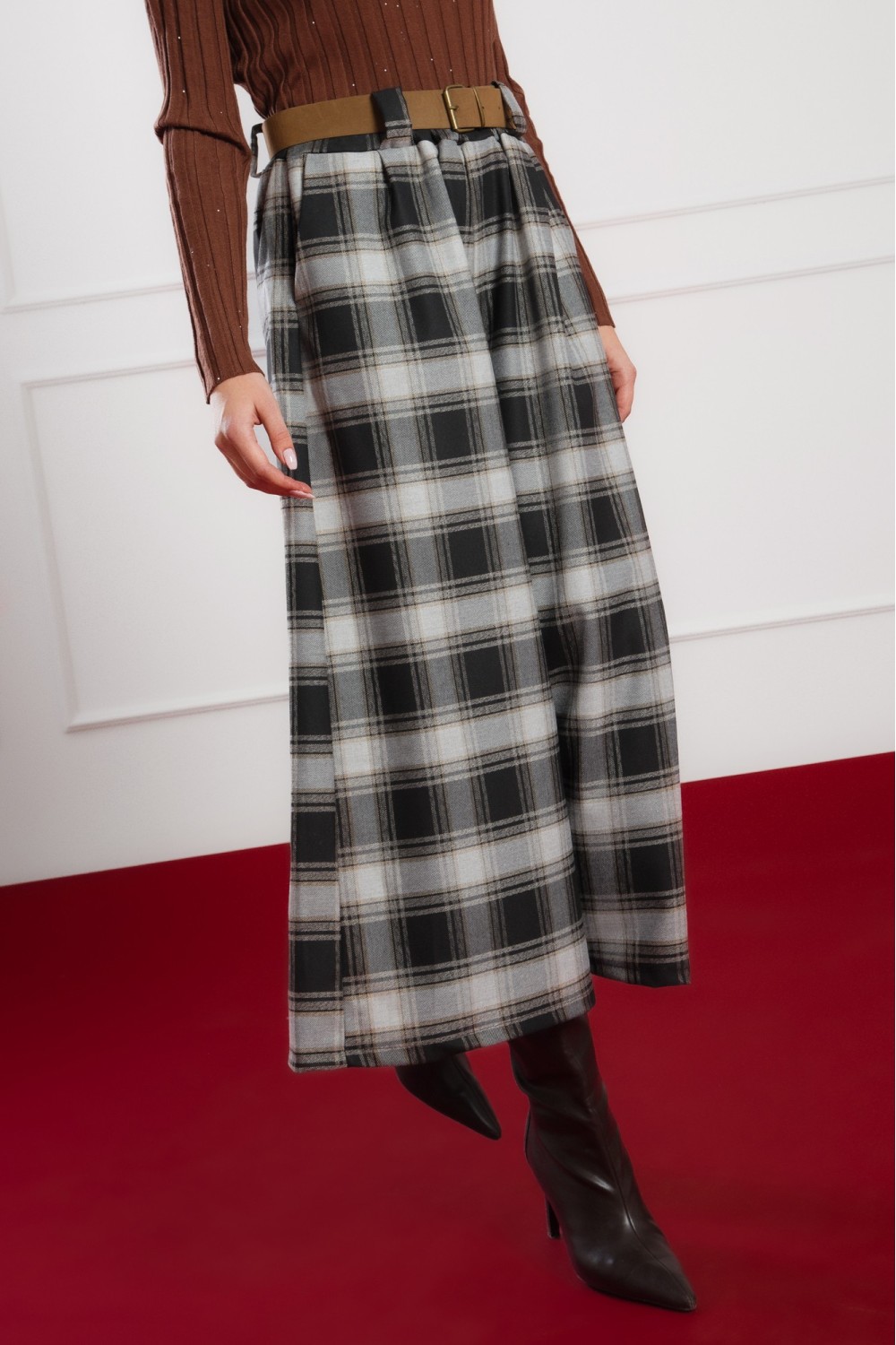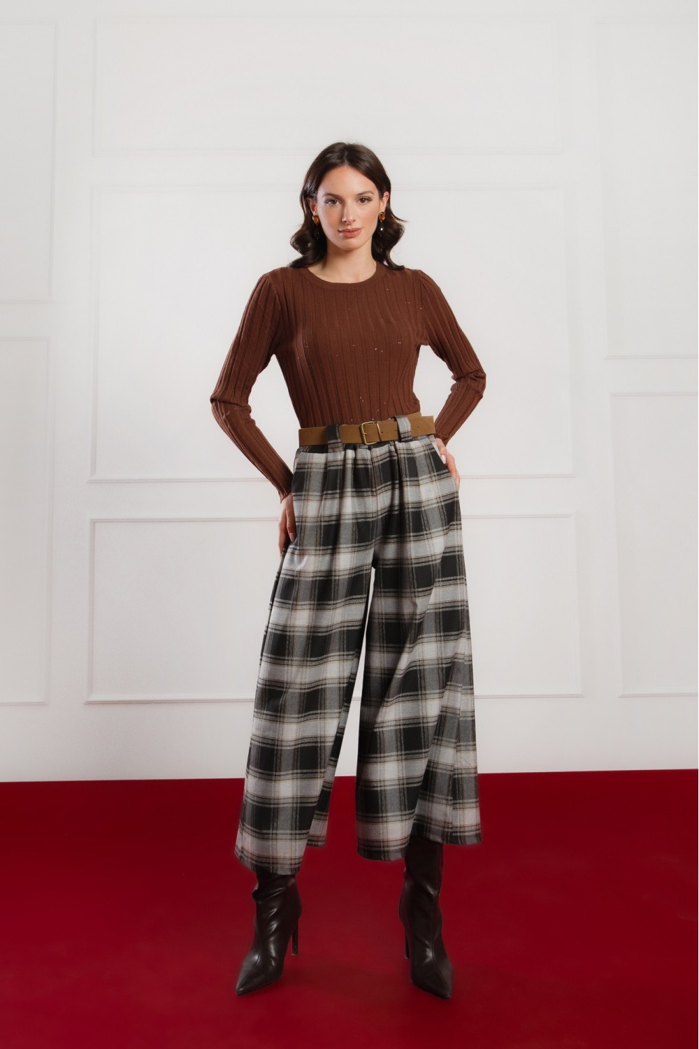 Elegantna karirana haljina dugih rukava savršen je izbor za jesen i zimu. Klasičan uzorak u toplim tonovima i pojas u struku naglašavaju ženstvenu siluetu, dok mekani materijal pruža udobnos..