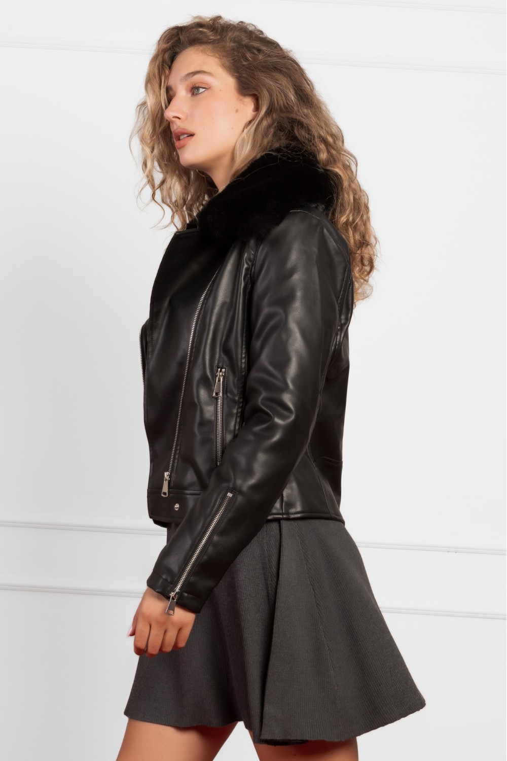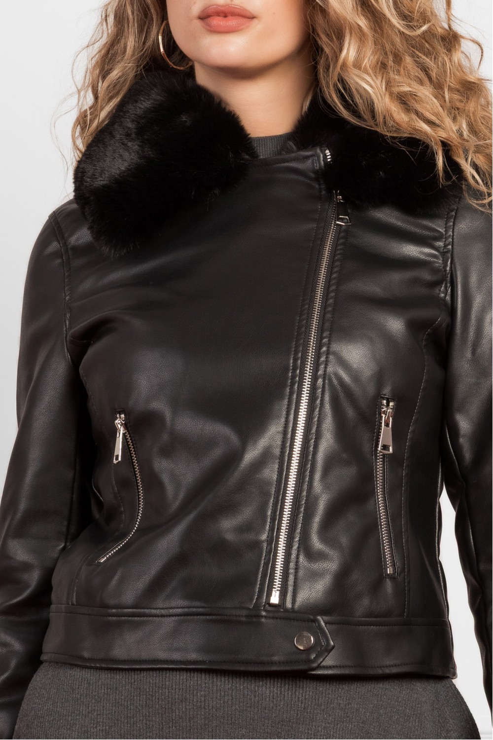 Ženska crna kožna jakna s krznom – bezvremenski klasik u modernom izdanju. Luksuzni detalj krznenog ovratnika daje toplinu i dozu glamura, dok asimetričan zatvarač i metalni zipovi naglašavaju moderan, urbano-rock stil. Idealna za jesenske i zimske outfite – nosiva uz traperice i čizme za casual kombinaciju ili preko haljine za večernji izlazak. Model je visok 175 cm i nosi veličinu V36. SASTAV:50% Poliuretan 50% Poliester..