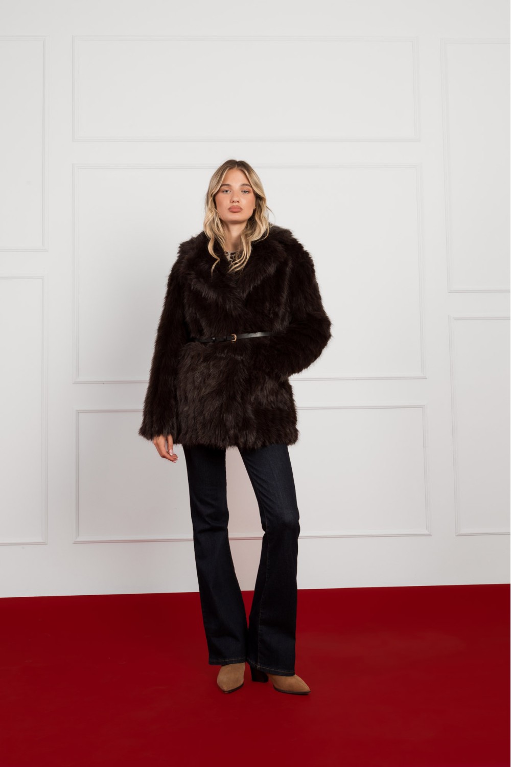 7. Tamno smeđa duža bunda od umjetnog krzna s remenom