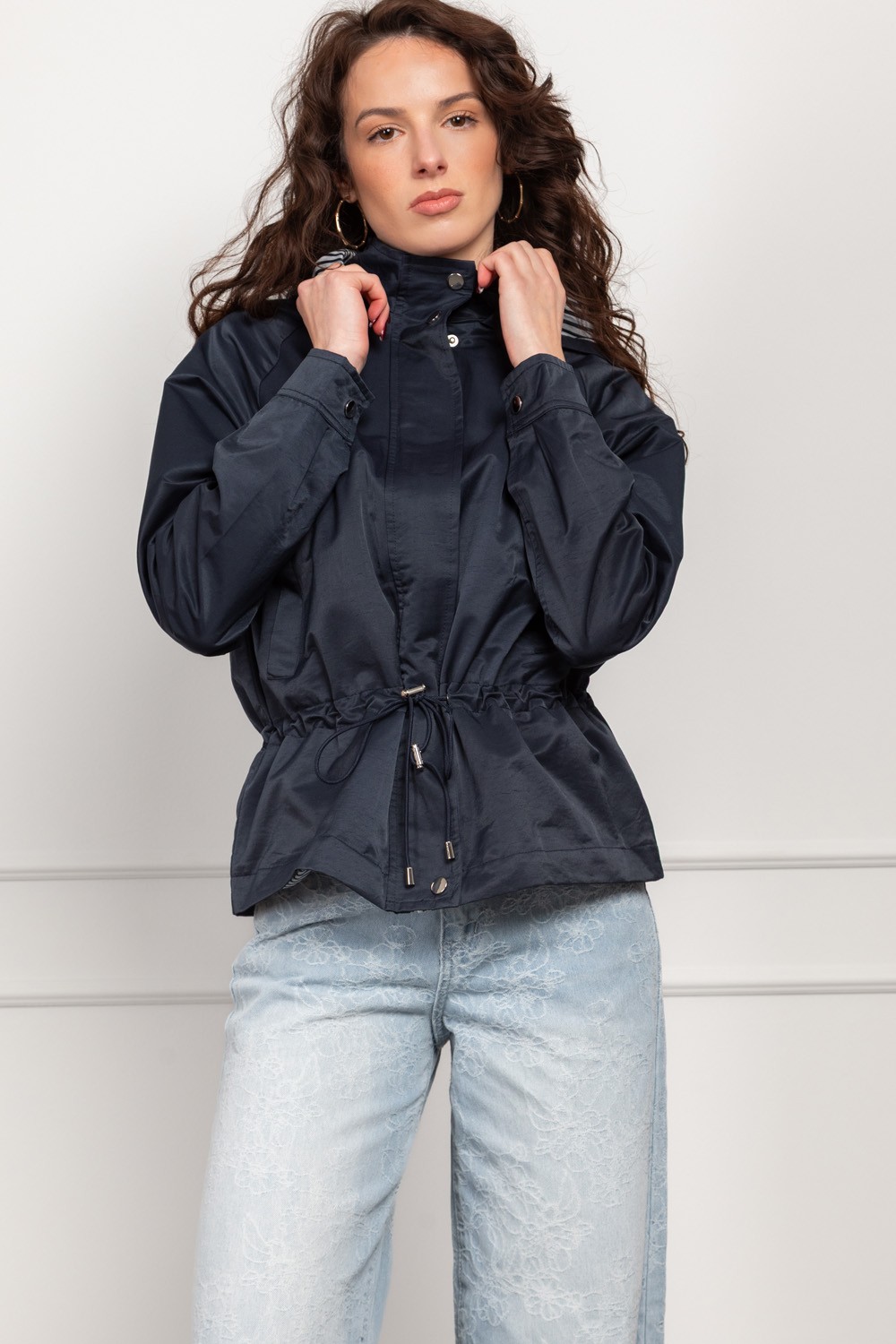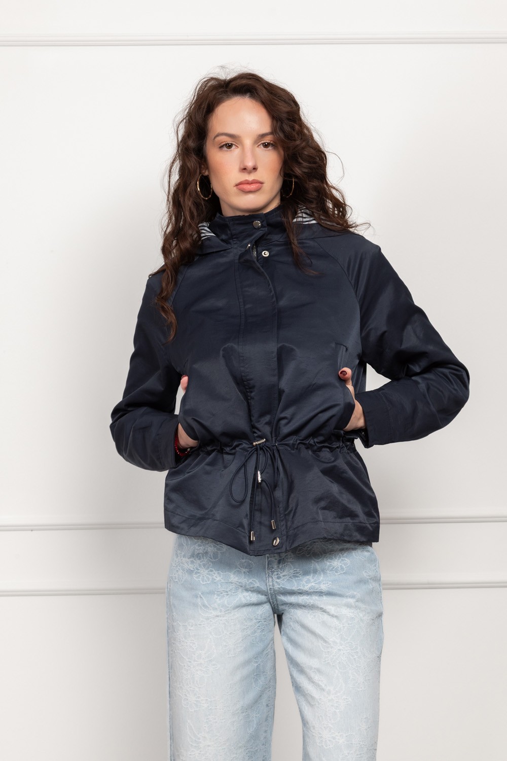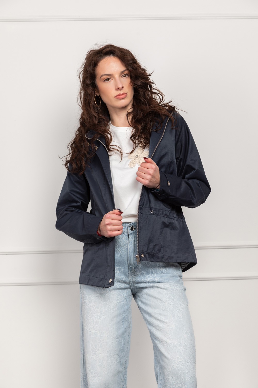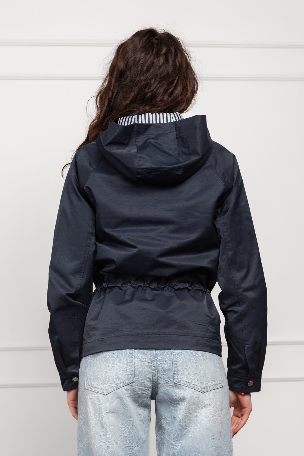 Tamno plava kratka jakna s kapuljačom i tankom podstavom. Idealna za prijelazne mjesece i nepredvidive dane kada želiš komad koji je lagan, praktičan i dovoljno stylish da nije “sportska” a ipak daje osjećaj zaštite od vjetra i lagane kiše. Jako dobra nijansa koja pristaje uz denim i neutralne tonove.