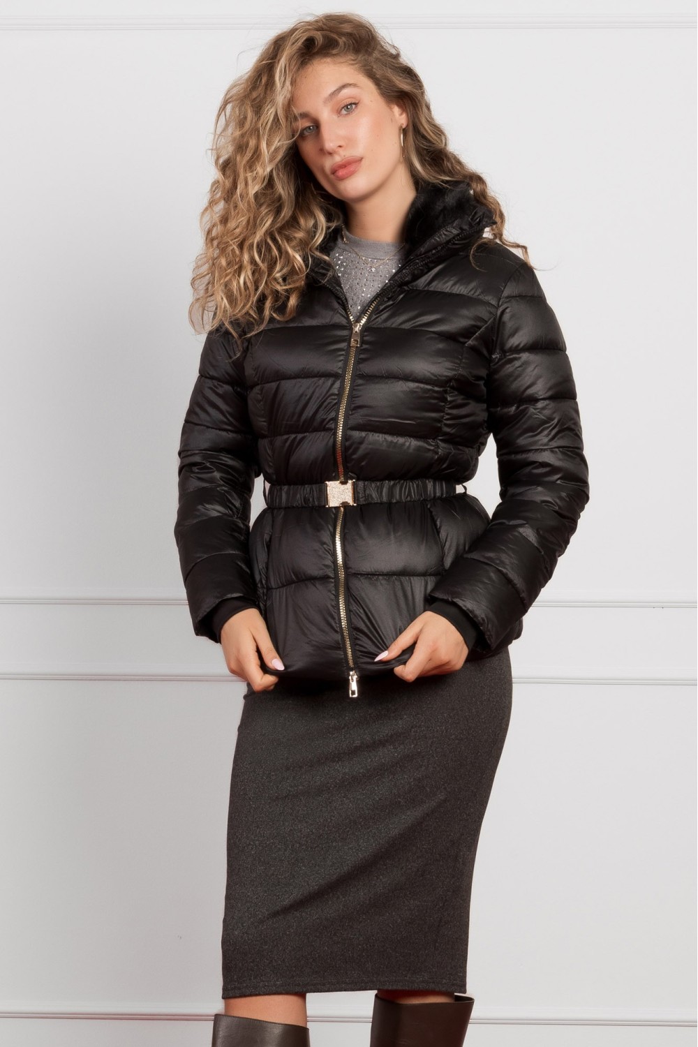 Elegantna ženska zimska jakna u tamno plavoj boji, savršena za hladne zimske dane. Jakna ima toplu kapuljaču s bogatim umjetnim krznom koje pruža dodatnu zaštitu od vjetra i hladnoće. Struk ..