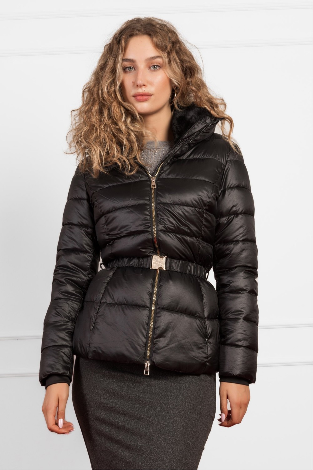 Topla i praktična ženska zimska jakna u crnoj boji, idealna za hladne dane. Jakna dolazi s atraktivnom kapuljačom ukrašenom umjetnim krznom koje pruža dodatnu dozu elegancije i topline. Kopč..