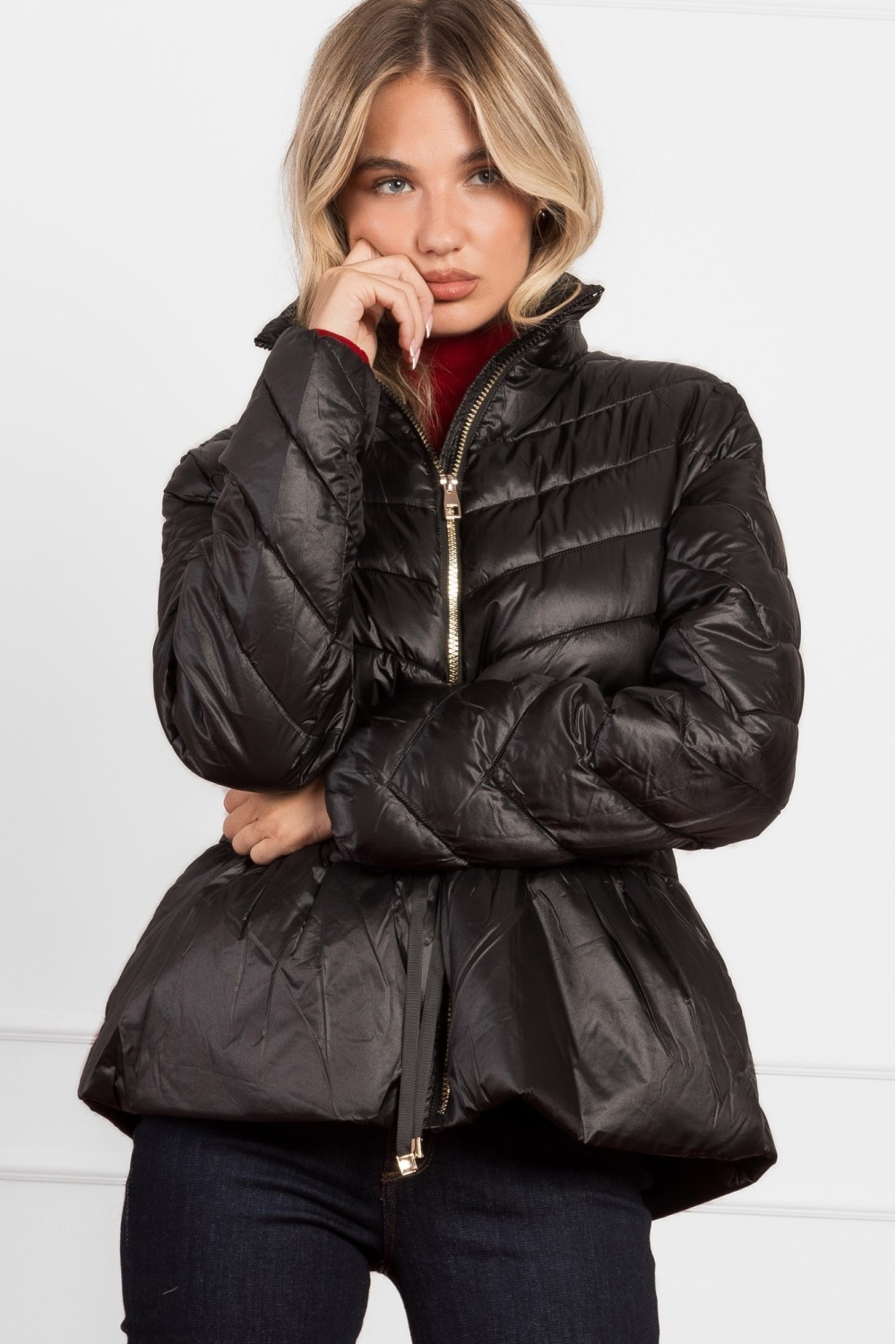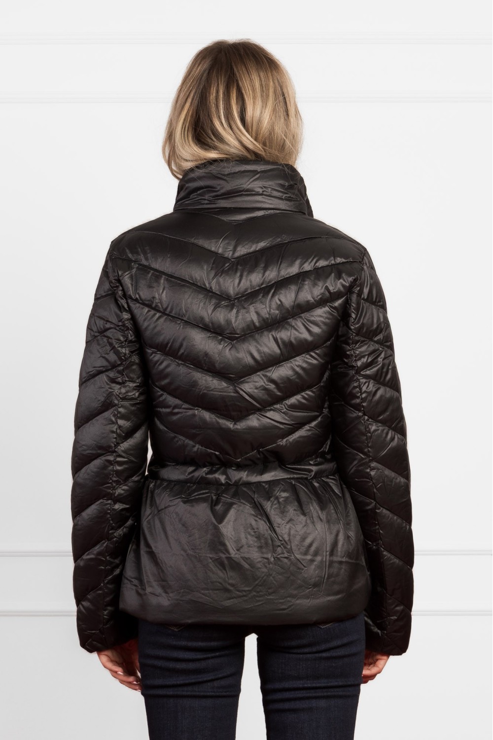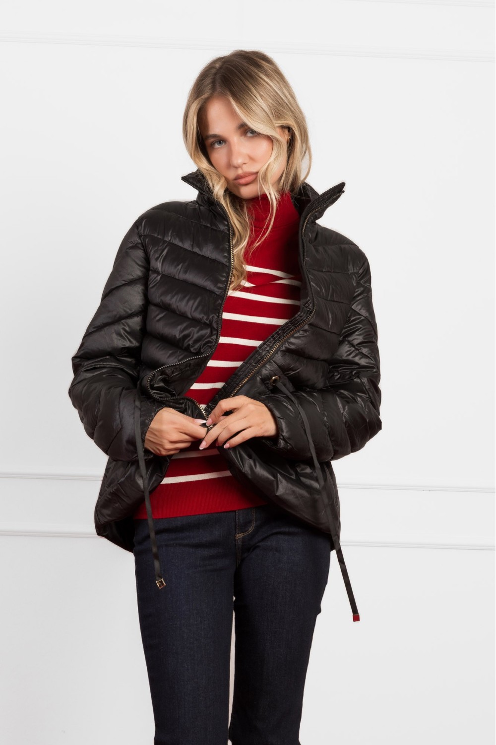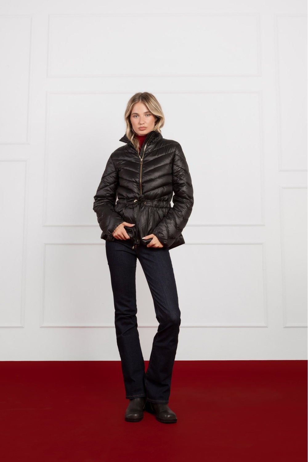 Kratka zimska punjena jakna s kapuljačom i krznom. Krzno se može skinuti.Kopčanje sprijeda patent zatvaračem i remenom u struku s kopčom. Sprijda depovi s patent zatvaračima. Elastičan unuta..