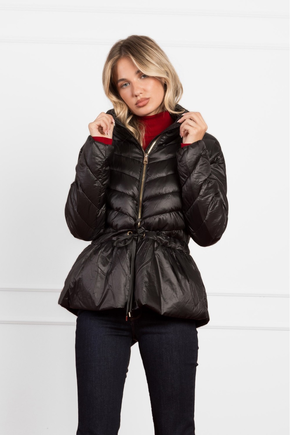 Kratka zimska punjena jakna s kapuljačom i krznom. Krzno se može skinuti. Kopčanje sprijeda patent zatvaračem i remenom u struku s kopčom. Džepovi s patent zatvaračima. Rukovi na rubovima s ..